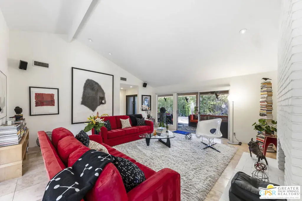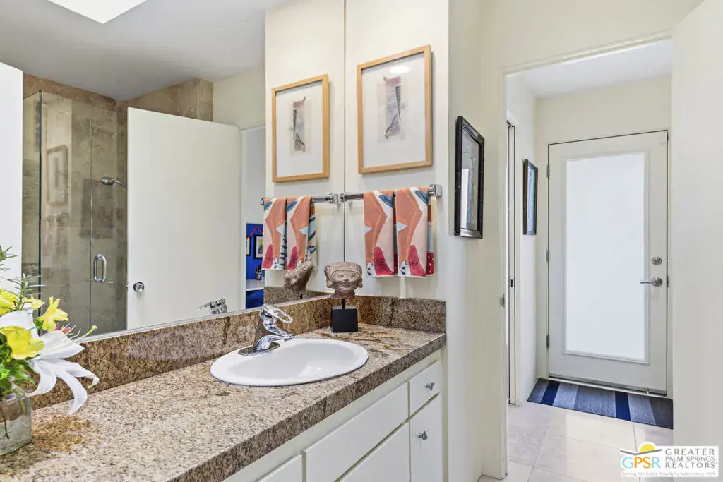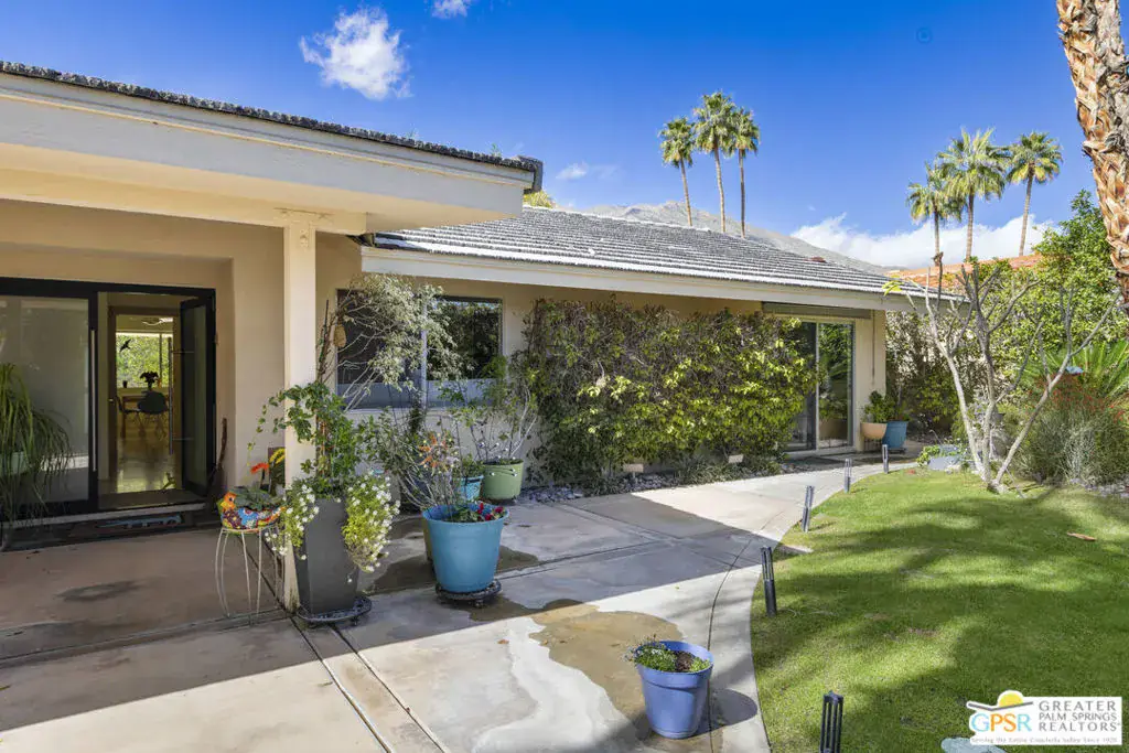 Wonderful, bright 3 bedroom, 2 bath with many mid-century features and lots of charm and character. This home is located in the very desirable neighborhood of Indian Canyons in South Palm Springs. The extra large lot is surrounded by block wall and shrubbery, creating a private utopia. Once in the colorful green pedestrian gate, you enter into the enclosed front yard, which is a perfect combination of desert landscaping and grass, boasting layers of rock, fauna and trees. To the left of the front entry door note the slider that leads from the living room area onto to a covered front patio, which currently serves as an outdoor living room. Next, step through the full view, solid glass front door into the entry area and hallway. The living room features many mid-century vibes, including a cathedral, beamed ceiling, and a partial slump stone brick wall surrounding the fireplace, which sits almost at floor level and walls of glass. Off the living room and towards the back of the house, is a bonus sitting area. The gourmet kitchen has stainless appliances and granite countertops, and a dining area. There is a pantry cabinet and utility closet in the the kitchen area as well. The kitchen sink looks out onto the backyard, pool area and majestic mountain views. Just off the kitchen is an office nook with a freestanding desk and cabinets. The Primary suite has a spacious custom built closet with direct access to the pool area. One of the 2 guest rooms has a custom built walk-in closet with direct access to the front yard and garden. The other guest room, also with a custom built closet, is currently being used as a den/office. Both baths feature custom glass, walk-in tiled shower surrounds and granite counters, and Toto toilets. Bedroom floors are carpeted, other areas are tiled with splendid, timeless Travertine. The pool area embraces all the Palm Springs living is supposed to be. A large, saltwater pool with steps down into the water, and a spa. Just like a resort, privacy abounds. There is also a large, covered patio. And gorgeous views! The Solar system is owned. All areas, inside and out, feature upgraded lighting.