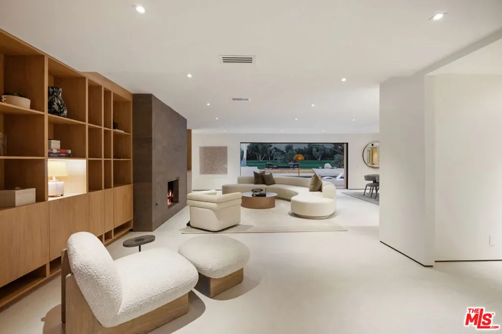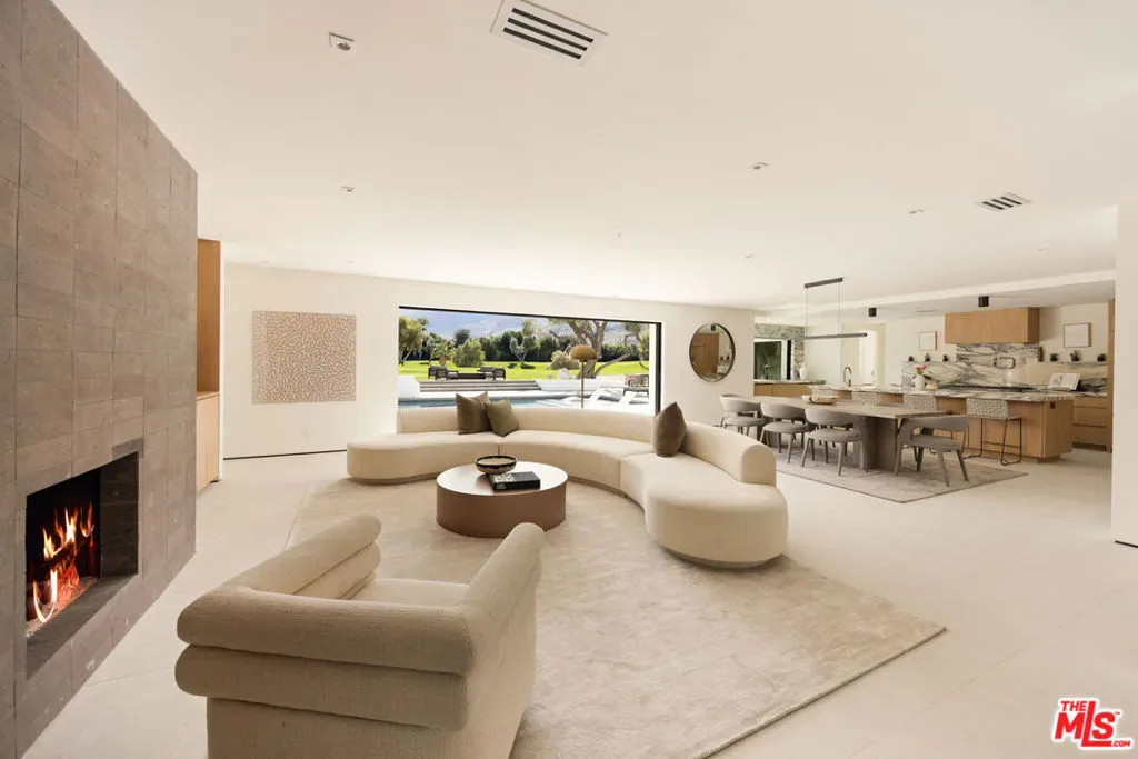 Located within the coveted Indian Canyons enclave of Palm Springs, this newly reimagined residence occupies an exceptional golf course setting with sweeping views of the San Jacinto Mountains. Reconstructed through a comprehensive 12-month renovation, the four-bedroom, four-bath home showcases a refined material palette of warm natural elements and pocketing glass walls that seamlessly extend the light-filled living spaces into the surrounding desert landscape. A dramatic glass pivot entry opens to a main living area anchored by a striking volcanic stone fireplace, complemented by solid oak doors, custom oak cabinetry, and skylights that infuse the space with an inviting ambient glow. The home’s culinary centerpiece is a chef’s kitchen appointed with a full Dacor appliance suite, including a 48-inch professional range, dual dishwashers, and integrated Sub-Zero refrigeration and ice maker. Distinctive marble and rare quartzite surfaces lend an elevated aesthetic, while a walk-in pantry elevates both function and presentation. Spa-inspired bathrooms feature indoor succulent garden shower elements. An entertaining bar finished in rare, striking marble incorporates built-in wine refrigeration, serving as a visual focal point within the main living areas. Each of the two primary suites features spacious custom walk-in closets, while subtle under-cabinet and wardrobe illumination creates a warm, inviting ambiance throughout. Outdoor living is thoughtfully designed for entertaining, with a secured front-yard approach transitioning to a backyard that opens directly to the golf course for uninterrupted fairway and mountain views. Mature palm and olive trees frame multiple lounge and fire-feature areas, enhanced by dramatic evening landscape lighting. The resort-style pool features a dive-worthy deep end, expansive sun shelf, and an elevated spa with cascading waterfall. Indian Canyons remains one of Palm Springs’ most coveted residential enclaves, prized for its expansive golf course vistas, architectural pedigree, and peaceful atmosphere at the base of the San Jacinto Mountains. Life here is centered around the outdoors- morning walks beneath towering palms, quick access to the Coachella Valley’s most celebrated hiking trails, and effortless bike rides into downtown Palm Springs for dining, galleries, and nightlife. Anchoring the neighborhood is the renowned Indian Canyons Golf Resort, widely considered one of the most beautiful and iconic golf settings in the city.