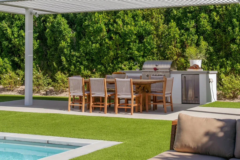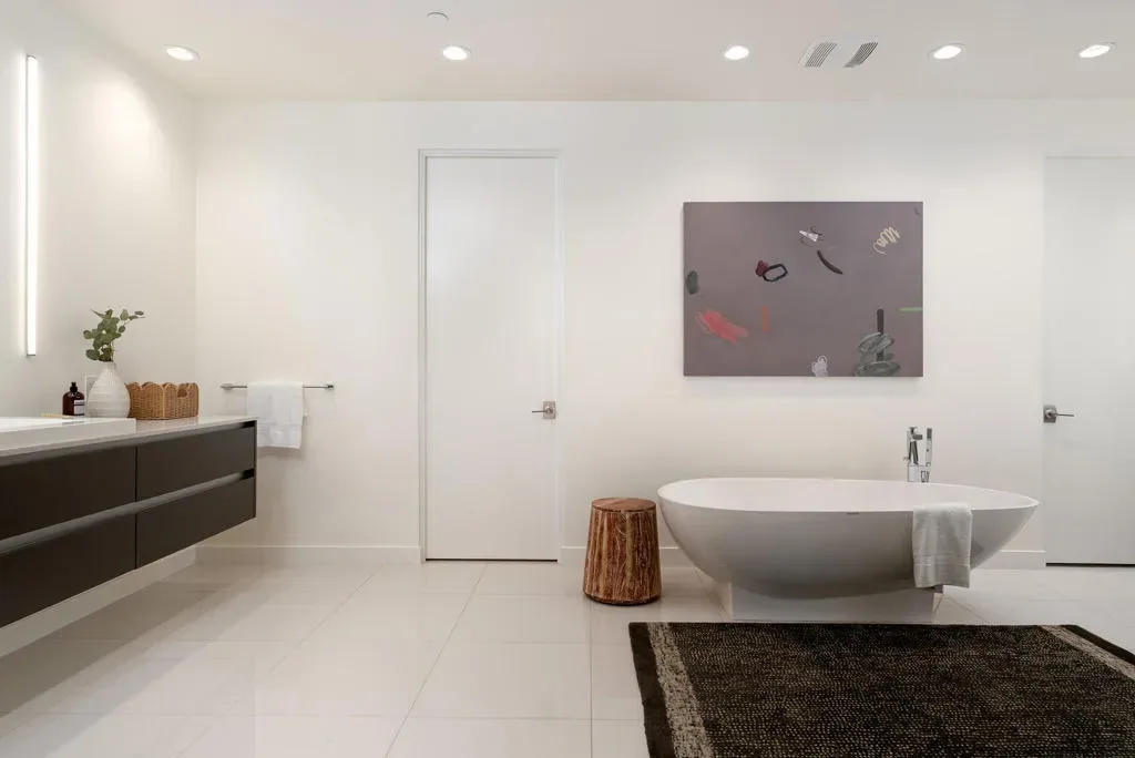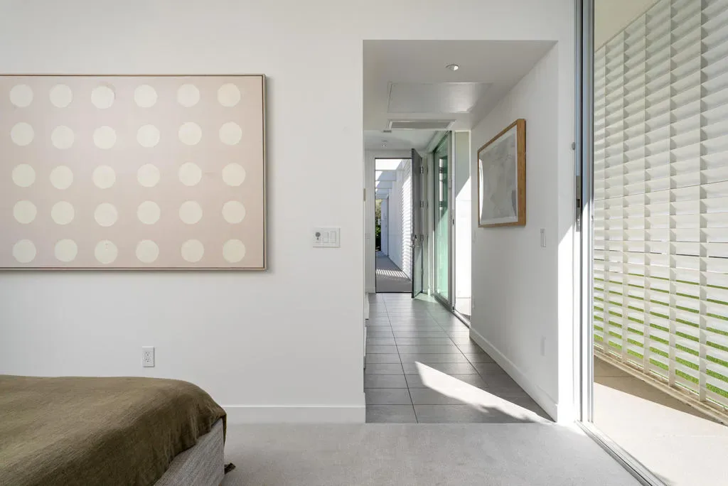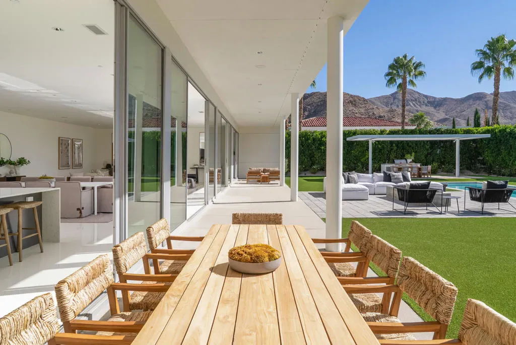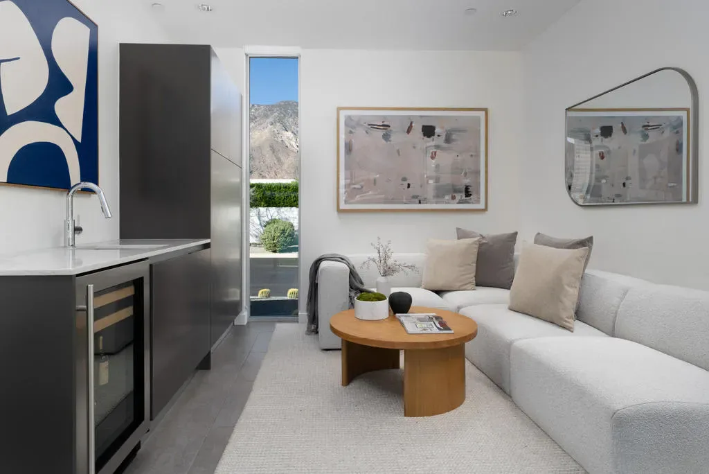 Rare offering within LINEA, a private gated community of only 14 homes in south Palm Springs. 3088 Linea Terrace features minimalist architecture with an artist’s attention to visual rhythm, massing and scale. Anchored by a 90-foot expanse of oversized Fleetwood glass sliders facing a 60-foot lap pool, the proportions are grand and harmonious. Linea is an exceptional neighborhood – 14 all white modern homes sited for maximum privacy. 3088 Linea Terrace has perhaps the best street presence – elevated lot, stunning colonnade — and features the award-winning G floor plan. The soul of this home is its simplicity. The design is clean and bold, the spaces expansive, the landscape low-maintenance. The setting in Andreas Hills is epic, just minutes from central Palm Springs, nestled between mountains on all sides. Four bedrooms and five baths. The main house features the primary suite and two well-separated guest suites, as well as a dedicated media room. The attached one-bedroom casita has its own street entrance. Linea has its own private gate but the HOAs are very low, and you own the land. Three-car garage, fully owned solar, pergola with outdoor kitchen (including wet bar, grill and refrigerator), outdoor shower, covered patio with misters, enormous steam shower in primary. Built for entertainment or your fortress of solitude, minutes from downtown Palm Springs and all its amenities.