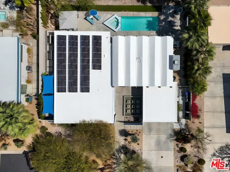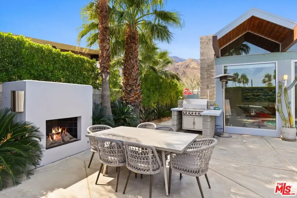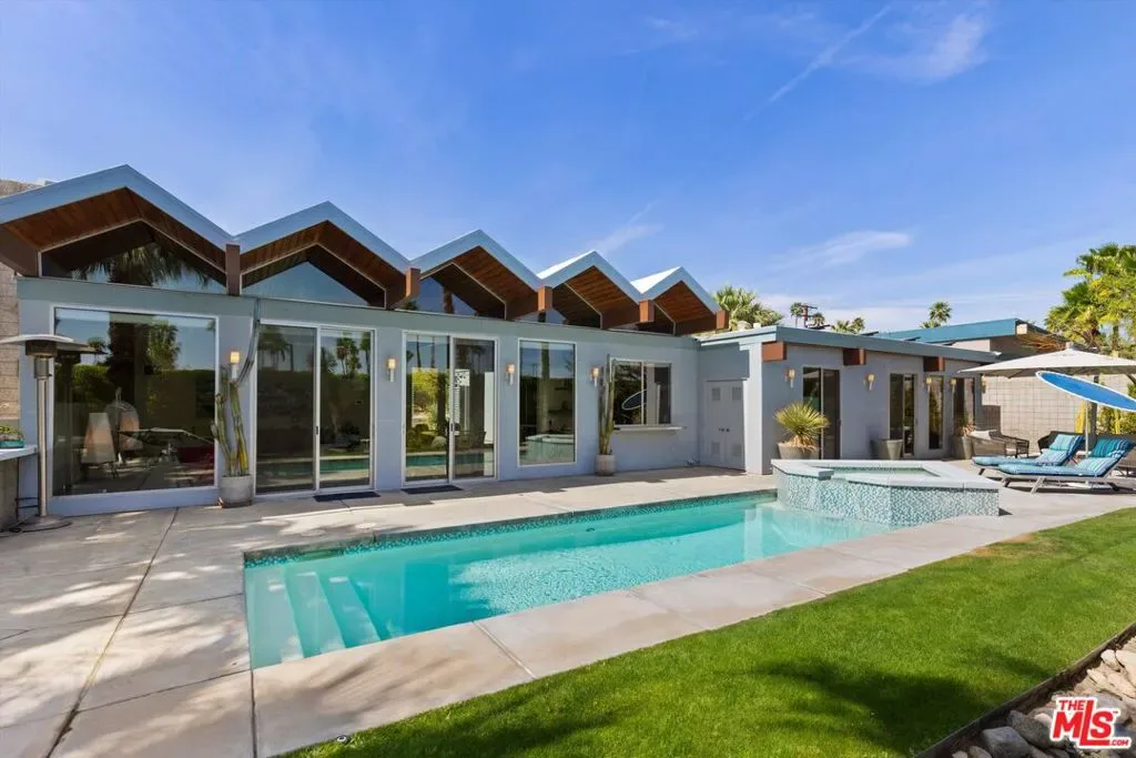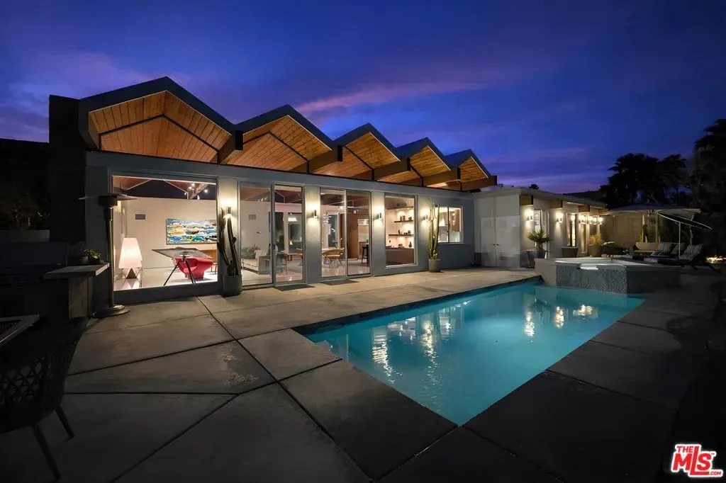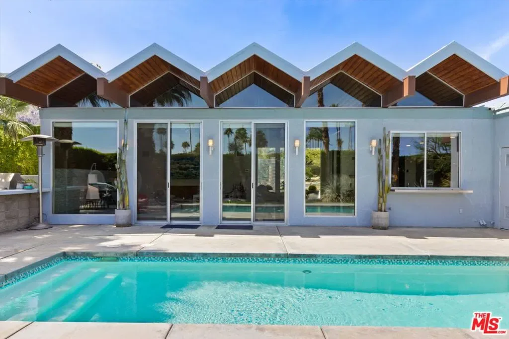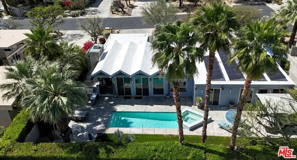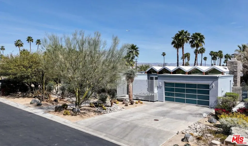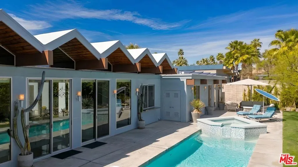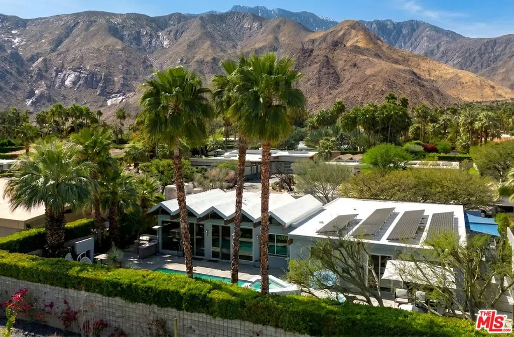 (Also included is a flexible BONUS room ideal as a gym, office, or optional 4th bedroom.) Set within an intimate enclave of just six architecturally cohesive residences, this striking home captures the essence of Palm Springs modernism. Its sculptural folded-plate roofline draws inspiration from the iconic design language attributed to Palmer & Krisel, where geometry, light, and landscape exist in perfect balance. From the moment you arrive, the experience is intentional. A private front courtyard, anchored by a linear water feature and framed by curated desert plantings, creates a sense of calm and quiet sophistication. It is both architectural and meditative, offering a compelling preview of the design narrative that unfolds within. Step through the glass entry and the home immediately opens upward and outward. Soaring wood-plank ceilings span overhead, intersected by clerestory windows that draw in soft desert light throughout the day. Walls of glass dissolve the boundary between indoors and out, allowing the surrounding landscape and mountain backdrop to become part of the living experience. The main living area is expansive yet grounded, designed for connection while maintaining a refined sense of scale and proportion. Poured terrazzo floors reflect light beautifully, adding texture and authenticity while anchoring the space in timeless mid-century materiality. The open layout allows the living, dining, and kitchen areas to flow effortlessly together, creating a cohesive experience throughout the home. At the heart of the residence, the kitchen balances warmth and precision. Custom cabinetry, generous prep surfaces, and a central island create a space equally suited for quiet mornings or elevated entertaining. Sightlines extend through the home to the outdoors, reinforcing the seamless integration of interior and exterior living. The primary suite offers a private retreat that feels both serene and connected. A spa-inspired bath features a striking walk-in shower with custom tilework and direct outdoor access, creating a distinctly Palm Springs indoor-outdoor bathing experience. Two additional guest bedrooms are thoughtfully positioned for privacy, while a flexible bonus room adapts effortlessly as a fourth bedroom, office, or dedicated fitness space. Outside, the backyard unfolds as a true private resort. The pool and spa are framed by clean architectural lines and mature landscaping, while multiple seating and dining areas invite both relaxation and entertaining. A built-in BBQ and outdoor fireplace create an ideal setting for evenings under the desert sky, where the mountains slowly transform into dramatic silhouettes as day gives way to night. Modern efficiency is seamlessly integrated into the home’s design. An owned solar system with 36 panels producing 11.8 kW is paired with three Tesla Powerwall-3 battery backup systems, offering energy independence, resilience, and long-term sustainability. Situated on FEE LAND (you own it), adds both tangible value and long-term security. Tucked within a serene, private enclave, this residence offers a rare balance of architectural integrity, privacy, and livability, just moments from the best of Palm Springs. This is where architecture becomes atmosphere, and light becomes a living element. Each space is designed not only to be seen, but to be felt, capturing the rhythm of the desert and the effortless elegance of Palm Springs living at its most refined.