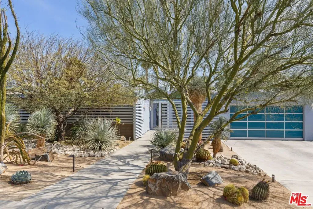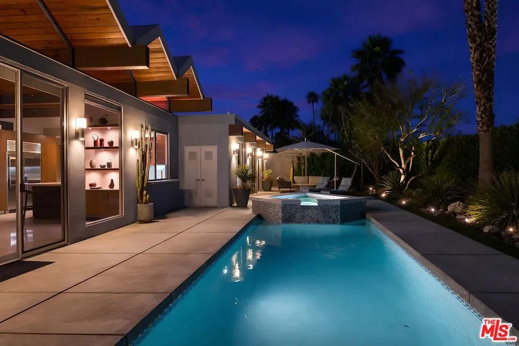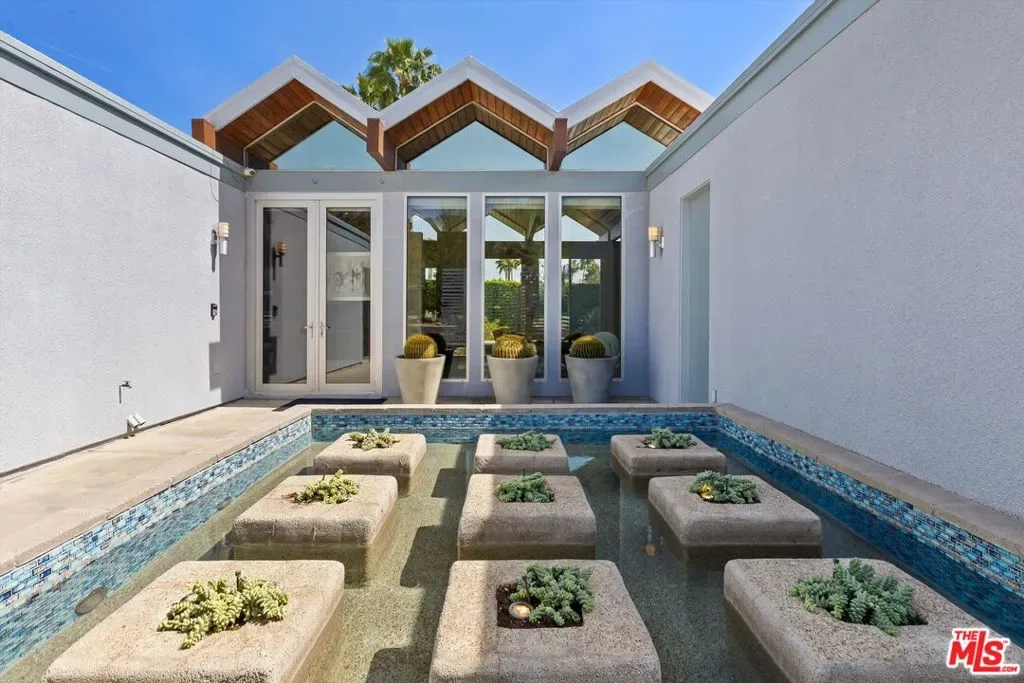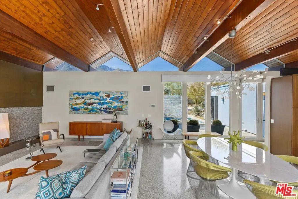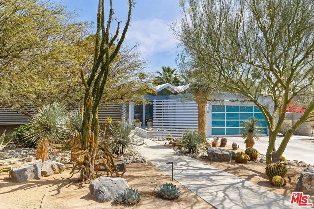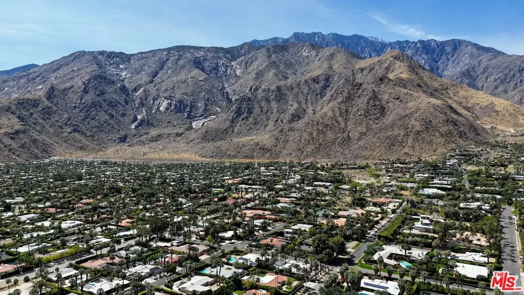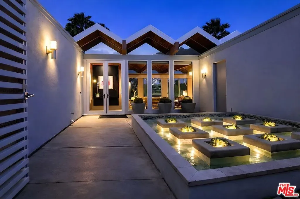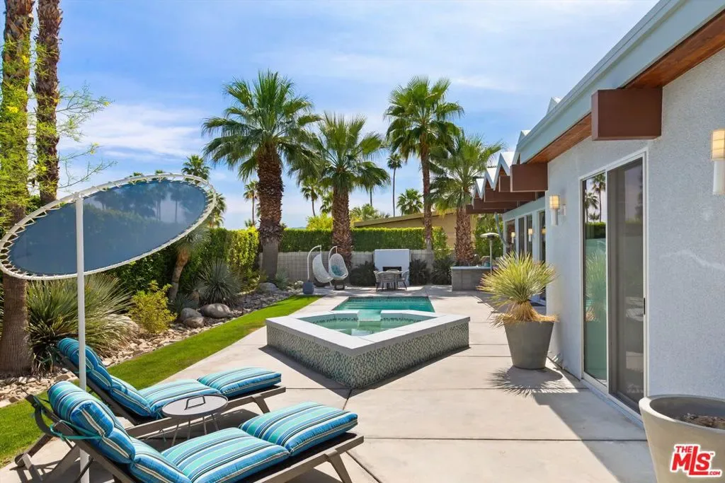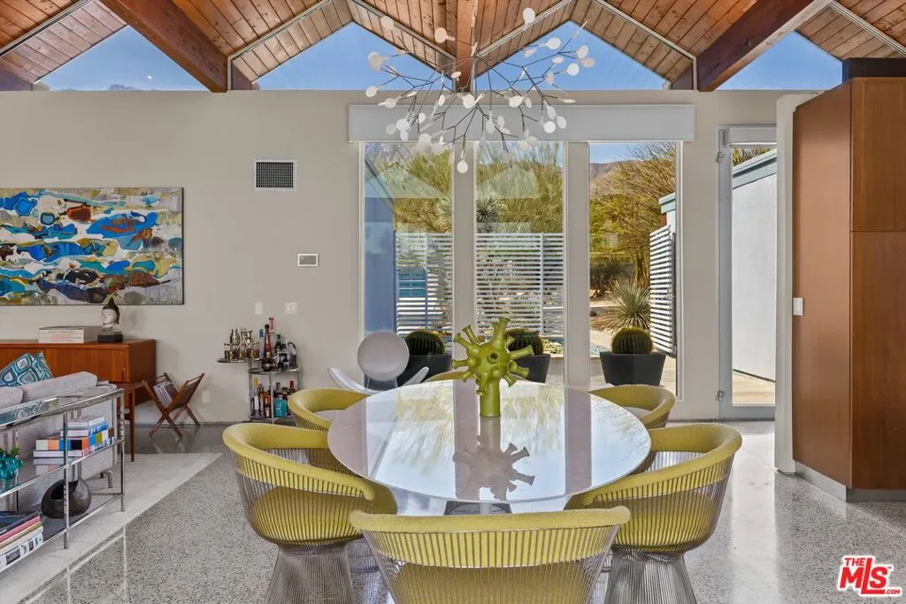 (Also included is a flexible BONUS room ideal as a gym, office, or optional 4th bedroom.) Set within an intimate enclave of just six architecturally cohesive residences, this striking home captures the essence of Palm Springs modernism. Its sculptural folded-plate roofline draws inspiration from the iconic design language attributed to Palmer & Krisel, where geometry, light, and landscape exist in perfect balance. From the moment you arrive, the experience is intentional. A private front courtyard, anchored by a linear water feature and framed by curated desert plantings, creates a sense of calm and quiet sophistication. It is both architectural and meditative, offering a compelling preview of the design narrative that unfolds within. Step through the glass entry and the home immediately opens upward and outward. Soaring wood-plank ceilings span overhead, intersected by clerestory windows that draw in soft desert light throughout the day. Walls of glass dissolve the boundary between indoors and out, allowing the surrounding landscape and mountain backdrop to become part of the living experience. The main living area is expansive yet grounded, designed for connection while maintaining a refined sense of scale and proportion. Poured terrazzo floors reflect light beautifully, adding texture and authenticity while anchoring the space in timeless mid-century materiality. The open layout allows the living, dining, and kitchen areas to flow effortlessly together, creating a cohesive experience throughout the home. At the heart of the residence, the kitchen balances warmth and precision. Custom cabinetry, generous prep surfaces, and a central island create a space equally suited for quiet mornings or elevated entertaining. Sightlines extend through the home to the outdoors, reinforcing the seamless integration of interior and exterior living. The primary suite offers a private retreat that feels both serene and connected. A spa-inspired bath features a striking walk-in shower with custom tilework and direct outdoor access, creating a distinctly Palm Springs indoor-outdoor bathing experience. Two additional guest bedrooms are thoughtfully positioned for privacy, while a flexible bonus room adapts effortlessly as a fourth bedroom, office, or dedicated fitness space. Outside, the backyard unfolds as a true private resort. The pool and spa are framed by clean architectural lines and mature landscaping, while multiple seating and dining areas invite both relaxation and entertaining. A built-in BBQ and outdoor fireplace create an ideal setting for evenings under the desert sky, where the mountains slowly transform into dramatic silhouettes as day gives way to night. Modern efficiency is seamlessly integrated into the home’s design. An owned solar system with 36 panels producing 11.8 kW is paired with three Tesla Powerwall-3 battery backup systems, offering energy independence, resilience, and long-term sustainability. Situated on FEE LAND (you own it), adds both tangible value and long-term security. Tucked within a serene, private enclave, this residence offers a rare balance of architectural integrity, privacy, and livability, just moments from the best of Palm Springs. This is where architecture becomes atmosphere, and light becomes a living element. Each space is designed not only to be seen, but to be felt, capturing the rhythm of the desert and the effortless elegance of Palm Springs living at its most refined.