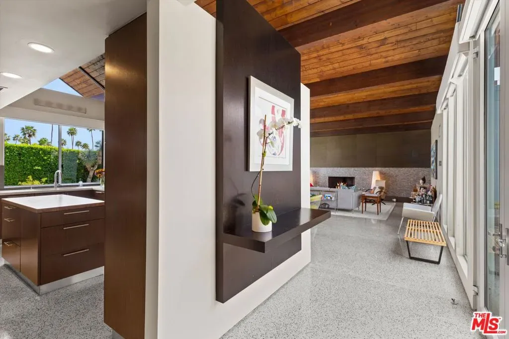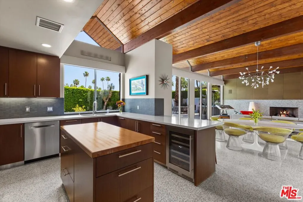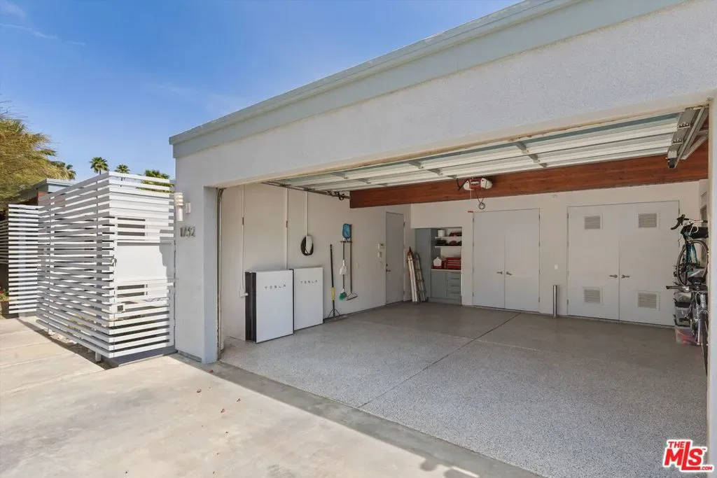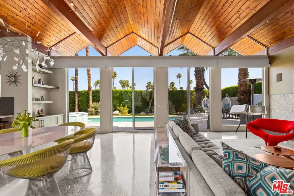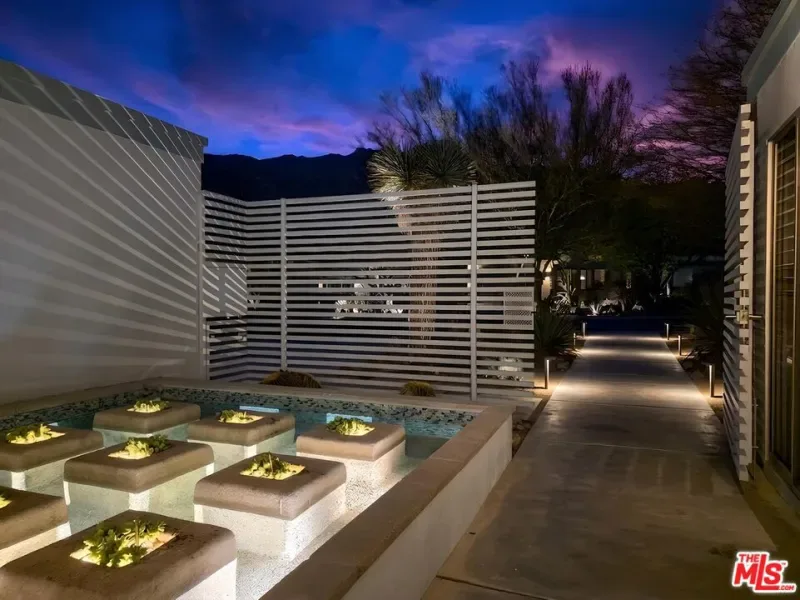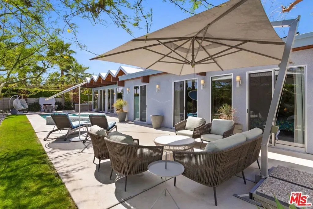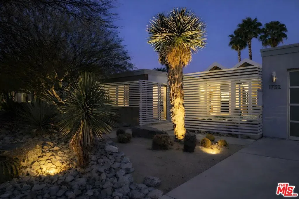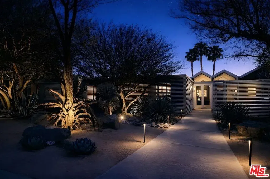(Also included is a flexible BONUS room ideal as a gym, office, or optional 4th bedroom.) Set within an intimate enclave of just six architecturally cohesive residences, this striking home captures the essence of Palm Springs modernism. Its sculptural folded-plate roofline draws inspiration from the iconic design language attributed to Palmer & Krisel, where geometry, light, and landscape exist in perfect balance. From the moment you arrive, the experience is intentional. A private front courtyard, anchored by a linear water feature and framed by curated desert plantings, creates a sense of calm and quiet sophistication. It is both architectural and meditative, offering a compelling preview of the design narrative that unfolds within. Step through the glass entry and the home immediately opens upward and outward. Soaring wood-plank ceilings span overhead, intersected by clerestory windows that draw in soft desert light throughout the day. Walls of glass dissolve the boundary between indoors and out, allowing the surrounding landscape and mountain backdrop to become part of the living experience. The main living area is expansive yet grounded, designed for connection while maintaining a refined sense of scale and proportion. Poured terrazzo floors reflect light beautifully, adding texture and authenticity while anchoring the space in timeless mid-century materiality. The open layout allows the living, dining, and kitchen areas to flow effortlessly together, creating a cohesive experience throughout the home. At the heart of the residence, the kitchen balances warmth and precision. Custom cabinetry, generous prep surfaces, and a central island create a space equally suited for quiet mornings or elevated entertaining. Sightlines extend through the home to the outdoors, reinforcing the seamless integration of interior and exterior living. The primary suite offers a private retreat that feels both serene and connected. A spa-inspired bath features a striking walk-in shower with custom tilework and direct outdoor access, creating a distinctly Palm Springs indoor-outdoor bathing experience. Two additional guest bedrooms are thoughtfully positioned for privacy, while a flexible bonus room adapts effortlessly as a fourth bedroom, office, or dedicated fitness space. Outside, the backyard unfolds as a true private resort. The pool and spa are framed by clean architectural lines and mature landscaping, while multiple seating and dining areas invite both relaxation and entertaining. A built-in BBQ and outdoor fireplace create an ideal setting for evenings under the desert sky, where the mountains slowly transform into dramatic silhouettes as day gives way to night. Modern efficiency is seamlessly integrated into the home’s design. An owned solar system with 36 panels producing 11.8 kW is paired with three Tesla Powerwall-3 battery backup systems, offering energy independence, resilience, and long-term sustainability. Situated on FEE LAND (you own it), adds both tangible value and long-term security. Tucked within a serene, private enclave, this residence offers a rare balance of architectural integrity, privacy, and livability, just moments from the best of Palm Springs. This is where architecture becomes atmosphere, and light becomes a living element. Each space is designed not only to be seen, but to be felt, capturing the rhythm of the desert and the effortless elegance of Palm Springs living at its most refined.