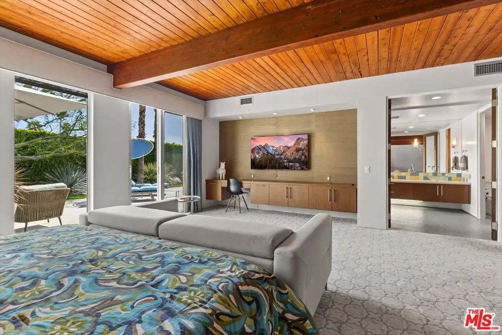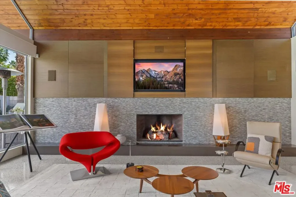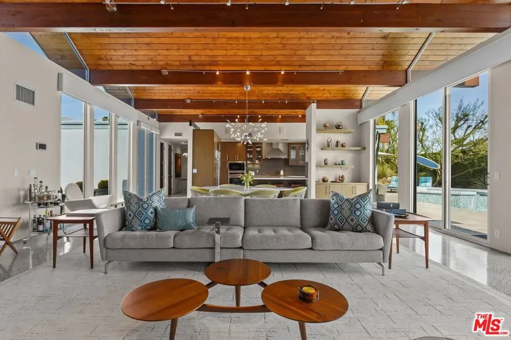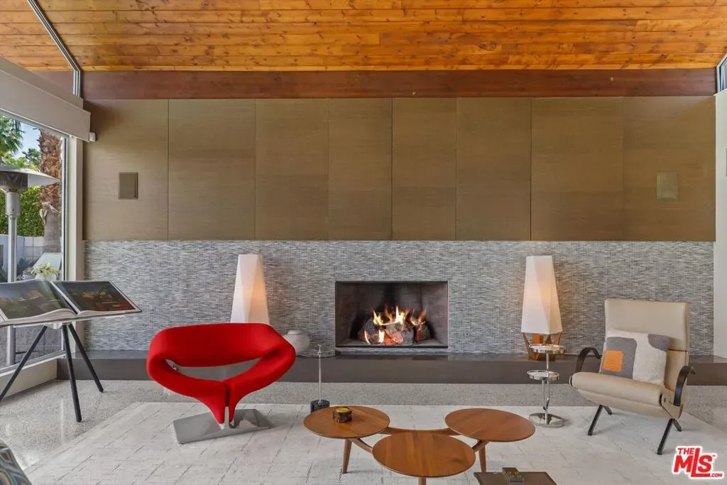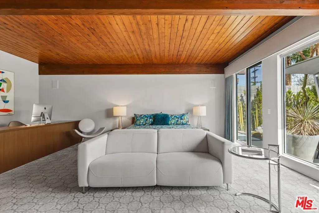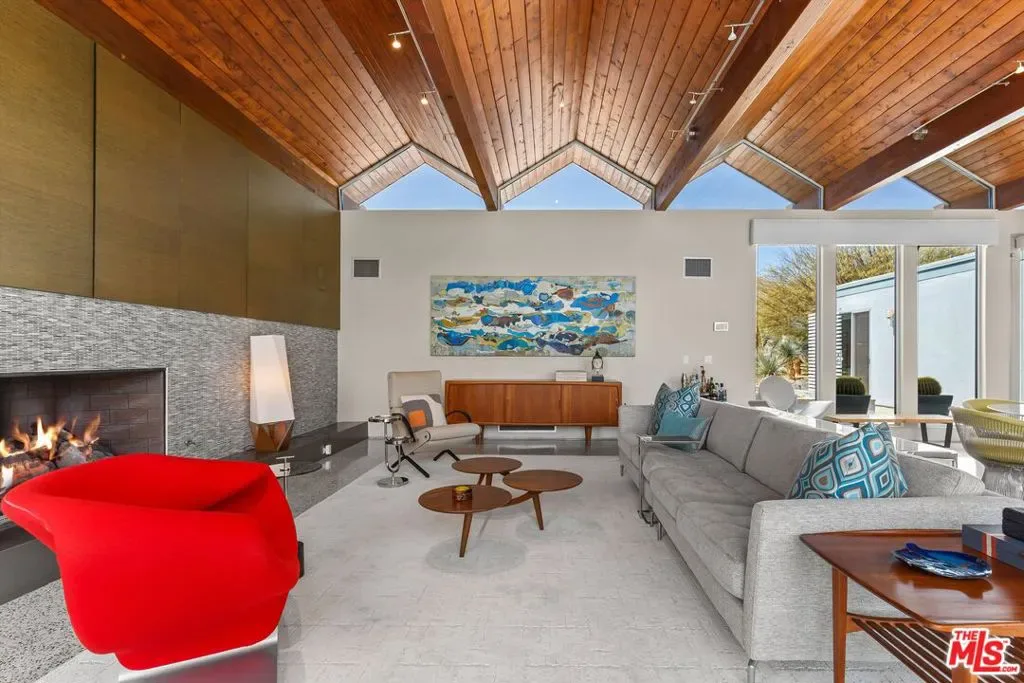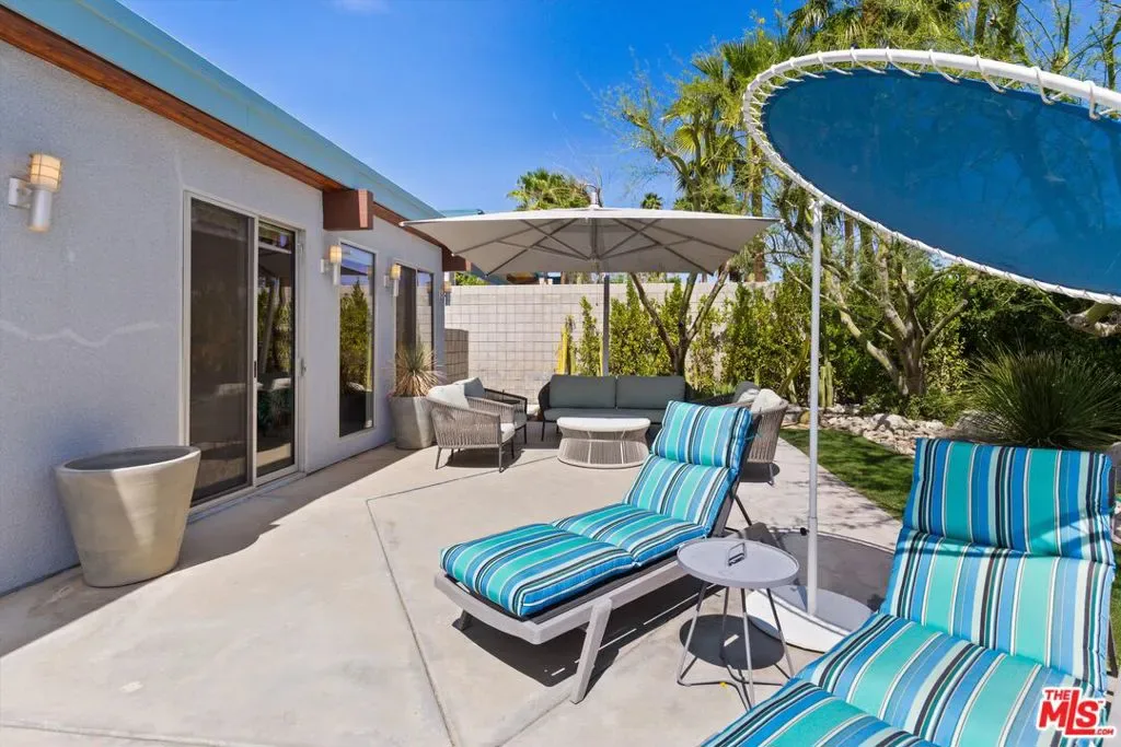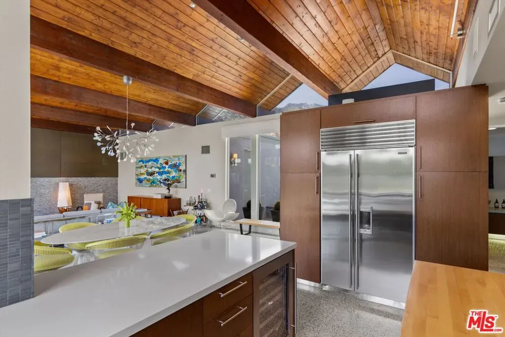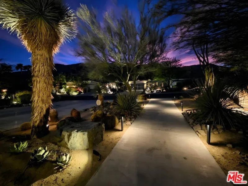 (Also included is a flexible BONUS room ideal as a gym, office, or optional 4th bedroom.) Set within an intimate enclave of just six architecturally cohesive residences, this striking home captures the essence of Palm Springs modernism. Its sculptural folded-plate roofline draws inspiration from the iconic design language attributed to Palmer & Krisel, where geometry, light, and landscape exist in perfect balance. From the moment you arrive, the experience is intentional. A private front courtyard, anchored by a linear water feature and framed by curated desert plantings, creates a sense of calm and quiet sophistication. It is both architectural and meditative, offering a compelling preview of the design narrative that unfolds within. Step through the glass entry and the home immediately opens upward and outward. Soaring wood-plank ceilings span overhead, intersected by clerestory windows that draw in soft desert light throughout the day. Walls of glass dissolve the boundary between indoors and out, allowing the surrounding landscape and mountain backdrop to become part of the living experience. The main living area is expansive yet grounded, designed for connection while maintaining a refined sense of scale and proportion. Poured terrazzo floors reflect light beautifully, adding texture and authenticity while anchoring the space in timeless mid-century materiality. The open layout allows the living, dining, and kitchen areas to flow effortlessly together, creating a cohesive experience throughout the home. At the heart of the residence, the kitchen balances warmth and precision. Custom cabinetry, generous prep surfaces, and a central island create a space equally suited for quiet mornings or elevated entertaining. Sightlines extend through the home to the outdoors, reinforcing the seamless integration of interior and exterior living. The primary suite offers a private retreat that feels both serene and connected. A spa-inspired bath features a striking walk-in shower with custom tilework and direct outdoor access, creating a distinctly Palm Springs indoor-outdoor bathing experience. Two additional guest bedrooms are thoughtfully positioned for privacy, while a flexible bonus room adapts effortlessly as a fourth bedroom, office, or dedicated fitness space. Outside, the backyard unfolds as a true private resort. The pool and spa are framed by clean architectural lines and mature landscaping, while multiple seating and dining areas invite both relaxation and entertaining. A built-in BBQ and outdoor fireplace create an ideal setting for evenings under the desert sky, where the mountains slowly transform into dramatic silhouettes as day gives way to night. Modern efficiency is seamlessly integrated into the home’s design. An owned solar system with 36 panels producing 11.8 kW is paired with three Tesla Powerwall-3 battery backup systems, offering energy independence, resilience, and long-term sustainability. Situated on FEE LAND (you own it), adds both tangible value and long-term security. Tucked within a serene, private enclave, this residence offers a rare balance of architectural integrity, privacy, and livability, just moments from the best of Palm Springs. This is where architecture becomes atmosphere, and light becomes a living element. Each space is designed not only to be seen, but to be felt, capturing the rhythm of the desert and the effortless elegance of Palm Springs living at its most refined.