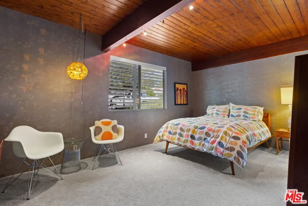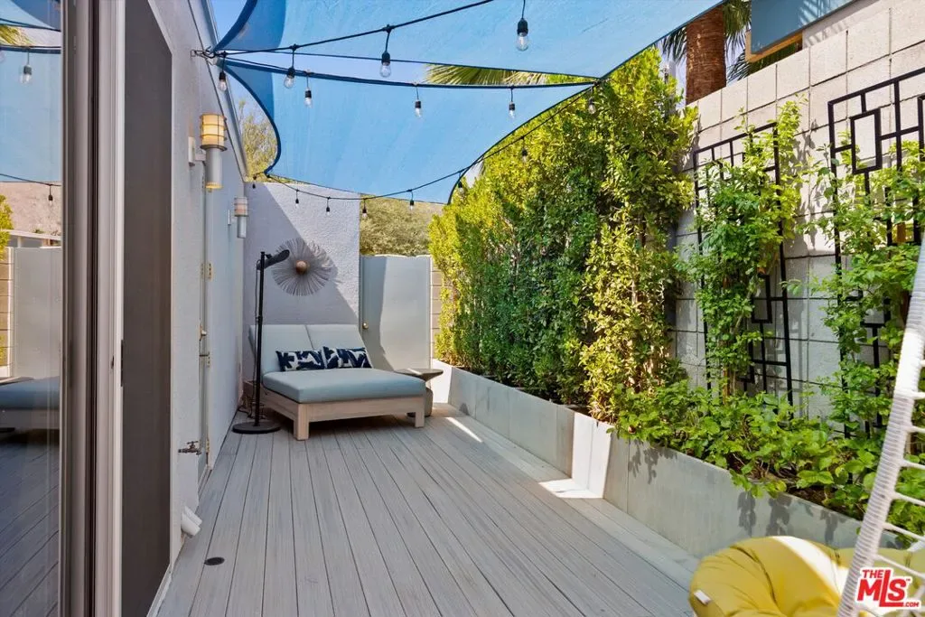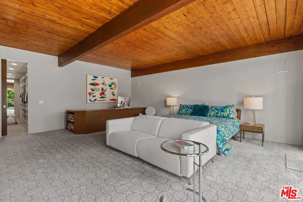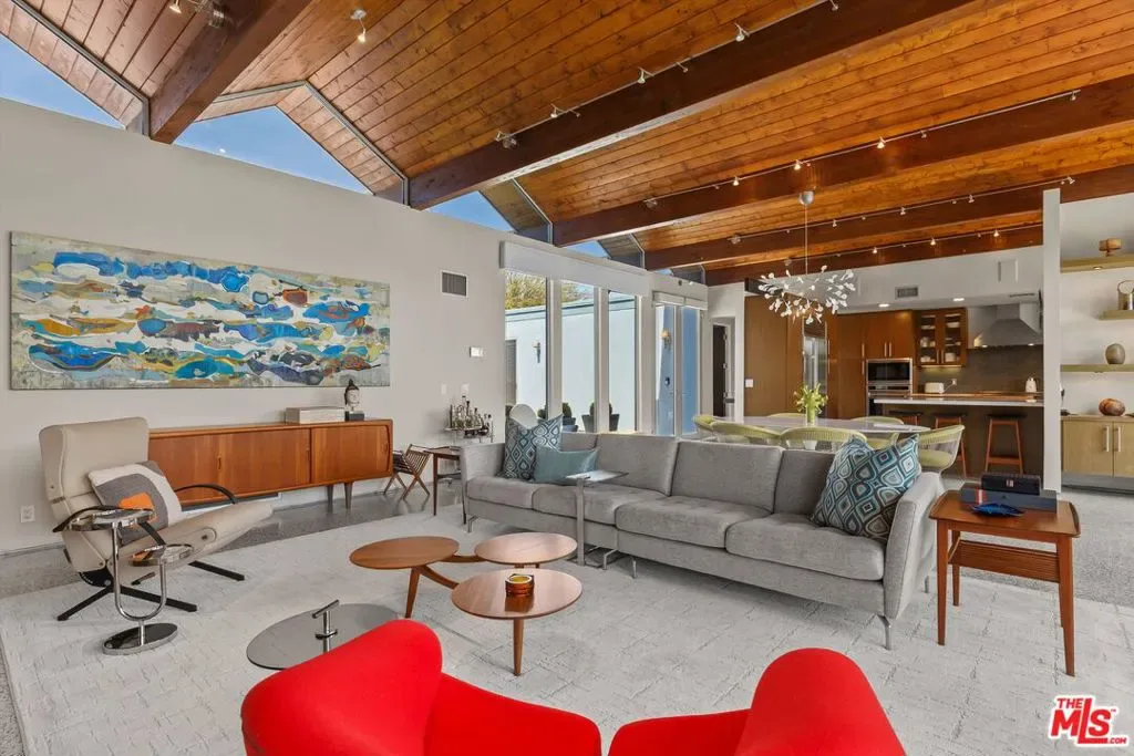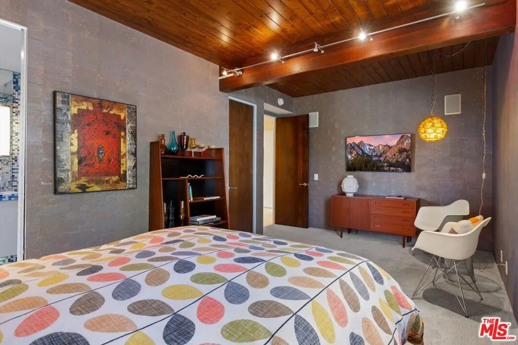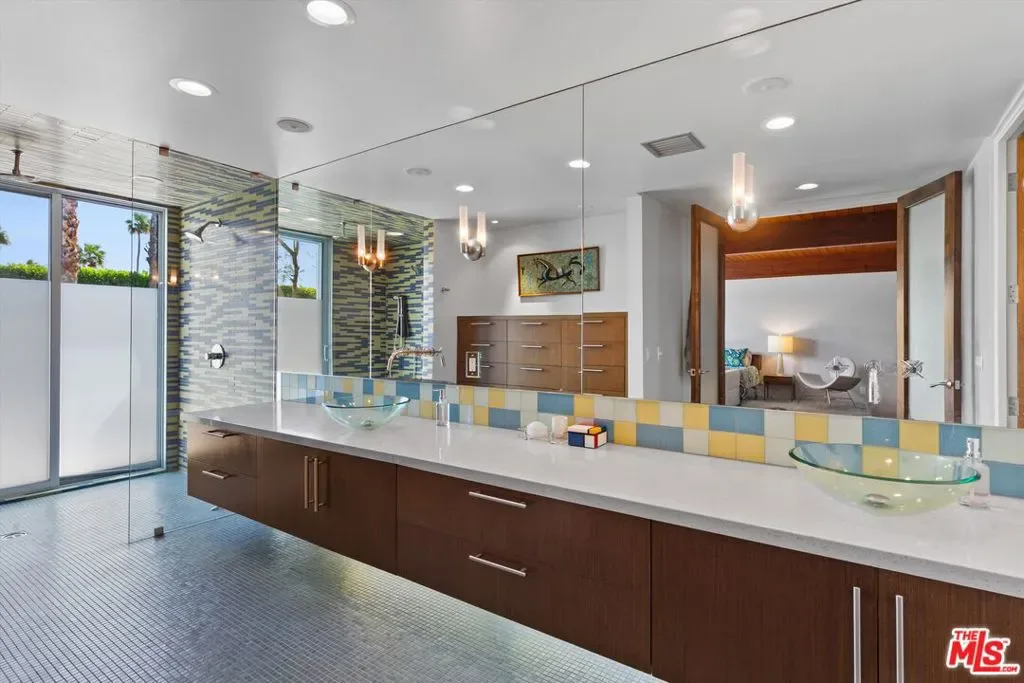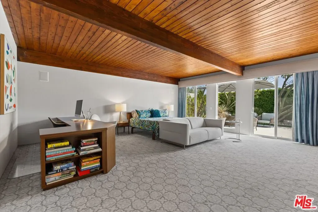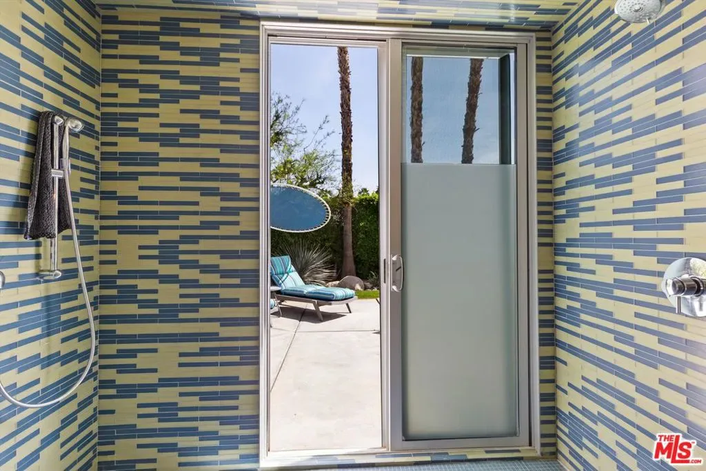 (Also included is a flexible BONUS room ideal as a gym, office, or optional 4th bedroom.) Set within an intimate enclave of just six architecturally cohesive residences, this striking home captures the essence of Palm Springs modernism. Its sculptural folded-plate roofline draws inspiration from the iconic design language attributed to Palmer & Krisel, where geometry, light, and landscape exist in perfect balance. From the moment you arrive, the experience is intentional. A private front courtyard, anchored by a linear water feature and framed by curated desert plantings, creates a sense of calm and quiet sophistication. It is both architectural and meditative, offering a compelling preview of the design narrative that unfolds within. Step through the glass entry and the home immediately opens upward and outward. Soaring wood-plank ceilings span overhead, intersected by clerestory windows that draw in soft desert light throughout the day. Walls of glass dissolve the boundary between indoors and out, allowing the surrounding landscape and mountain backdrop to become part of the living experience. The main living area is expansive yet grounded, designed for connection while maintaining a refined sense of scale and proportion. Poured terrazzo floors reflect light beautifully, adding texture and authenticity while anchoring the space in timeless mid-century materiality. The open layout allows the living, dining, and kitchen areas to flow effortlessly together, creating a cohesive experience throughout the home. At the heart of the residence, the kitchen balances warmth and precision. Custom cabinetry, generous prep surfaces, and a central island create a space equally suited for quiet mornings or elevated entertaining. Sightlines extend through the home to the outdoors, reinforcing the seamless integration of interior and exterior living. The primary suite offers a private retreat that feels both serene and connected. A spa-inspired bath features a striking walk-in shower with custom tilework and direct outdoor access, creating a distinctly Palm Springs indoor-outdoor bathing experience. Two additional guest bedrooms are thoughtfully positioned for privacy, while a flexible bonus room adapts effortlessly as a fourth bedroom, office, or dedicated fitness space. Outside, the backyard unfolds as a true private resort. The pool and spa are framed by clean architectural lines and mature landscaping, while multiple seating and dining areas invite both relaxation and entertaining. A built-in BBQ and outdoor fireplace create an ideal setting for evenings under the desert sky, where the mountains slowly transform into dramatic silhouettes as day gives way to night. Modern efficiency is seamlessly integrated into the home’s design. An owned solar system with 36 panels producing 11.8 kW is paired with three Tesla Powerwall-3 battery backup systems, offering energy independence, resilience, and long-term sustainability. Situated on FEE LAND (you own it), adds both tangible value and long-term security. Tucked within a serene, private enclave, this residence offers a rare balance of architectural integrity, privacy, and livability, just moments from the best of Palm Springs. This is where architecture becomes atmosphere, and light becomes a living element. Each space is designed not only to be seen, but to be felt, capturing the rhythm of the desert and the effortless elegance of Palm Springs living at its most refined.