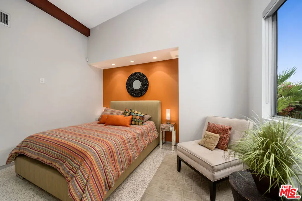 FURNISHED LONG-TERM LEASE. Find your desert oasis at this 4 bed, 4.5 bath modern architectural home at the end of a quiet cul-de-sac 2 blocks from all Palm Canyon Drive has to offer. The home is outfitted with furnishings, cookware and linens – simply bring your clothes and toothbrush! Step through a private courtyard with outdoor/ indoor water feature into a brilliantly designed open entertaining space ft. high ceilings with floor-to-ceiling windows and sliders, exposed beams, built-in speakers, and expansive west-facing unobstructed mountain views. Off the modern open kitchen is a guest bedroom, full bath, laundry and access to the 2-car garage. The main hall leads to a powder room, 2 en-suite bedrooms, and an enclosed master suite with dual showers and a walk-in closet. Sunbathe around the in-ground pool and spa w/ waterfall, spray pond features, & outdoor shower. Host around the fire pit or separate fireplace with easy access to the outdoor kitchen, BBQ, and bar. Call this place home with the turn of a key.