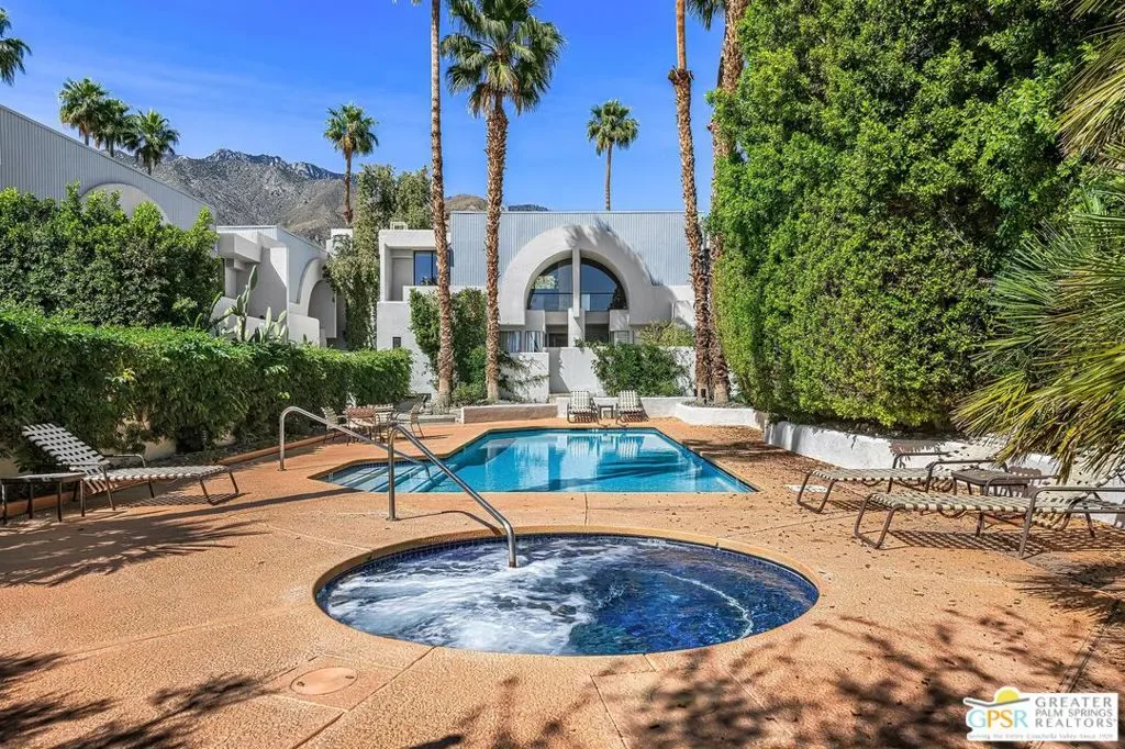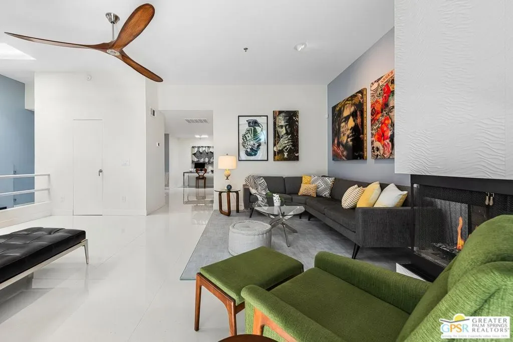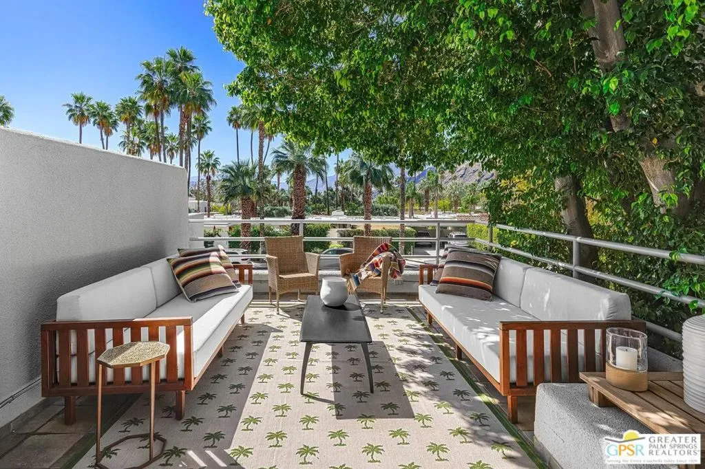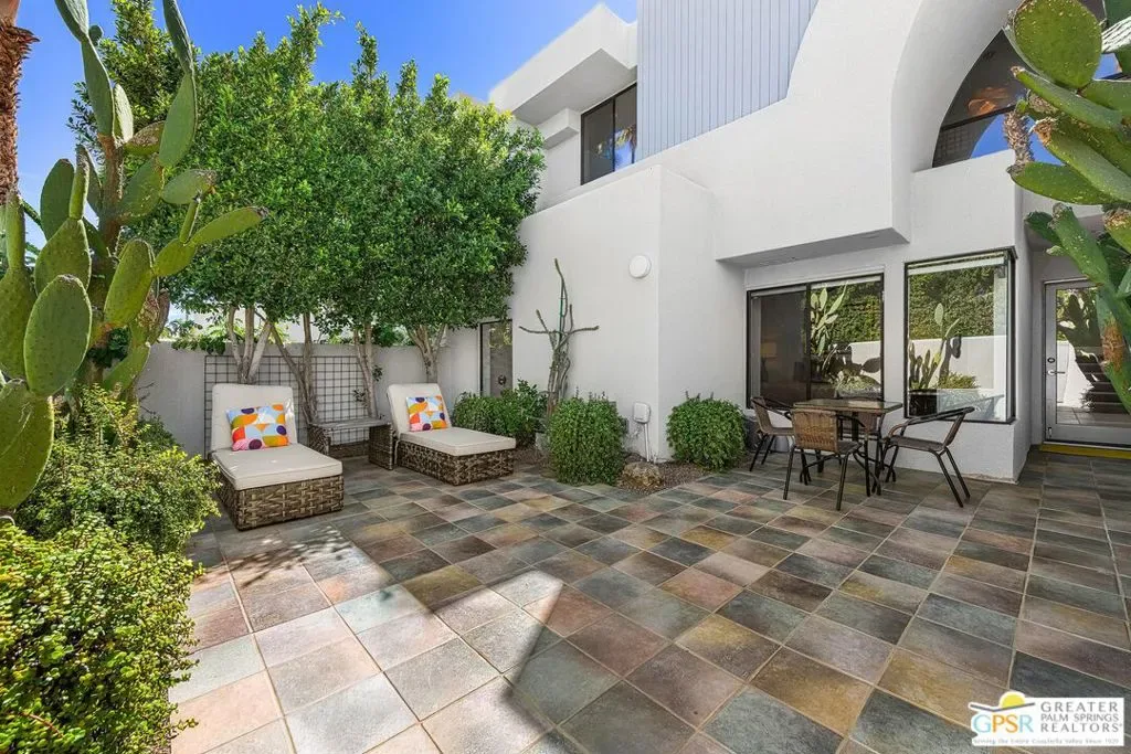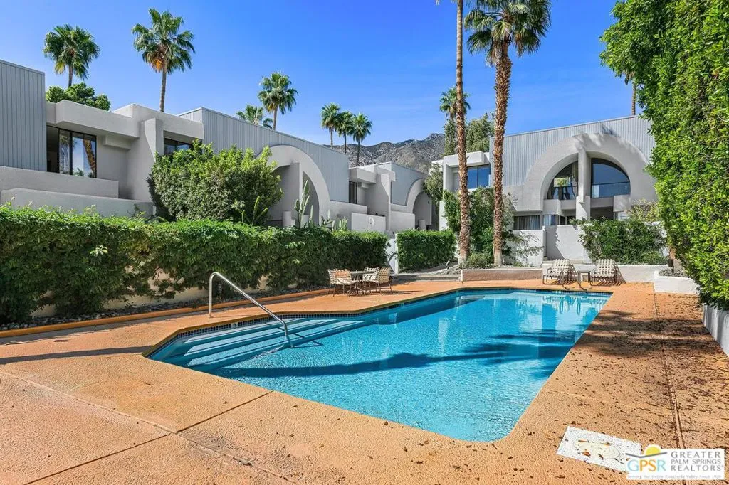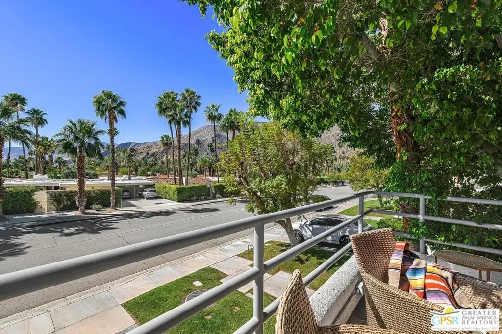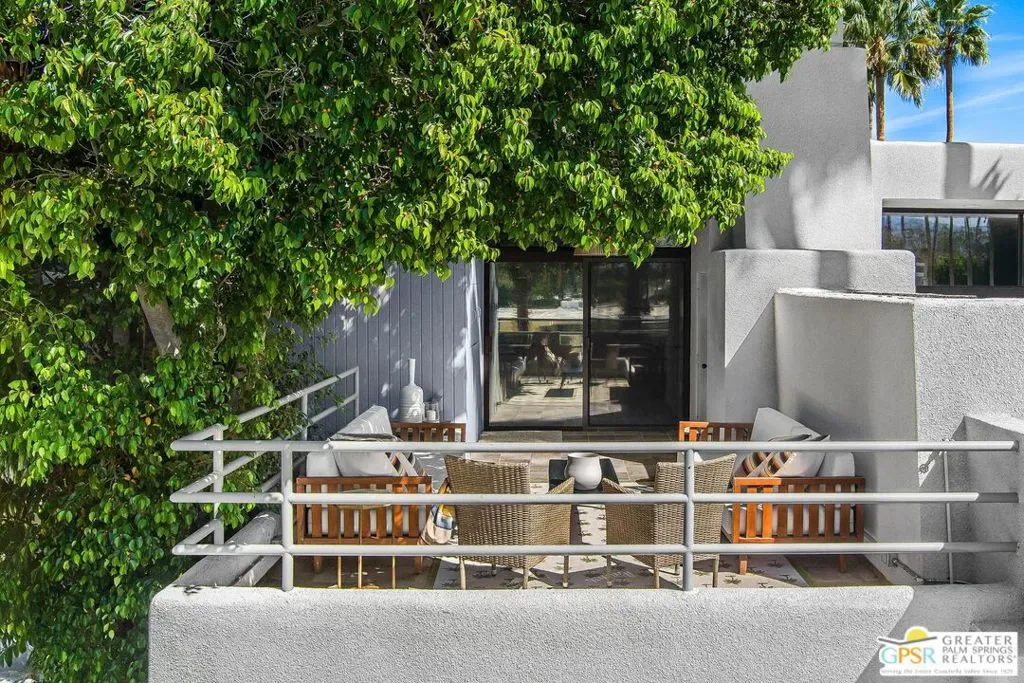Discover the architectural allure of The Compound, an uncommon 12-unit townhouse enclave, adjacent to the prestigious Old Las Palmas neighborhood. This sophisticated residence has been completely reimagined with high-end appointments to match the ultimate Palm Springs lifestyle. Enter a refined mid-level foyer that introduces the home’s unique split-level design. Upstairs, the living room features a fireplace and access to an expansive entertaining balcony. The sleek, efficient kitchen is anchored by a waterfall Caesarstone island with integrated seating, a pantry, and an open dining area. Both ensuite bedrooms are downstairs, with highly upgraded bathrooms. Even the garage has been elevated with fresh epoxy flooring and custom storage cabinetry. Super close proximity to multiple restaurants and the best bakery in town — Bread and Flours. With only 12 neighbors and a location that offers a short, scenic stroll downtown, this property provides a rare “lock-and-leave” opportunity.