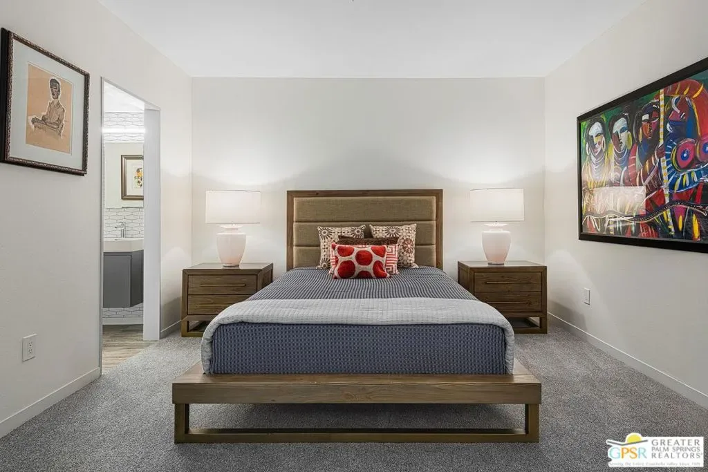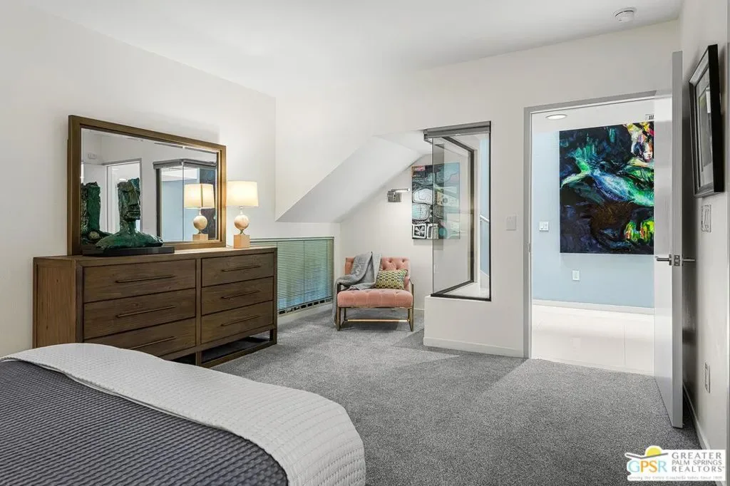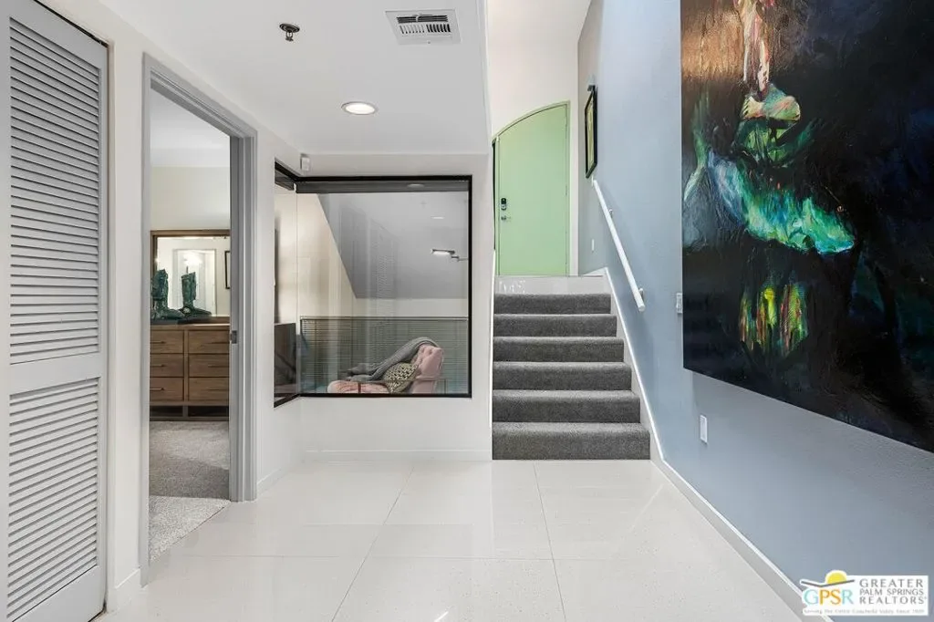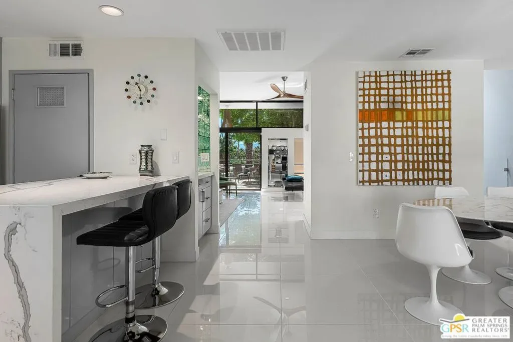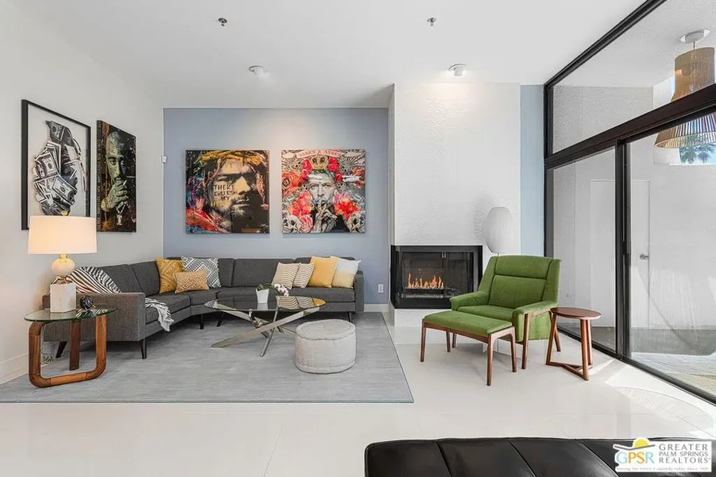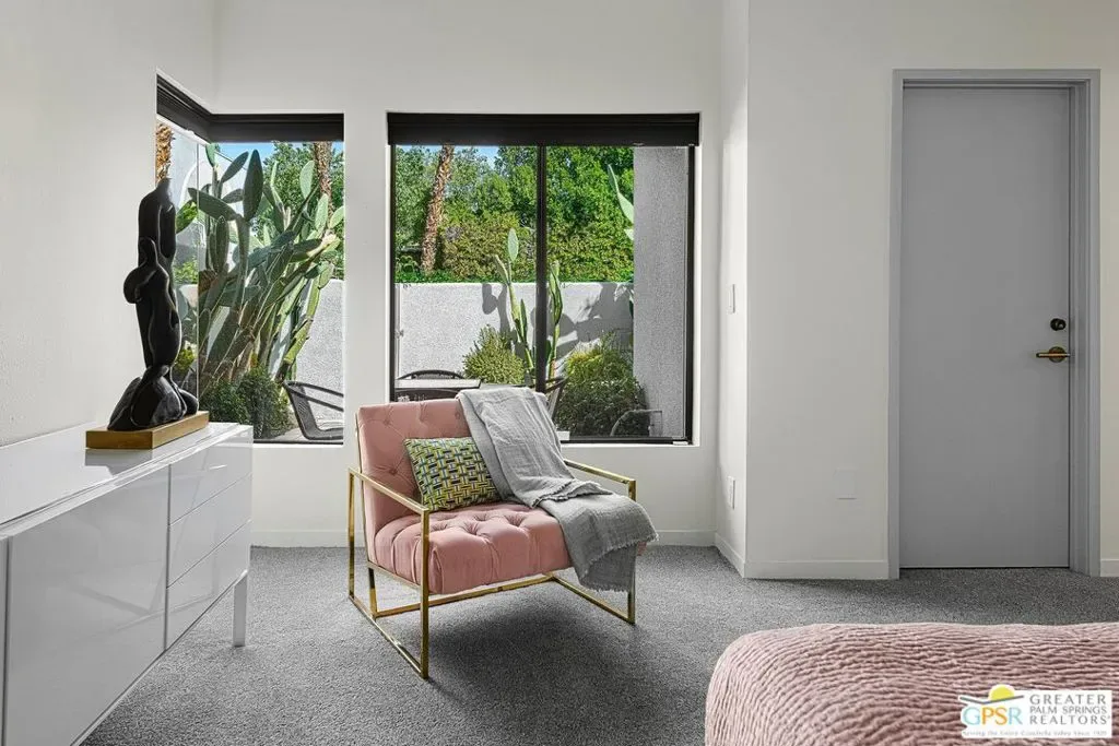 Discover the architectural allure of The Compound, an uncommon 12-unit townhouse enclave, adjacent to the prestigious Old Las Palmas neighborhood. This sophisticated residence has been completely reimagined with high-end appointments to match the ultimate Palm Springs lifestyle. Enter a refined mid-level foyer that introduces the home’s unique split-level design. Upstairs, the living room features a fireplace and access to an expansive entertaining balcony. The sleek, efficient kitchen is anchored by a waterfall Caesarstone island with integrated seating, a pantry, and an open dining area. Both ensuite bedrooms are downstairs, with highly upgraded bathrooms. Even the garage has been elevated with fresh epoxy flooring and custom storage cabinetry. Super close proximity to multiple restaurants and the best bakery in town — Bread and Flours. With only 12 neighbors and a location that offers a short, scenic stroll downtown, this property provides a rare “lock-and-leave” opportunity.