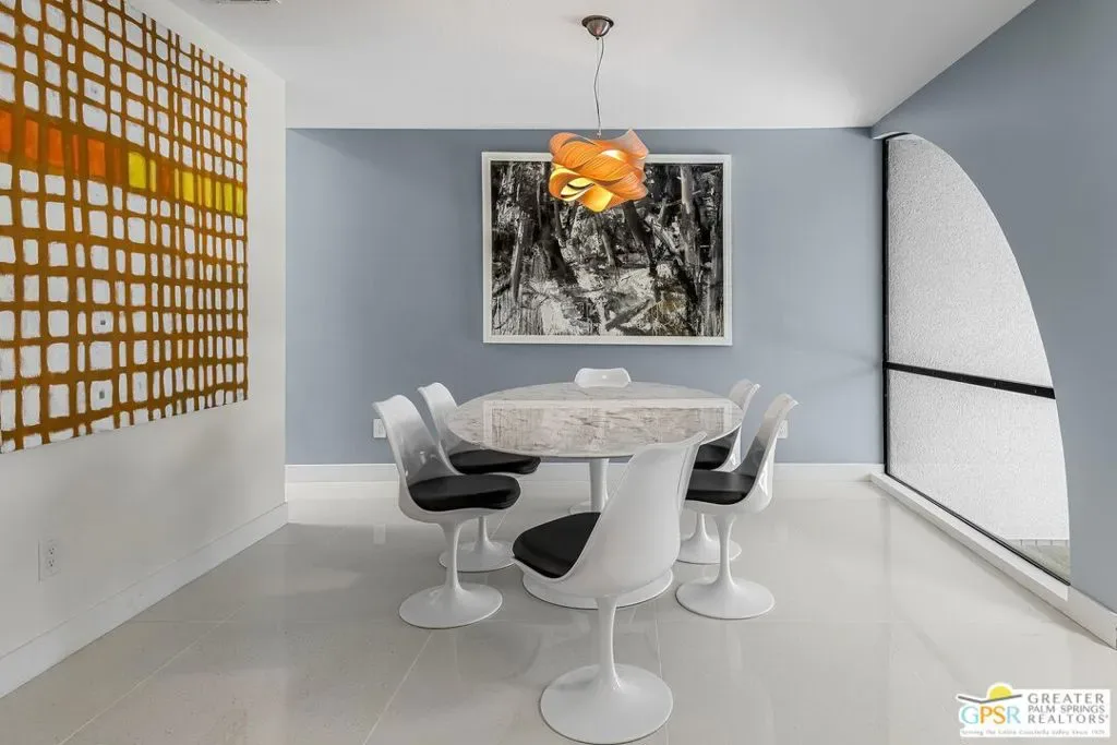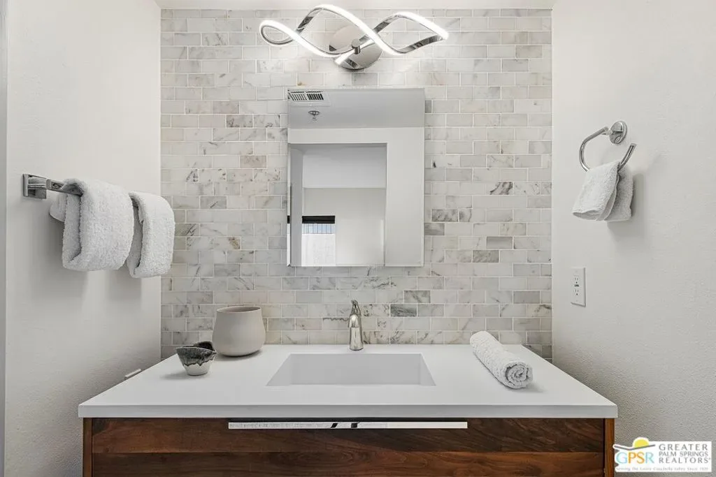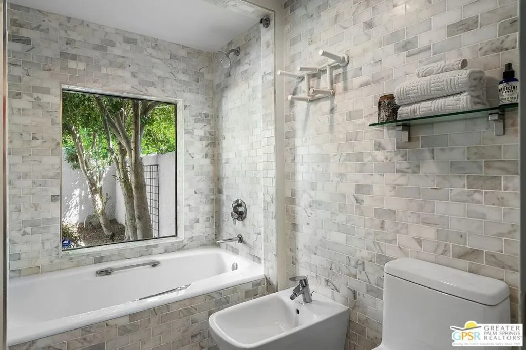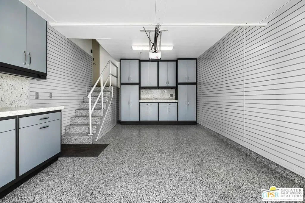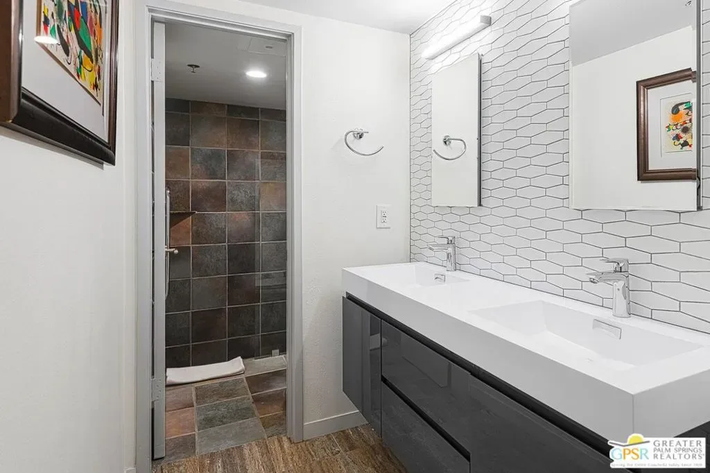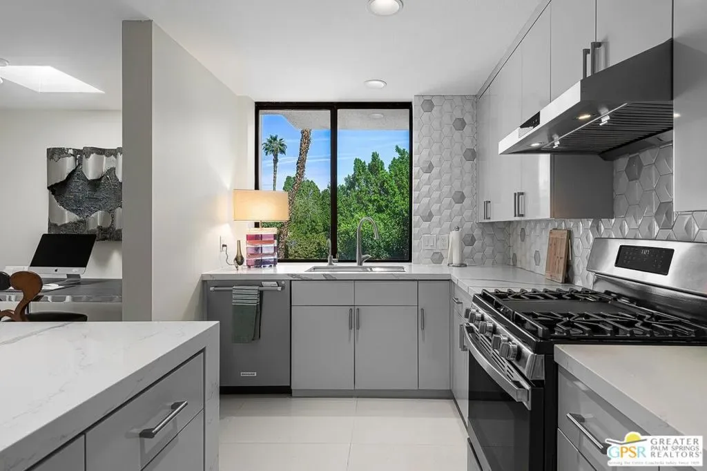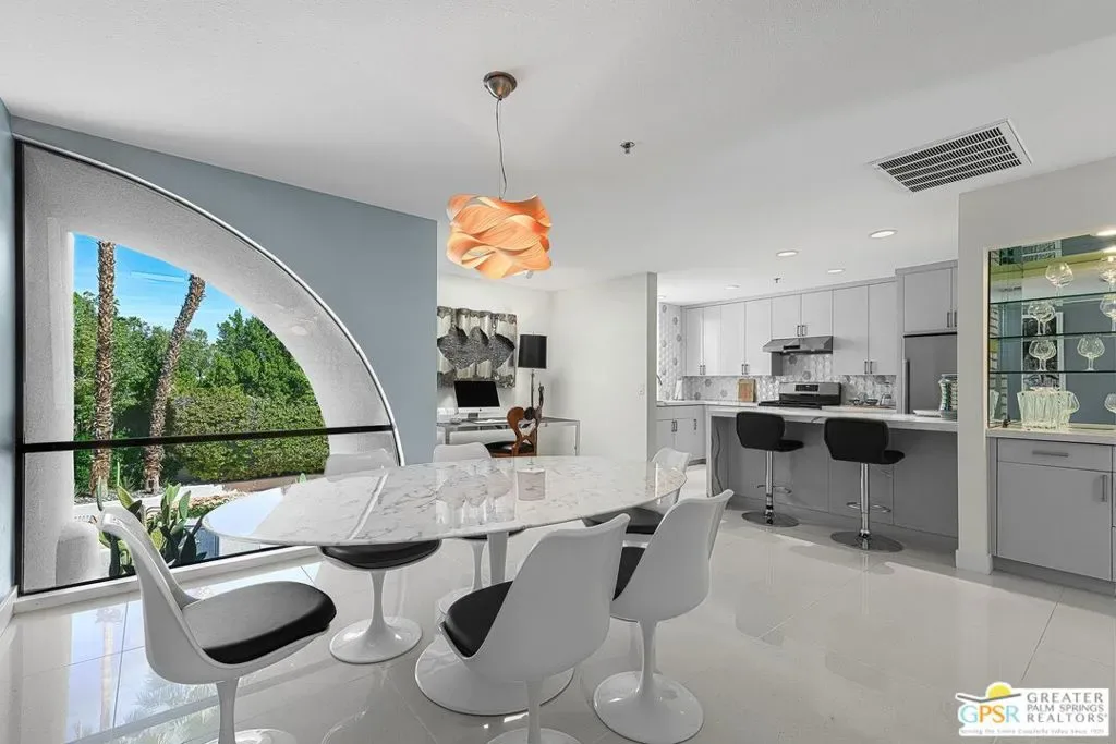Discover the architectural allure of The Compound, an uncommon 12-unit townhouse enclave, adjacent to the prestigious Old Las Palmas neighborhood. This sophisticated residence has been completely reimagined with high-end appointments to match the ultimate Palm Springs lifestyle. Enter a refined mid-level foyer that introduces the home’s unique split-level design. Upstairs, the living room features a fireplace and access to an expansive entertaining balcony. The sleek, efficient kitchen is anchored by a waterfall Caesarstone island with integrated seating, a pantry, and an open dining area. Both ensuite bedrooms are downstairs, with highly upgraded bathrooms. Even the garage has been elevated with fresh epoxy flooring and custom storage cabinetry. Super close proximity to multiple restaurants and the best bakery in town — Bread and Flours. With only 12 neighbors and a location that offers a short, scenic stroll downtown, this property provides a rare “lock-and-leave” opportunity.
