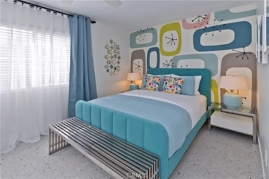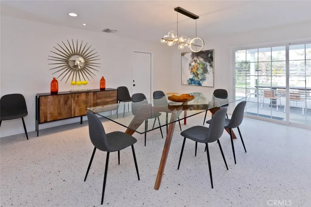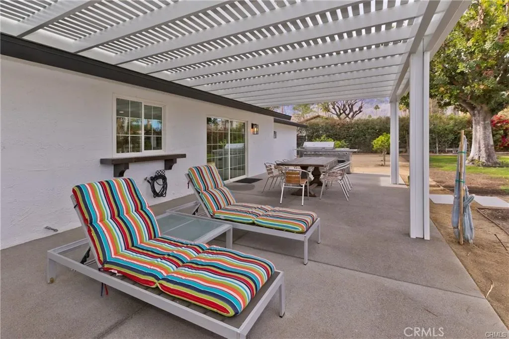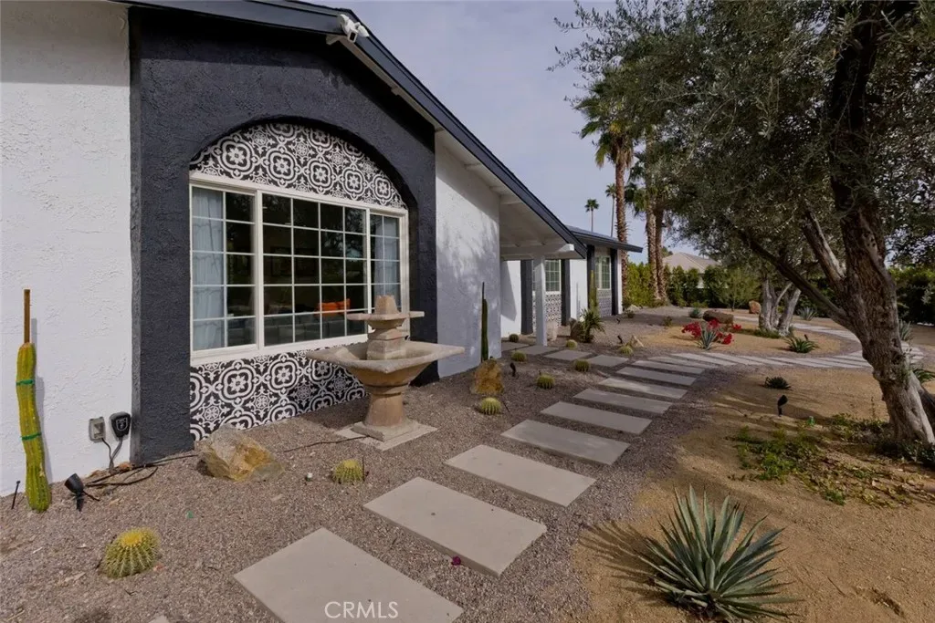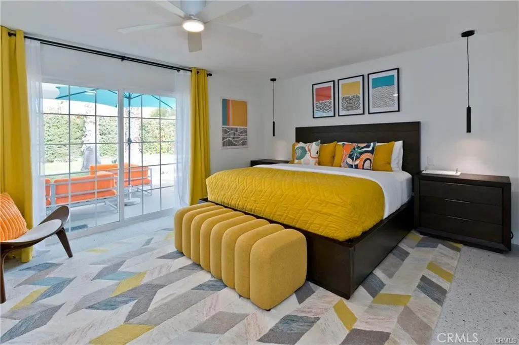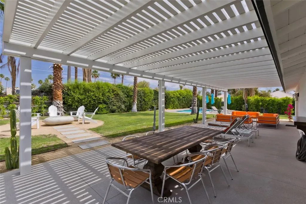 Summer rental only at this price, Winter months vary from 13,000-$18,000 Welcome to Escoba Ranch, a fully remodeled and spacious three-bedroom home located just minutes from downtown Palm Springs and the Palm Springs International Airport with a massive private yard. Our large and private corner lot offers stunning views of the San Jacinto Mountains, accompanied by a salt water pool and jacuzzi, a 45-foot covered patio, a citrus orchard, a fire pit lounge, an outdoor shower, dual garage (with AV charger) all surrounded by a variety of palm trees, cacti, and desert flowers. Interior Highlights: This home is fully furnished! The open floor plan living and dining area features a 75-inch TV, a cozy fireplace, and an extra-large dining room that opens to the outdoor living area. The well-appointed kitchen is equipped with all the amenities needed to entertain and enjoy your stay in Palm Springs. Location Situated in the Los Compadres neighborhood of southeast Palm Springs—well south of the wind zone—Rancho Vista Del Sol provides quick access to the city’s vibrant heart, including its restaurants, museums, shops, and galleries. We are conveniently located on the new Palm Springs CV Link (Coachella Valley bike path) and are just minutes away from the Prescott Nature Preserve, dog parks, and the Araby trail system, which leads to the famous Bob Hope House and beyond. Primary Suite: The luxurious primary bedroom serves as a private oasis, featuring a plush king-size bed with a beautiful wood headboard. A large sliding glass door allows natural light to illuminate the rich terrazzo floors and sleek mid-century modern furnishings. Additionally, there is a large-screen smart TV that can be neatly tucked away when not in use. A spacious closet provides ample storage, while the en-suite bathroom boasts a dual vanity with quartz countertops and an oversized walk-in shower complete with a rainfall showerhead and designer tile work. Second Bedroom: It features a queen-size bed, restored mid-century nightstands, and a large 65-inch TV. A large window frames picturesque mountain views, ensuring guests wake up to stunning desert landscapes. A well-appointed closet and stylish accent lighting round out this comfortable space. Third Bedroom: . Decorated with subtle mid-century modern touches and European wallpaper, this space combines practicality and style through soft textiles, fun wall treatments, and ample storage.