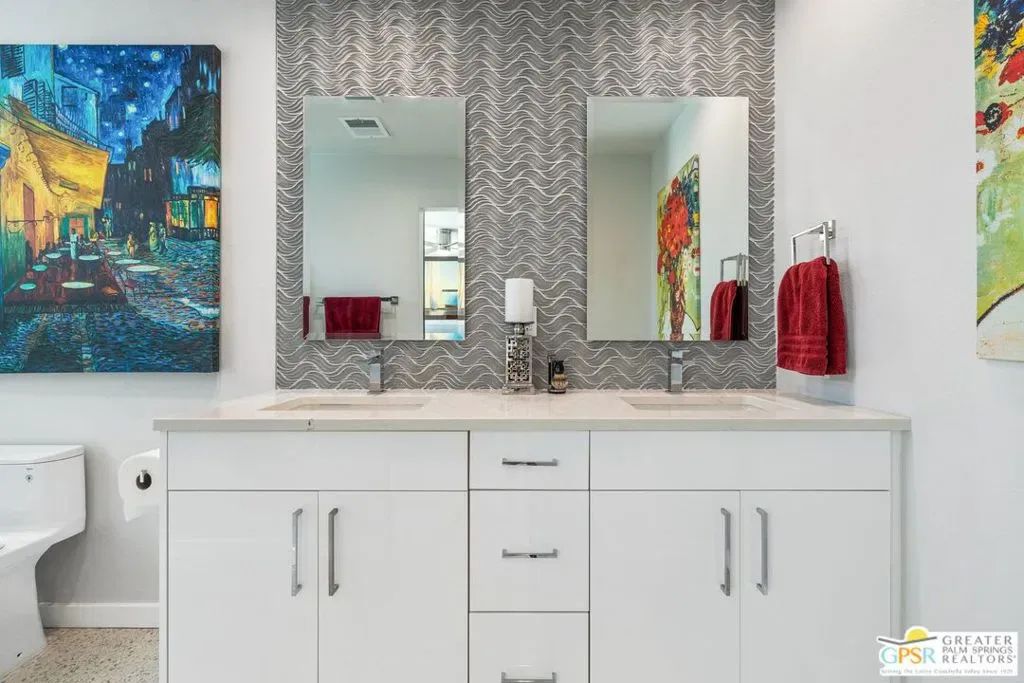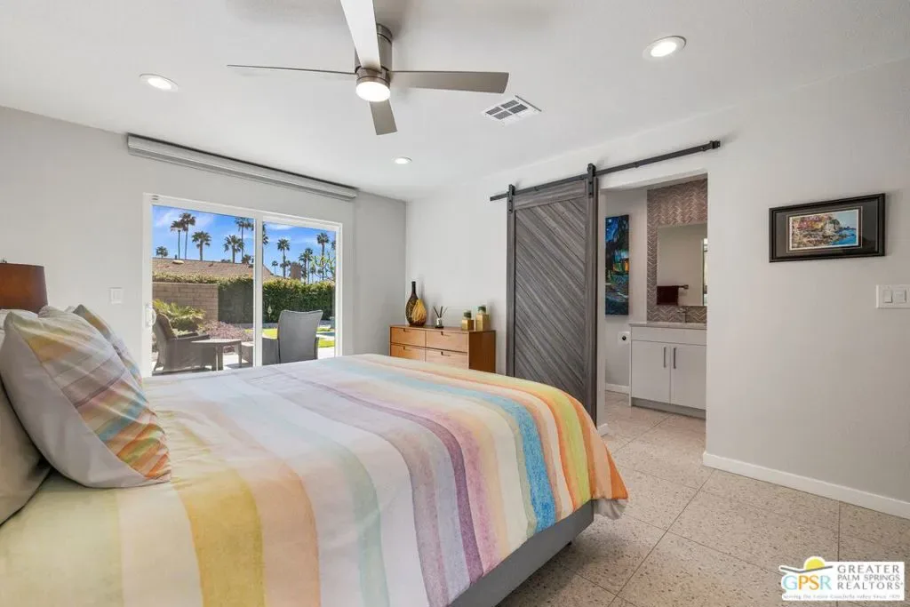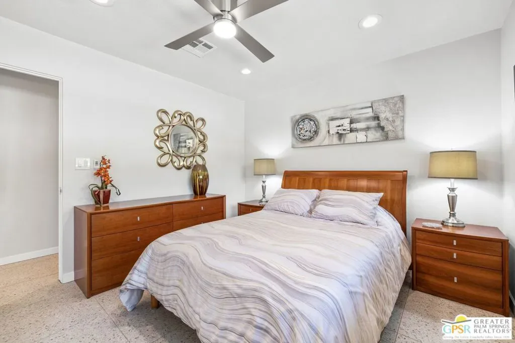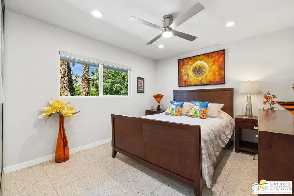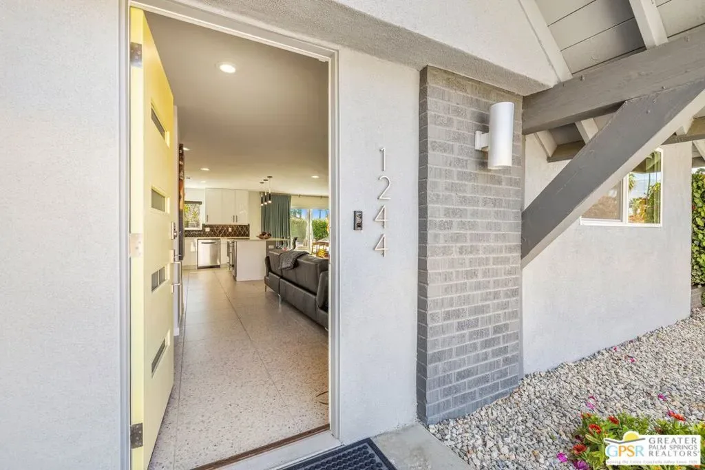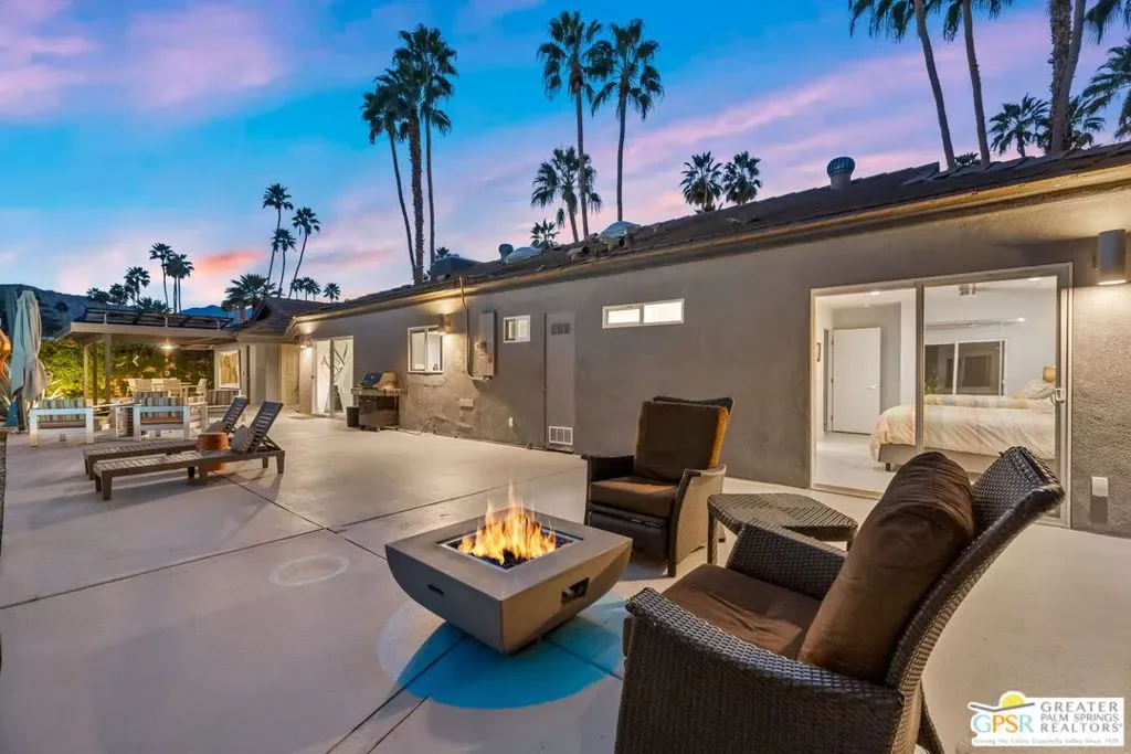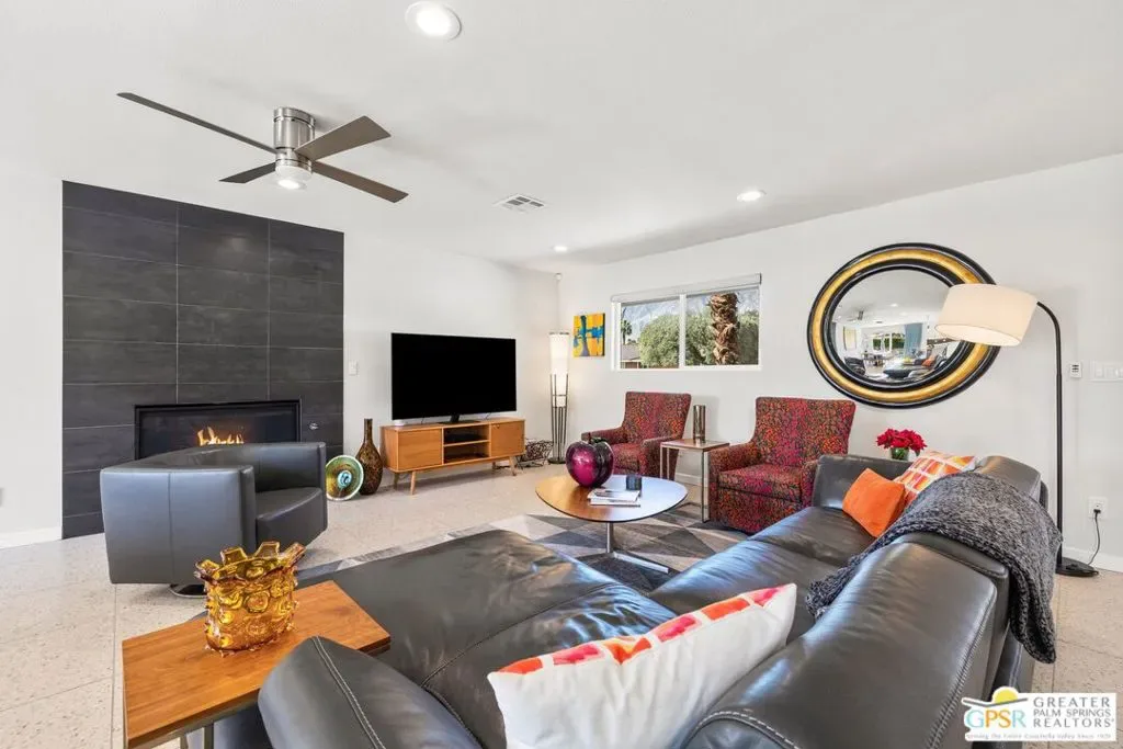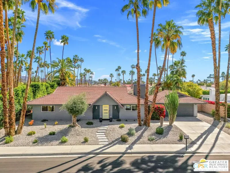 Welcome to this meticulously renovated modern home in one of South Palm Springs’ most sought-after neighborhoods, Los Compadres. Situated on land you own, this home features a comprehensive floor-to-ceiling transformation, delivering high-end finishes and remarkable outdoor living spaces with breathtaking mountain views to the East, South, and West. It truly shows like a model! Step inside to discover an airy, open-concept floor plan bathed in natural light. The home boasts sleek modern cabinetry, Cambria quartz countertops, and terrazzo tile flooring throughout. The resort-style backyard is an entertainer’s dream, featuring a sparkling pool, a separate in-ground spa, multiple outdoor living and dining areas, lush landscaping, and panoramic, wire-free mountain views. Additional highlights include brand-new dual-pane windows with custom window treatments (installed in 2022), updated electrical wiring and plumbing, as well as new interior and exterior doors. The home also features a newly installed HVAC system and paid-off solar panels for energy efficiency. There’s no HOA, and the property qualifies for a Vacation Rental Certificate, making it an excellent opportunity for short-term rentals! The chef-inspired kitchen seamlessly opens to the living and dining areas, both of which offer sweeping views and easy access to the outdoor space. The backyard is beautifully framed by colorful, low-maintenance landscaping, creating a serene environment for relaxation. The primary ensuite retreat offers stunning views, direct access to the private backyard, and a spa-inspired bathroom with modern cabinetry, Cambria quartz countertops, dual sinks, and a large walk-in shower with a clerestory window, frameless glass, and dual showerheads. The two west-facing guest bedrooms are equally impressive, with mountain views, terrazzo tile flooring, and convenient access to the beautifully appointed hallway bathroom, featuring modern cabinetry, Cambria quartz countertops, dual sinks, and a shower/tub combination with dual showerheads. Additional features include an indoor laundry area, making this home as practical as it is stylish.
