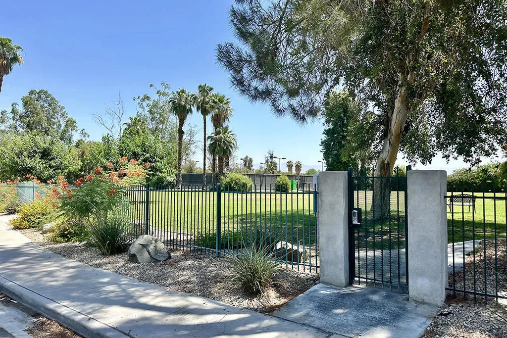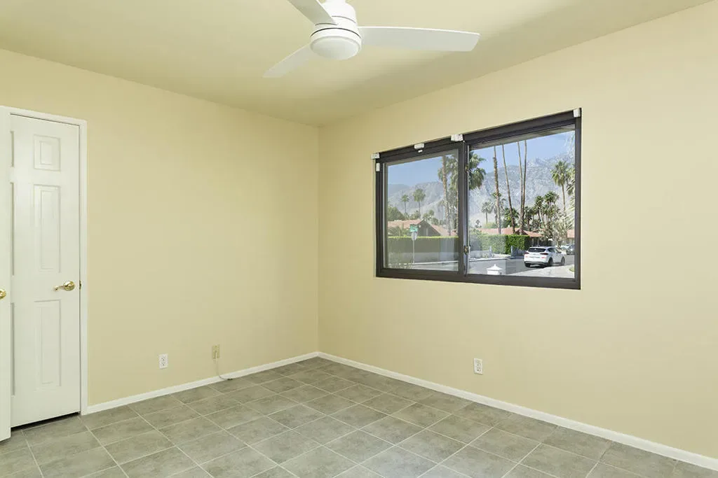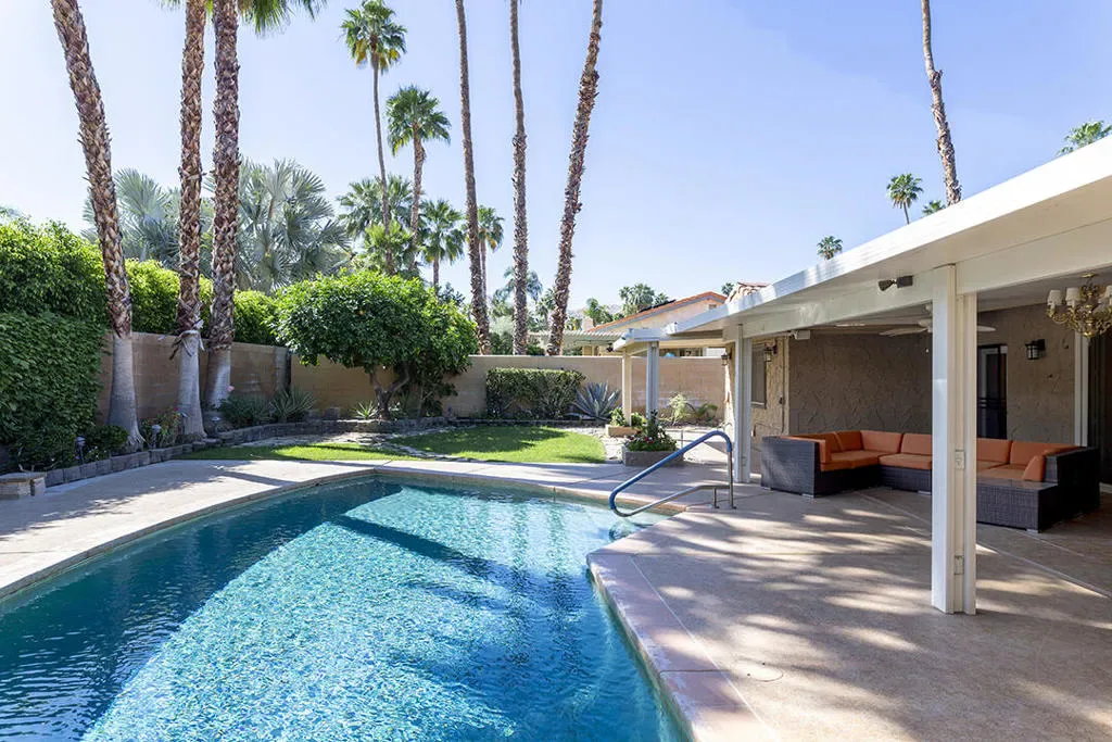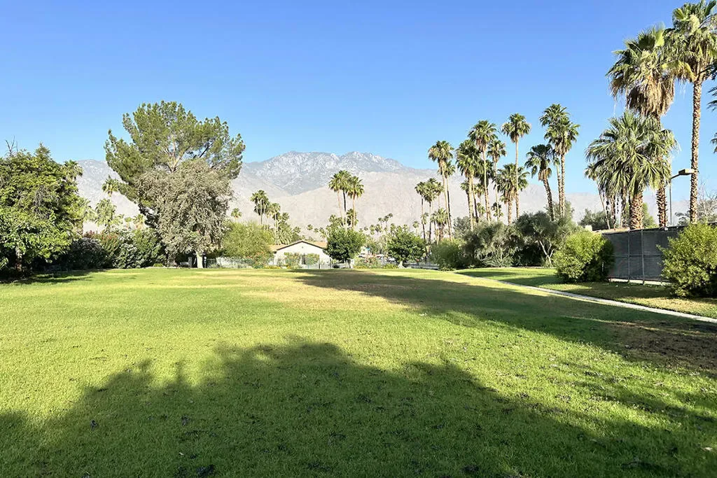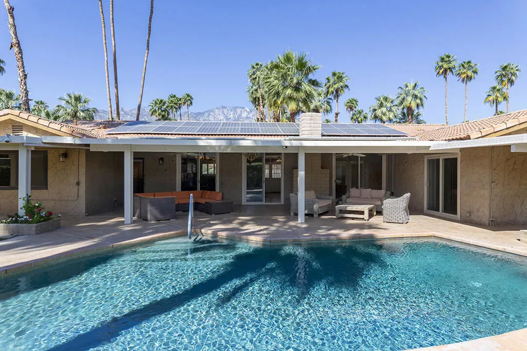 Located in Los Compadres Estates in Palm Springs, this beautifully maintained California Ranch offers the perfect blend of comfort, style, and location. Set on Fee Land in one of Palm Springs’ classic ”non-windy” neighborhoods, the home enjoys mountain views, no visible power lines, and membership in an exclusive 50-home HOA with access to a private community park featuring pickleball and tennis courts.This spacious single-story residence features 3 bedrooms, 3 bathrooms, and a versatile media room/den. The vaulted great room is highlighted by impressive 13-foot ceilings, a classic brick fireplace, and sliding doors that open to the expansive covered patio and sparkling pool, creating an effortless indoor-outdoor flow. Both the front and rear yards are professionally landscaped with mature trees, artificial turf, manicured rock gardens, and thoughtfully curated desert plantings that enhance the home’s Palm Springs appeal.Inside, the updated classic galley kitchen features a west-facing window and offers the opportunity to create a more open-concept layout if desired. Just off the main living area, the den enjoys wonderful natural light and beautiful views. The spacious primary suite opens directly to the covered rear patio and lush backyard, and has a walk-in closet and an updated en-suite bath.At the front of the home, the second bedroom enjoys excellent natural light, lovely views, and convenient access to a guest bath. The third bedroom is privately situated on the opposite side of the home near the kitchen and laundry area, making it ideal for guests or a home office. Additional features include a leased solar system, an updated roof, and the home’s overall immaculate condition. HOA | $1,080/year | HOA is for the maintenance of the 2-acre private park for the 50 homes in the community. There is one tennis court and four pickle ball courts.Solar | Leased | Installed 2012 | 10.92 Kw DC | $294/mo | System purchase $25,518.32 valid until 04-30-2026 | Expires 2032Additional Items and Amenities Roof updated in 2012 when solar was added Updated doors and windows throughout One main HVAC with an additional Split system for primary suite. Also an evaporative cooling system.