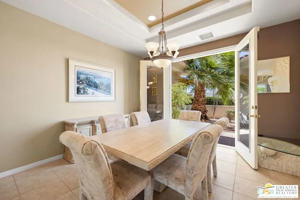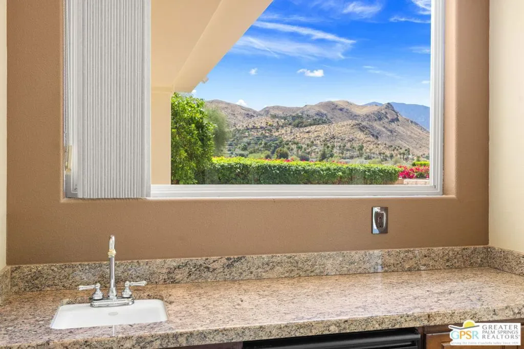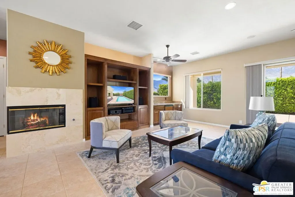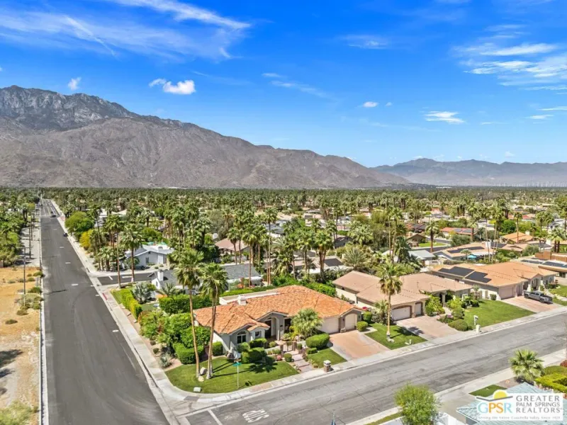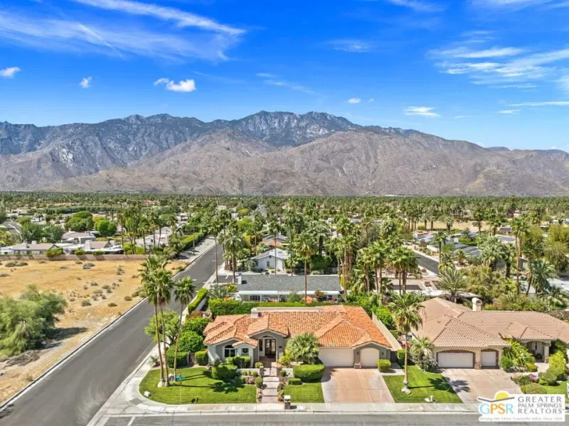 SUN, POOL, and MOUNTAIN VIEWS to the south and west set the tone for easy South Palm Springs living at this private backyard retreat. Tucked into a quieter pocket of the Los Compadres neighborhood, this residence offers a sense of privacy while remaining close to the best of town. Situated on Fee Land (you own it) and currently eligible for a Short Term Rental Permit. 3 bedrooms and 3 baths in 2,783 square feet. The backyard is a highlight with mature citrus, swaying palms, and a pool and spa with waterfall set against the mountain backdrop. No power lines to interrupt the view. Inside, main living areas are light and bright with tall ceilings and tile floors, opening to a long covered patio through a series of sliders. The living room features custom built ins, a fireplace, and wet bar with refrigerator and views. Formal dining includes a coved ceiling, motorized blinds, and French doors to a separate patio. The kitchen centers around a large island with counter seating, plus a walk in pantry, breakfast area, and desk alcove. Great separation of bedrooms. The ensuite primary features vaulted ceilings, clerestory windows, direct patio and pool access, a soaking tub, walk in shower, and generous closet space. Junior Ensuite 2 also opens to the pool with its own bath. Guest Bedroom 3 is currently used as an office and sits near a full bath featuring a clerestory window. Laundry room with utility sink is located off the kitchen. Direct access to a 3 car garage. All of this in a desirable South Palm Springs location close to dining, shopping, and everything that makes this part of the desert so easy to enjoy.