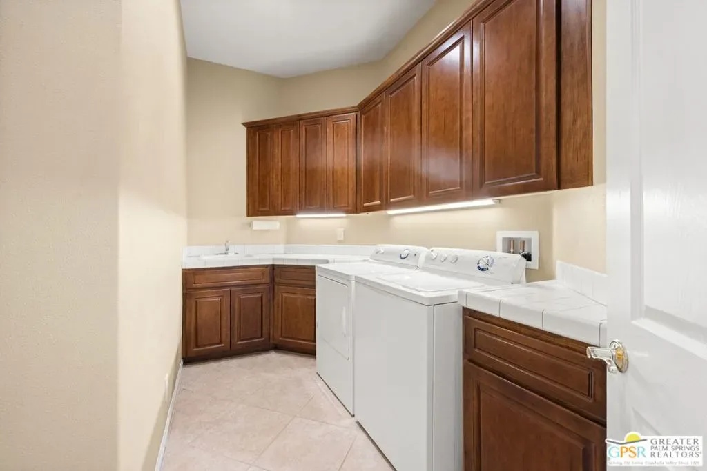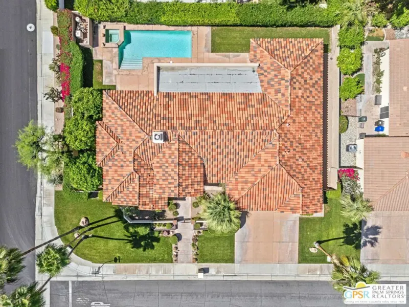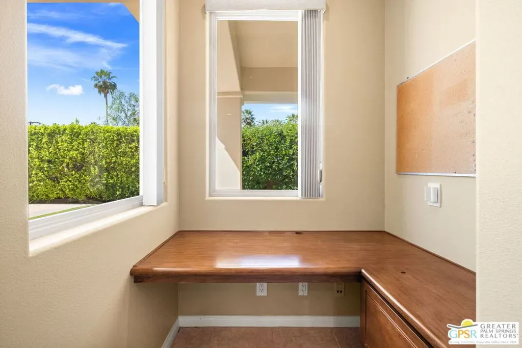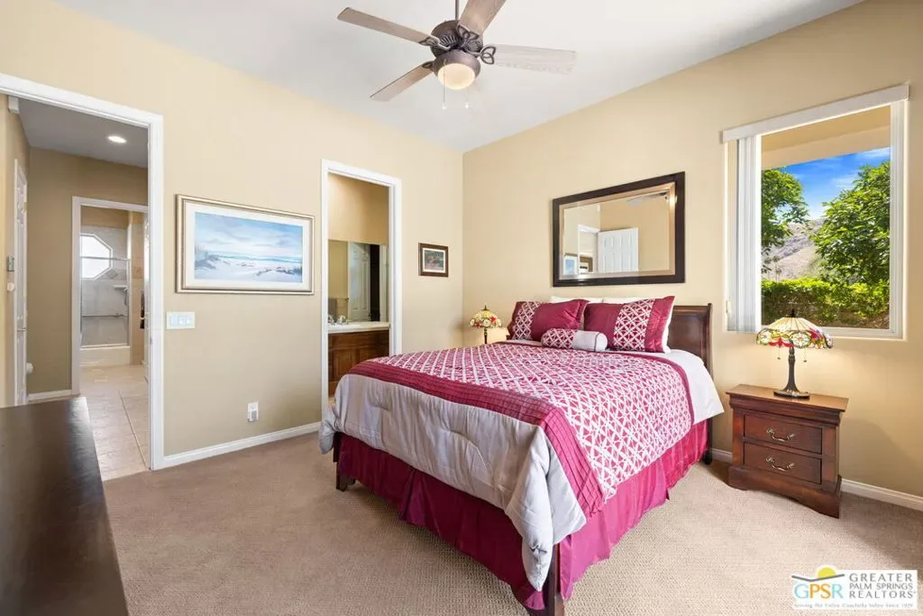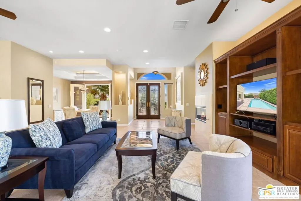 SUN, POOL, and MOUNTAIN VIEWS to the south and west set the tone for easy South Palm Springs living at this private backyard retreat. Tucked into a quieter pocket of the Los Compadres neighborhood, this residence offers a sense of privacy while remaining close to the best of town. Situated on Fee Land (you own it) and currently eligible for a Short Term Rental Permit. 3 bedrooms and 3 baths in 2,783 square feet. The backyard is a highlight with mature citrus, swaying palms, and a pool and spa with waterfall set against the mountain backdrop. No power lines to interrupt the view. Inside, main living areas are light and bright with tall ceilings and tile floors, opening to a long covered patio through a series of sliders. The living room features custom built ins, a fireplace, and wet bar with refrigerator and views. Formal dining includes a coved ceiling, motorized blinds, and French doors to a separate patio. The kitchen centers around a large island with counter seating, plus a walk in pantry, breakfast area, and desk alcove. Great separation of bedrooms. The ensuite primary features vaulted ceilings, clerestory windows, direct patio and pool access, a soaking tub, walk in shower, and generous closet space. Junior Ensuite 2 also opens to the pool with its own bath. Guest Bedroom 3 is currently used as an office and sits near a full bath featuring a clerestory window. Laundry room with utility sink is located off the kitchen. Direct access to a 3 car garage. All of this in a desirable South Palm Springs location close to dining, shopping, and everything that makes this part of the desert so easy to enjoy.