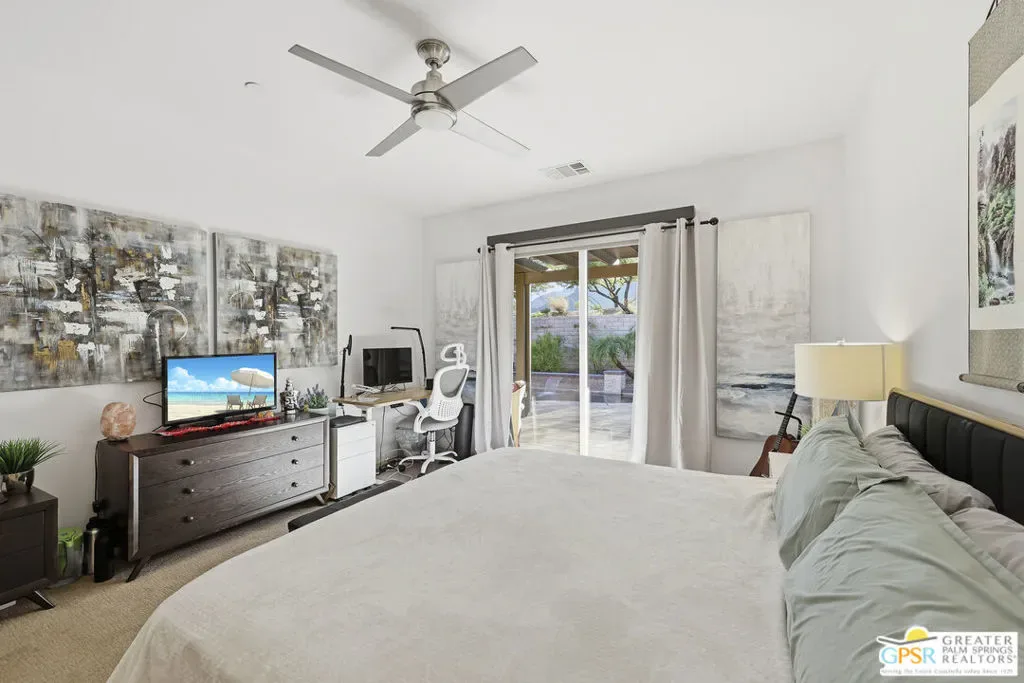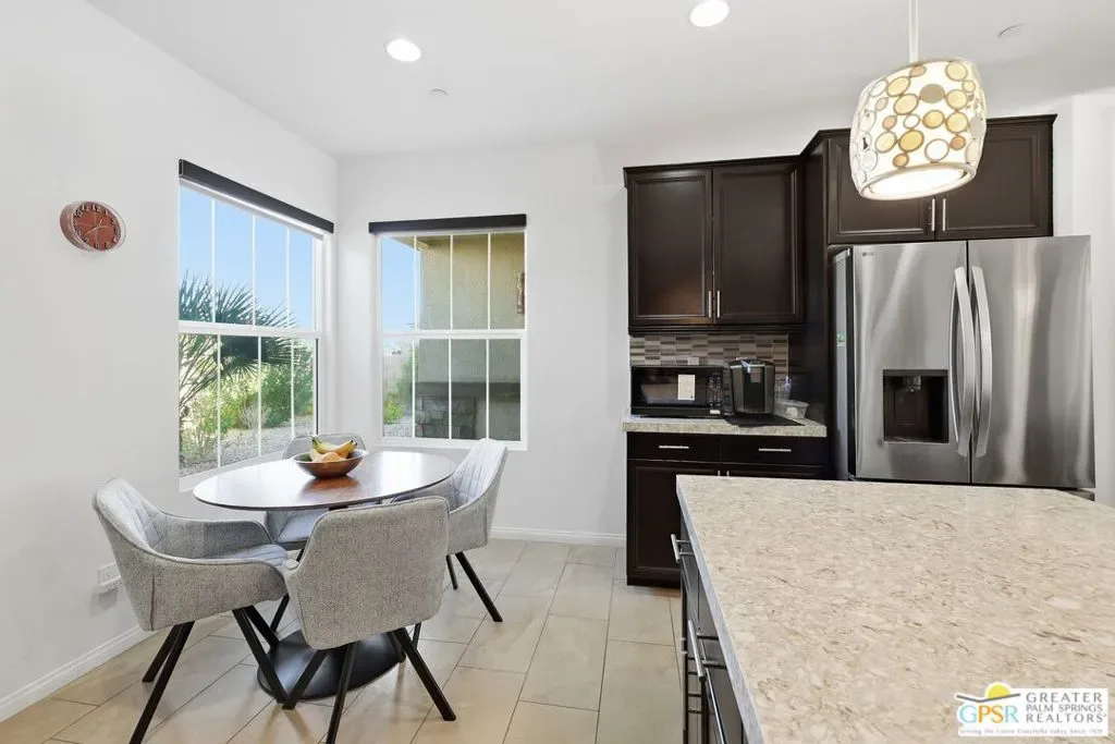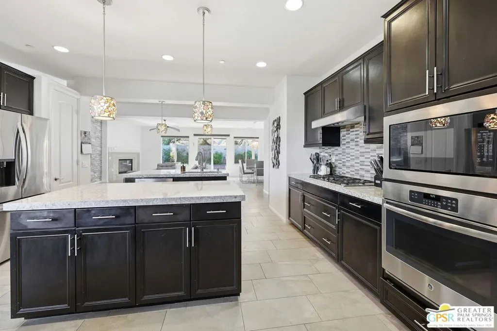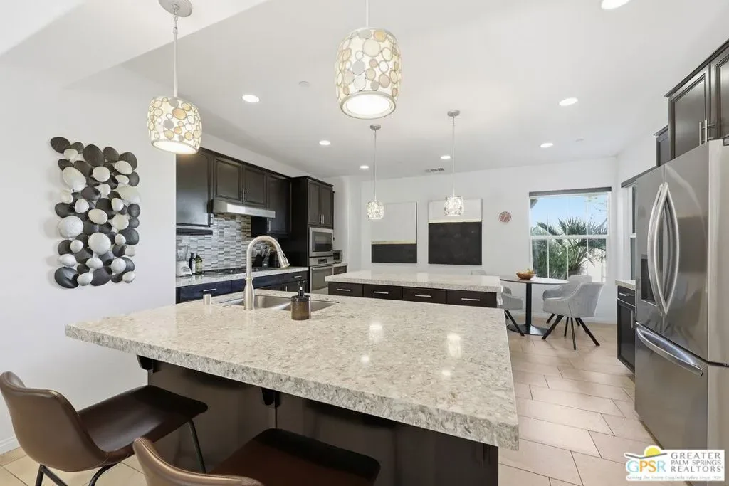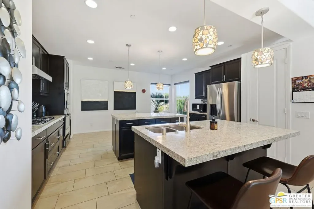 Welcome to 1233 Oro Ridge, a 4-bedroom, 4-bathroom residence in the sought-after, gated Mountain Gate community of Palm Springs. Surrounded by striking mountain views, this home offers the ideal balance of desert tranquility and easy access to city amenities. Built in 2014, this property was one of the original model homes for the final phase of the community and includes all builder upgrades. The bright, open-concept layout is filled with natural light and designed for both comfortable everyday living and effortless entertaining. The thoughtfully designed floor plan provides excellent separation of space, featuring three generously sized bedrooms plus a private casita accessible through the front courtyard perfect, for guests, multigenerational living, or a home office. With four bathrooms, flexibility and convenience are built into every corner of the home. At the heart of the home is a spacious chef’s kitchen featuring dual islands, quartz countertops, and ample storage ideal for gatherings large and small. Additional highlights include leased solar, plus separate solar heating for the LARGE pool and spa, enhancing both efficiency and comfort. Mountain Gate residents enjoy resort-style amenities including community pools and spas, tennis courts, and basketball courts. Ideally located just minutes from downtown Palm Springs, shopping, dining, golf, scenic hiking trails, and close proximity to the CV Link, this home is perfectly suited as a full-time residence, seasonal escape, or investment opportunity.1233 Oro Ridge delivers space, style, and location capturing the very best of Palm Springs living.