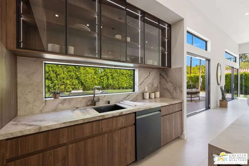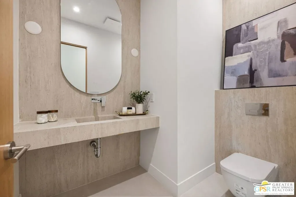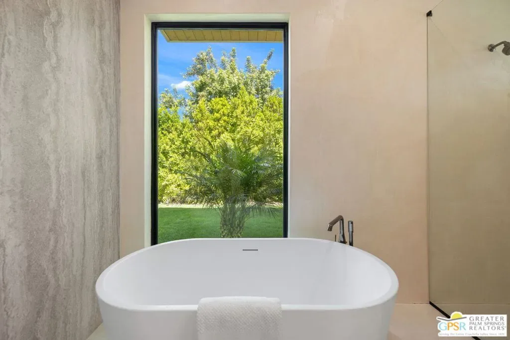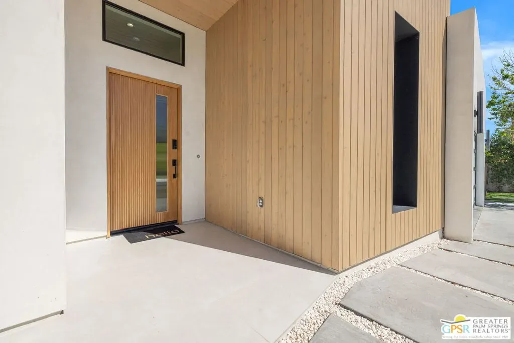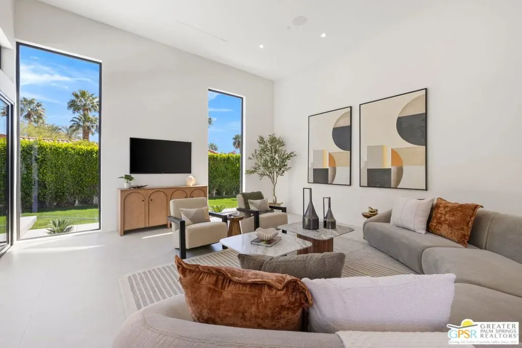 Freshly finished, this architecturally striking ultra-modern residence brings a bold contemporary presence to Palm Springs’ desirable Movie Colony East neighborhood. Designed with clean lines, soaring ceilings, and walls of glass that frame the dramatic west-facing views of Mt. San Jacinto, the home offers approximately 2,500 square feet of refined indoor/outdoor living with four bedrooms and three-and-a-half baths. Set on fee land with no HOA, the property blends privacy with a prime location just minutes from the restaurants, galleries, and energy of downtown Palm Springs. Inside, porcelain tile flooring, sleek cabinetry, and refined modern finishes reinforce the home’s minimalist design aesthetic. The open-concept living and dining areas flow seamlessly toward the outdoors, where multiple conversation spaces surround the newly built pool and spa, creating a true resort-style environment. At the heart of the home, the chef’s kitchen centers around an oversized island and features KitchenAid appliances, smart lighting, and modern cabinetry designed for both everyday living and entertaining. The thoughtful layout provides excellent bedroom separation for privacy. The Primary Suite opens directly to the pool terrace through dual sliding doors and features a walk-in closet and spa-inspired bath with soaking tub and walk-in shower. Junior Ensuite Two enjoys views and its own private bath, while Bedrooms Three and Four capture mountain views and share convenient access to a beautifully appointed bath. A powder room serves guests. Modern comforts continue throughout with upgrades including a Sonos sound system, Grohe plumbing fixtures, Lutron lighting controls, and wireless-enabled pool equipment. A rare opportunity to enjoy brand-new modern architecture in one of Palm Springs’ most sought-after neighborhoods where design, privacy, and mountain views converge.