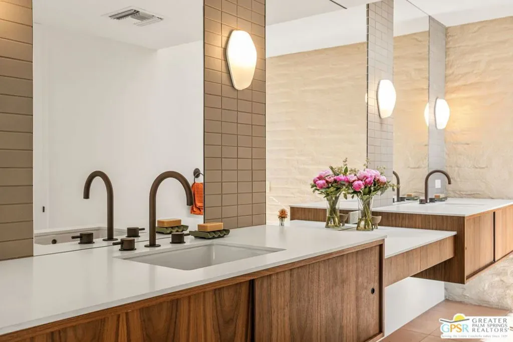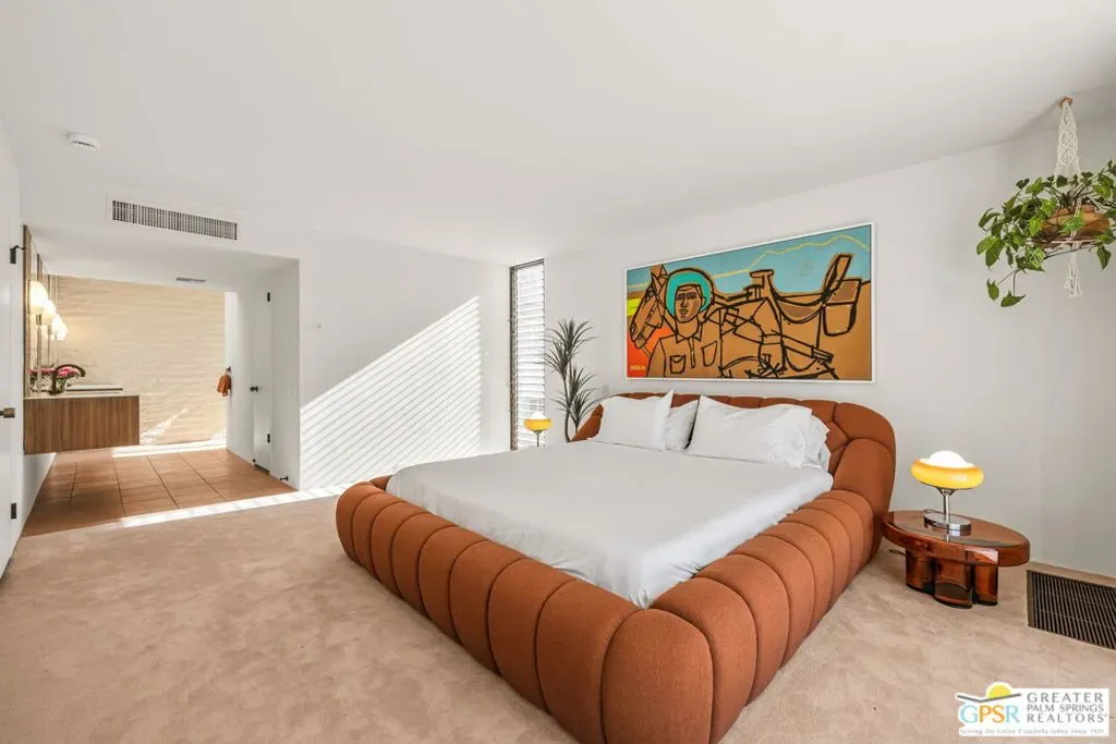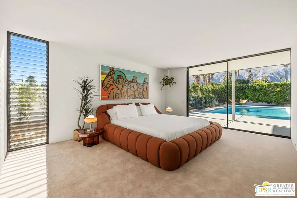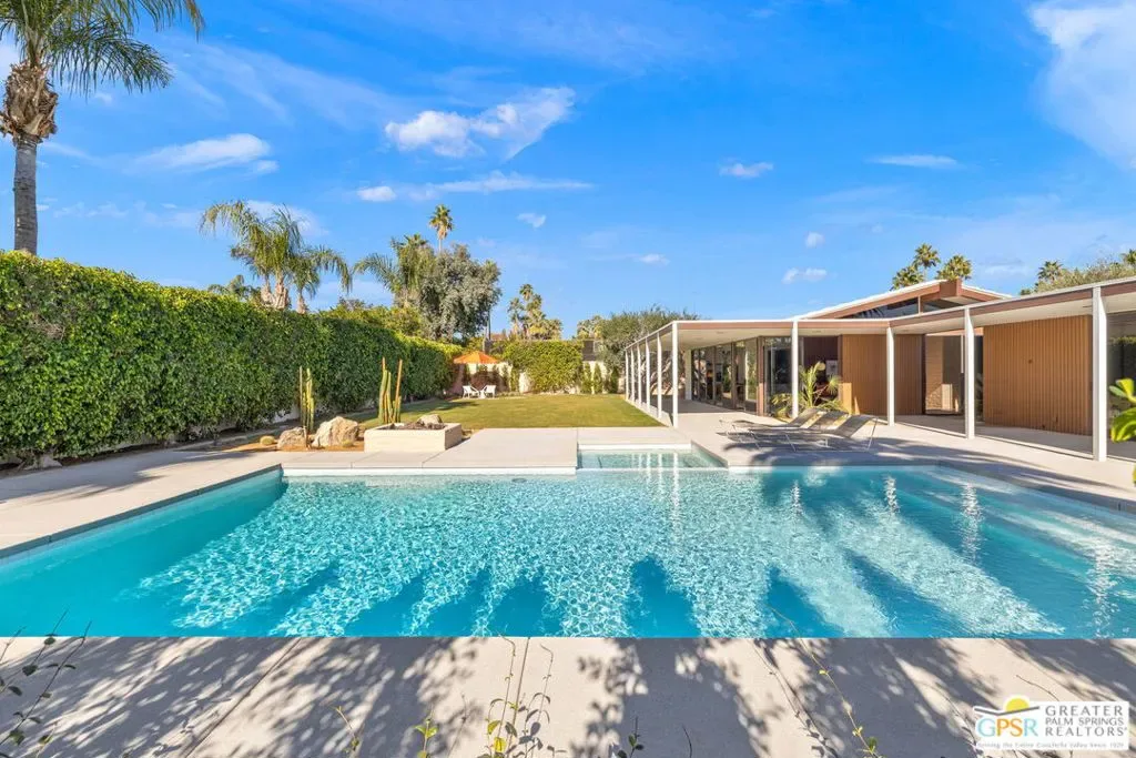 Designed in 1969 by Hugh Kaptur, AIA, and thoughtfully restored in 2025 with his blessing, this exceptional single-level post-and-beam residence reflects the architectural clarity and restraint that define Kaptur’s most enduring work. Located on an ultra-private cul-de-sac in the heart of Movie Colony, the home honors its pedigree while presenting with renewed integrity. Clean lines, open-plan interiors, and rhythmic colonnades establish a strong architectural framework, while expansive walls of floor-to-ceiling glass and sliding doors dissolve the boundary between indoors and out. Mountain views unfold to the west, with nearly every room opening directly to the landscape. The light-filled living room is a signature moment defined by vaulted, exposed-beam ceilings, warm wood-paneled walls, integrated built-ins, and a substantial fireplace anchoring the space. Clerestory windows and a serene interior atrium further enhance this area’s connection to light and nature. The adjacent kitchen is crowned by floating light panels and features Walnut cabinetry, stone countertops, Fisher & Paykel appliance suite, and a pass-through to the dining area reinforcing the home’s original modernist flow. All primary living spaces extend to a covered patio overlooking the ultra-private south and west-facing backyard, where Mount San Jacinto views frame a pool and spa, open-air fireplace, and generous lawn creating an elegant extension of the architecture itself. The west-facing Primary Ensuite opens directly outdoors and includes dual sinks, a south-facing walk-in shower with views, and a custom walk-in closet. Junior Ensuite Two opens to the front courtyard and enjoys a private bath with walk-in shower. Bedroom Three offers pool and mountain views, while a hallway powder bath serves guests. Just moments from downtown Palm Springs, this is a rare opportunity to own an authentic, architect-restored Kaptur residence in one of the city’s most cherished neighborhoods. Ideal for full or seasonal enjoyment as well as those seeking a prominent short-term vacation rental.