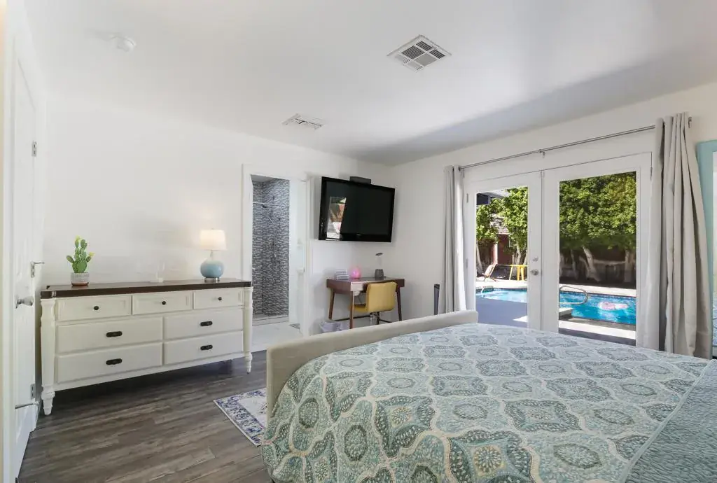 Turnkey Airbnb…What a great location in the neighborhood of Sunrise Park! This large 4 bedroom,3 baths (One of the bedrooms is a detached casita with private entrance/bath and patio) Two car garage.The feeling of secluded estate privacy around the pool, with mountain views. This property is located in the heart of central Palm Springs! The famous PS Strip is nearby, One block from the Camelot theater, farmers market, new college, parks & library or a whole host of shops in any direction. This home offers a beautiful Luxury vinyl plank flooring leading you through the open floor plan of expansive rooms, with formal dining, updated kitchens & baths, newer appliances and a lot of little extras, like solar tubes & skylights, dual-panel windows & doors, whole house water filtration and much more. This home is light and bright inside every room, and with multiple French doors, just swing open to the rear large covered patio and enjoy the tranquility of the gardens, fruit trees, saltwater pool & spa, or maybe a bit of relaxing around the fire pit. Two car garage and huge yard with LED lighting under the trees… All the pleasures of Palm Springs living are right here – Five minutes to Downtown, Airport, Golfing, Tennis, Hiking, Grocery store, Gym, Casino, restaurants, 10min to Tramway. Private fully fenced backyard. Pebble-tec saltwater Pool and Spa. One of the bedrooms is a casita with kitchenet, bathroom and private entrance with its own private patio. This property is a very successful Airbnb. Shown by appointment only. NO HOA.