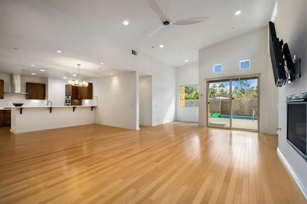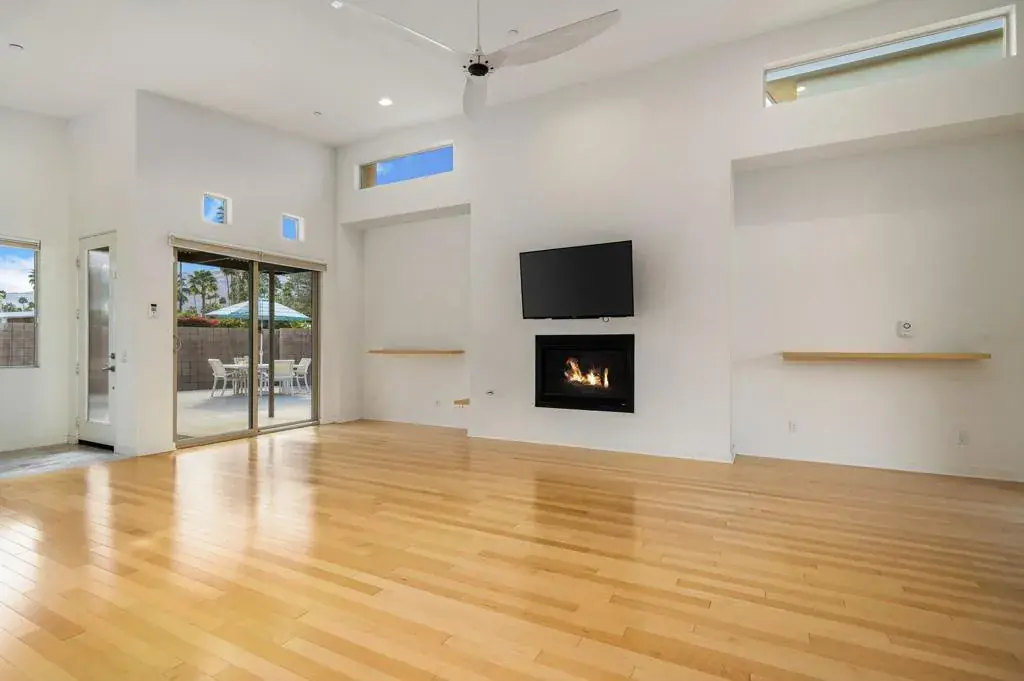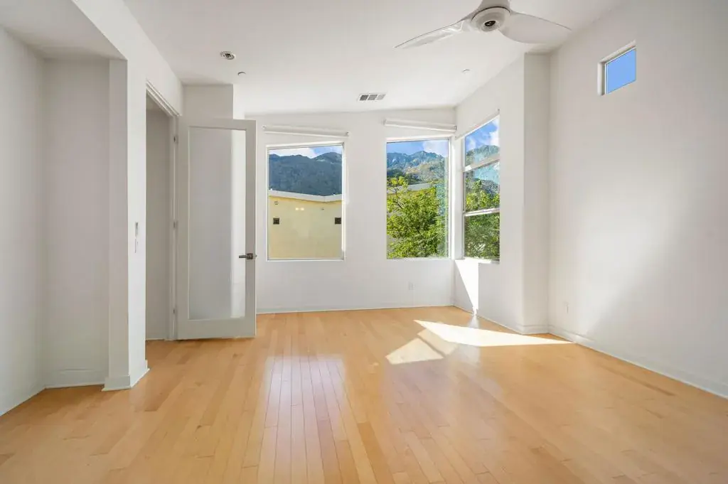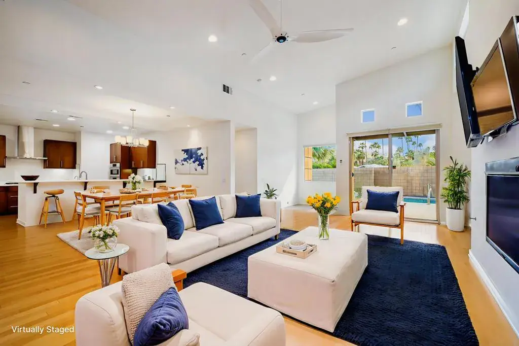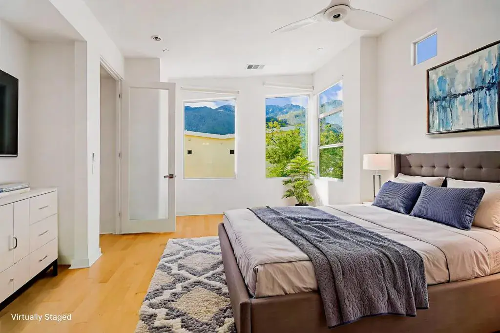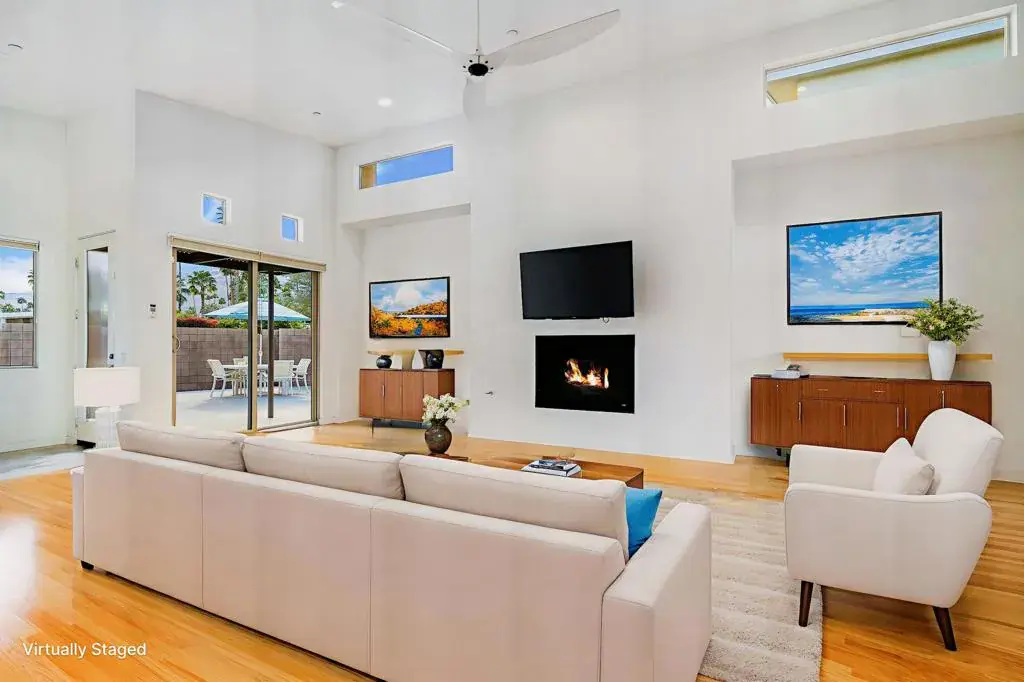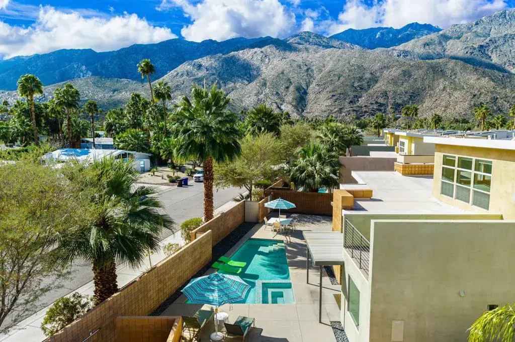 Bordering the iconic Twin Palms neighborhood in Palm Springs, this is a rare offering within the boutique Oceo community–where only nine single-family homes exist. Designed by renowned architect Jim Cioffi, AIA, this home sits on an expansive lot that stretches from Oceo Circle South to Twin Palms Drive–an uncommon footprint that creates exceptional space and separation between neighbors. The primary views overlook the established, single-story homes of Twin Palms, enhancing both privacy and architectural charm.A marble and French limestone entry sets a sophisticated tone, opening to a dramatic great room defined by soaring ceilings, clerestory windows, warm wood floors, and expansive sliding glass doors. The seamless indoor-outdoor flow is quintessential Palm Springs–anchored by a south-facing, professionally restored saltwater pool and spa that enjoy sun all day long. Panoramic San Jacinto Mountain views frame the backdrop, while a generous wraparound patio invites effortless outdoor entertaining.The main-level primary suite is a private retreat with direct pool access and stunning mountain views. Its marble-clad bath features a sunken soaking tub, oversized walk-in shower with dual shower heads, dual vanities, custom cabinetry, and a spacious walk-in closet. Also on the main level: a dedicated dining area with wet bar, a sleek modern kitchen equipped with BOSCH built-in microwave and oven, BOSCH lighted vent hood, five-burner gas cooktop, oversized KitchenAid refrigerator, pantry, powder room, and a separate laundry room with sink. A gas fireplace with logs adds warmth and ambiance to the living space.Upstairs, two junior ensuite bedrooms offer high ceilings, private baths, and expansive views. One suite features a sitting area, large walk-in closet, and access to a south-facing sun deck showcasing sweeping 180-degree vistas of Twin Palms’ celebrated mid-century architecture and surrounding mountains.Built in 2015 and lovingly maintained by its original owner–never rented–this home blends modern efficiency with timeless design. Features include owned solar, dual-zoned Carrier HVAC, a Bradford White 75-gallon water heater, Hague Watermax filtration system, custom Hunter Douglas blinds, authentic Big Ass Fans throughout, wood flooring, and an attached two-car garage. Approximately $20,000 in thoughtful upgrades further elevate the home’s comfort and style. Low HOA’s of $312/mo.