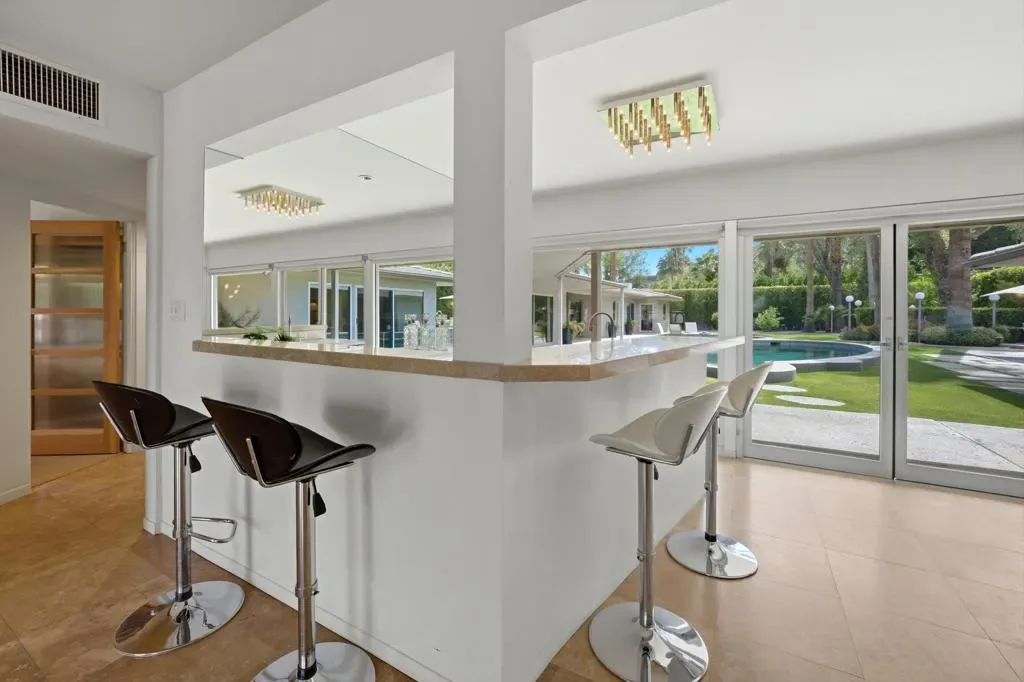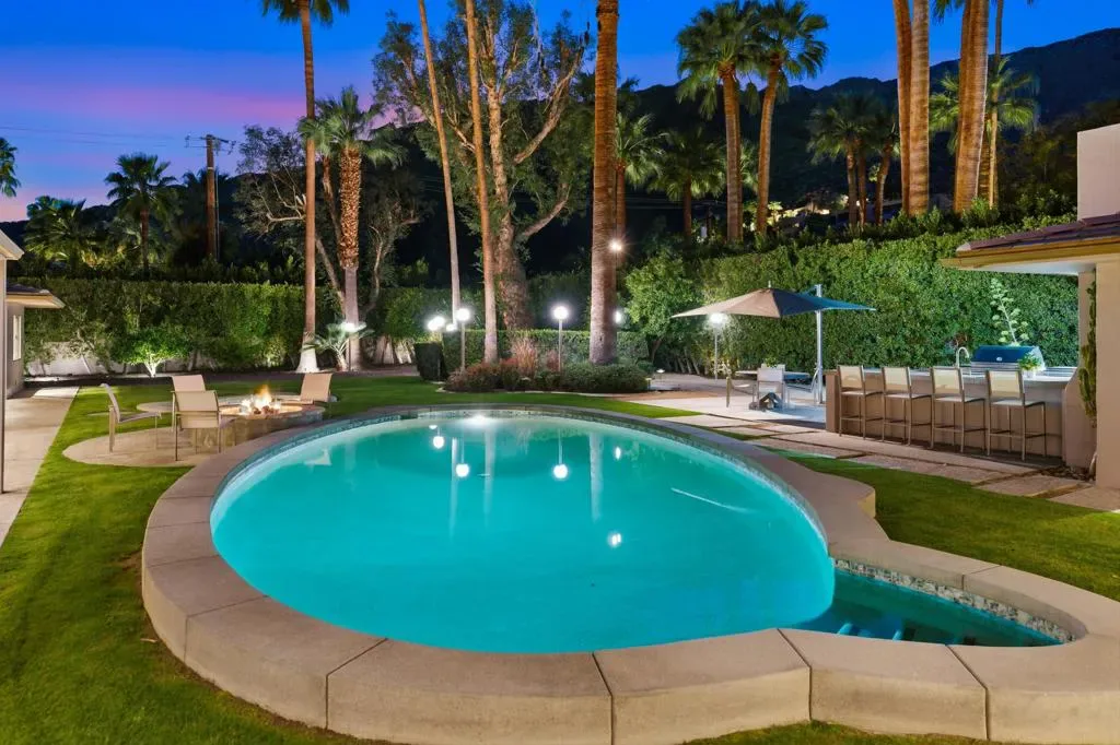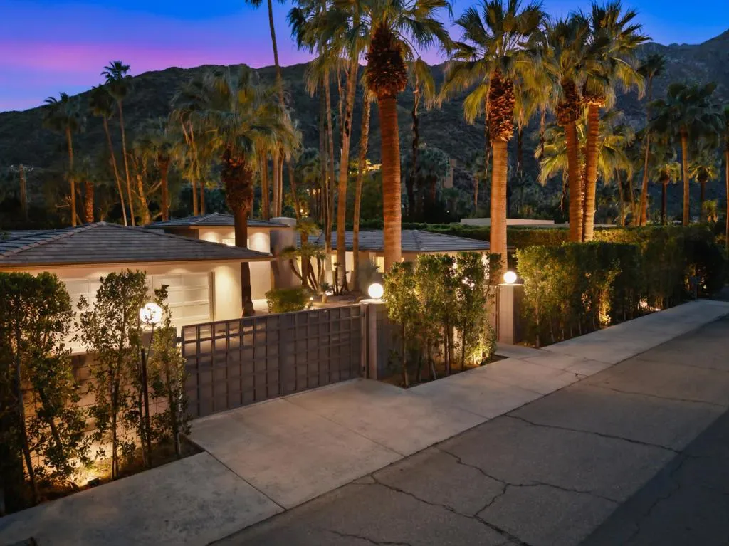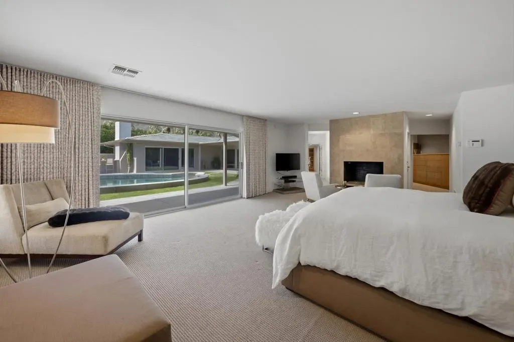 Located in the prestigious Old Las Palmas neighborhood in the heart of Palm Springs, this remarkable desert estate blends classic Palm Springs glamour with modern luxury. Once owned by legendary actress and comedian Lily Tomlin, the ”Lily Pad” carries a touch of Hollywood history within one of the city’s most iconic celebrity enclaves. Originally built in 1952 and thoughtfully reimagined for modern living, the estate spans approximately 4,671 square feet on more than half an acre of lush, gated grounds. Inside, sunlit interiors unfold through expansive living and entertaining spaces offering an atmosphere that is both sophisticated and relaxed – quintessential Palm Springs glamour with a contemporary edge. This home features 4 bedrooms, 7 bathrooms and thoughtfully designed living spaces with rich travertine tile flooring that create an inviting yet sophisticated atmosphere throughout. The heart of the home has a beautifully appointed chef’s kitchen with custom cabinetry and stainless-steel features that include countertops, backsplash and huge refrigerator/freezer. High-end appliances include 2 Meile dishwashers and Viking double oven & gas cooktop. There is a seamless flow between the great room & family room, both designed for effortless entertaining, showcasing two of the home’s five fireplaces, a stylish wet bar, and Fleetwood sliding doors opening to the spectacular resort-style backyard. The home’s four bedrooms include a luxurious ensuite primary offering a serene private escape, complete with a cozy fireplace, elegant custom drapery, and direct access to the backyard. Two other ensuite guest bedrooms, thoughtfully separated from the primary bedroom, offer guests their own private living space. Adding to the compound’s appeal, the estate was expanded with the construction of a nearly 1,000-square-foot guest house, complete with its own living area with fireplace, spacious bedroom suite and dramatic views of the surrounding desert mountains. Lily Pad’s outdoor space reveals the estate’s true magic. The resort-style grounds are centered around a custom pool and spa, with shaded lounge areas, a beautiful natural stone fireplace, outdoor kitchen, pool bathroom, and iconic desert mountain views. Towering palms and manicured landscaping evoke the golden age of Hollywood retreats. This exceptional property offers a rare opportunity to own a piece of Palm Springs’ storied past while enjoying the comfort and elegance of a fully reimagined desert estate.