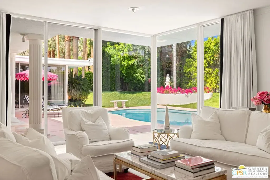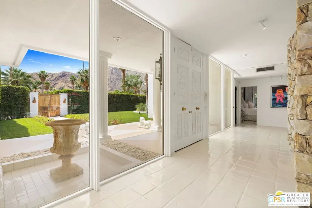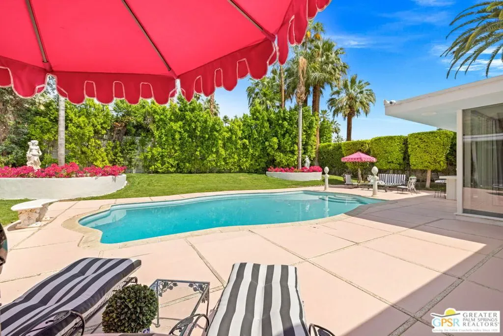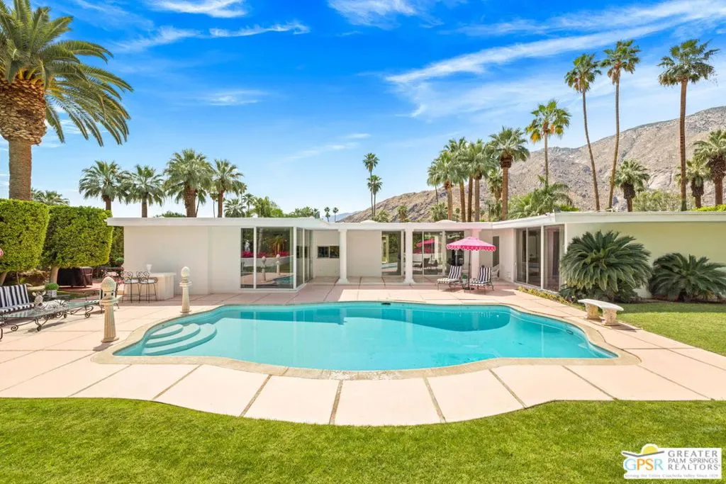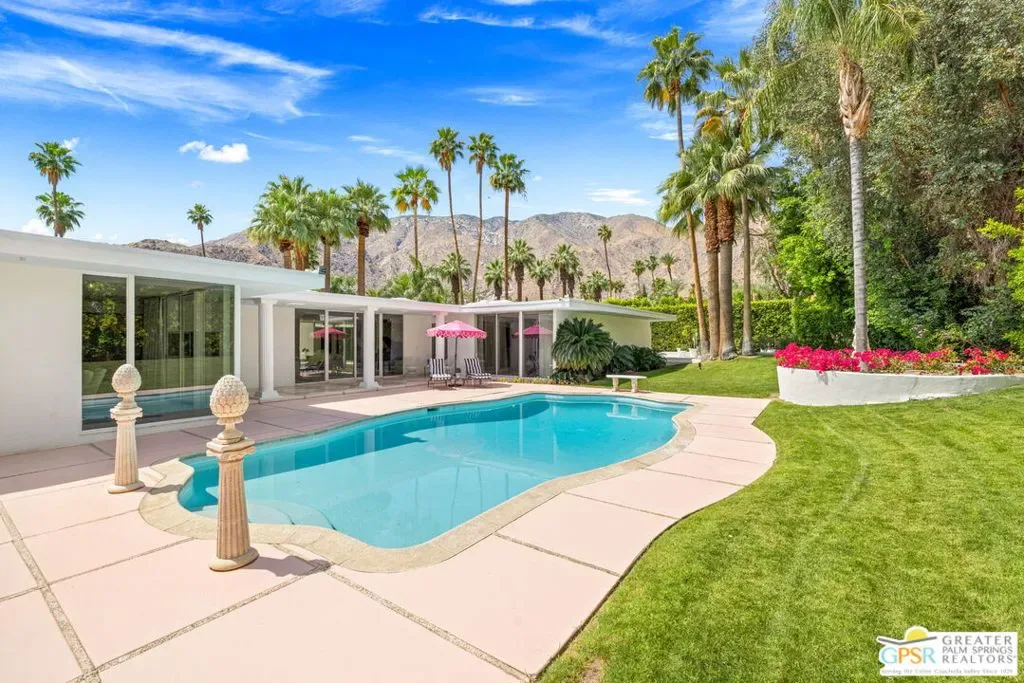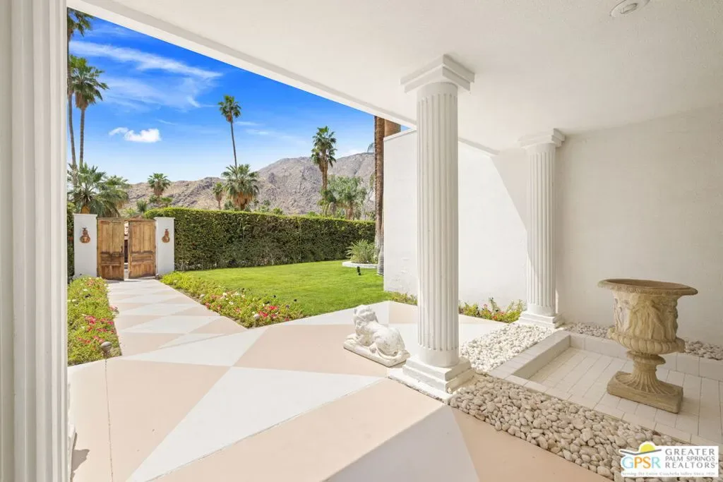 Set within the iconic Old Las Palmas neighborhood – long favored by Hollywood’s elite and prized for its close proximity to downtown Palm Springs’ restaurants, retailers, and entertainment – this ultra-private Hollywood Regency residence captures the essence of classic desert living on an estate-sized lot with magnificent mountain views. Originally designed by Robert Marx, son of Gummo Marx of the legendary Marx Brothers, this residence carries a subtle Hollywood lineage that reflects the glamour and creative spirit of its era. A formal entry framed by floor-to-ceiling glass introduces interiors filled with light and connection to the outdoors. The expansive living room, anchored by a gas fireplace, opens to the backyard through sliding glass doors flanked by floor to ceiling windows while an adjacent formal dining room and adjacent bar create a natural flow for gatherings. A separate family room offers additional living space, also oriented toward the lush, private grounds. The kitchen is thoughtfully positioned for both function and flow, offering a casual sitting area, generous storage, and a dedicated space with built-in wine refrigeration – ideal for both everyday living and entertaining support. The bedroom layout offers flexibility and separation. The Primary Suite opens to the backyard and features a spa-like bath and walk-in closet. Bedrooms Two and Three enjoy west-facing exposure with direct outdoor access and a shared bath, while Bedroom Four (currently styled as an entertainment suite) can easily adapt to a variety of uses and the plumbing is already in place to add an ensuite bath. Outside, mature landscaping surrounds the home, creating a private resort-like setting. The south-facing front yard captures stunning mountain views, while the backyard offers space to relax, entertain, and enjoy the quiet beauty of the desert. A rare opportunity to reimagine a classic Hollywood Regency residence in one of Palm Springs’ most prestigious and desired neighborhoods.