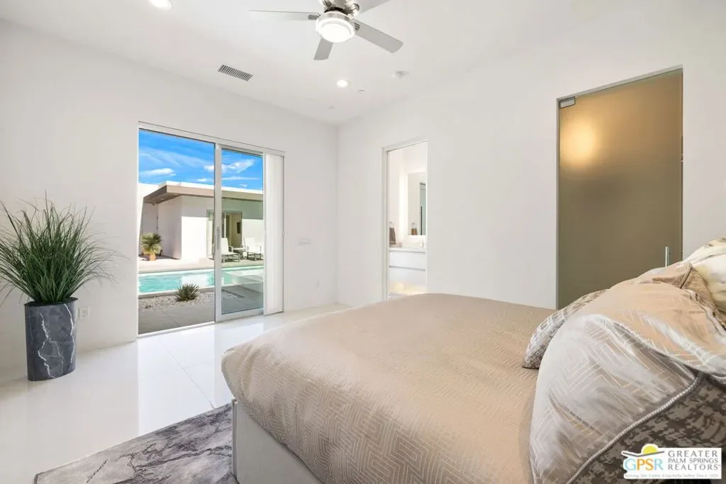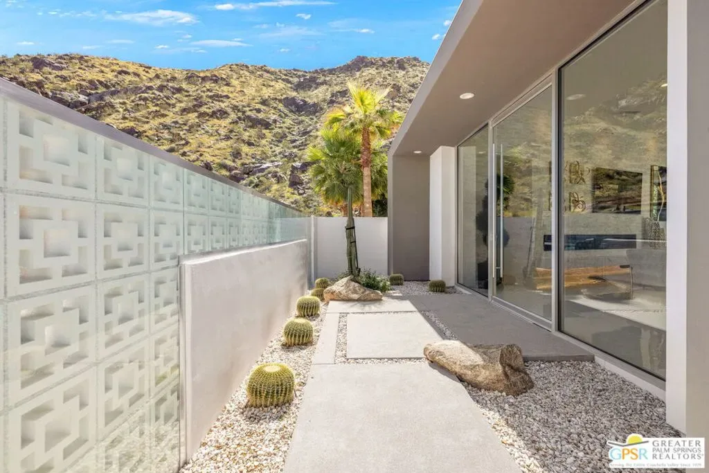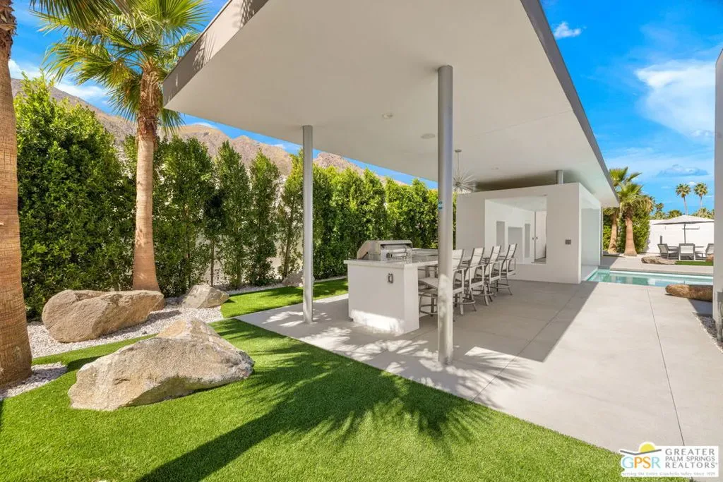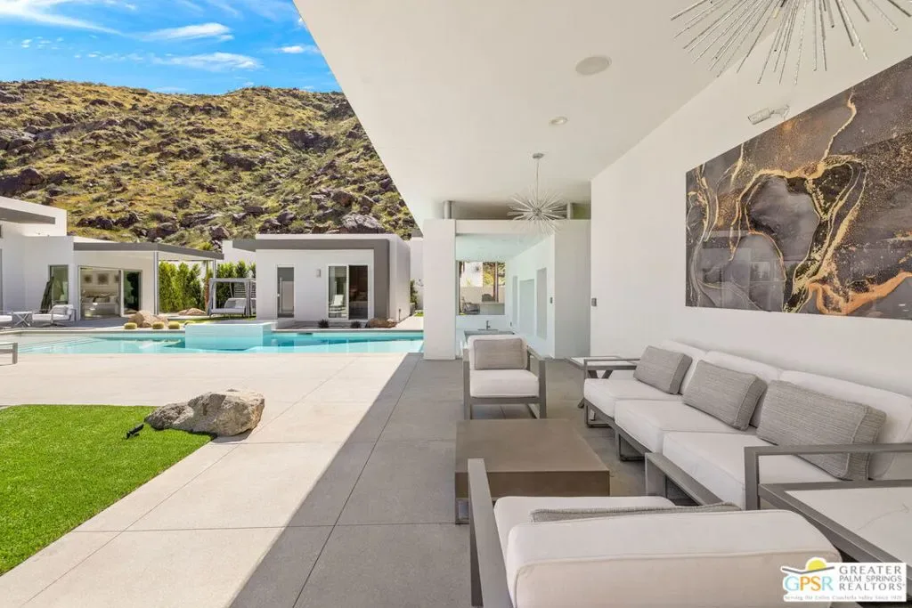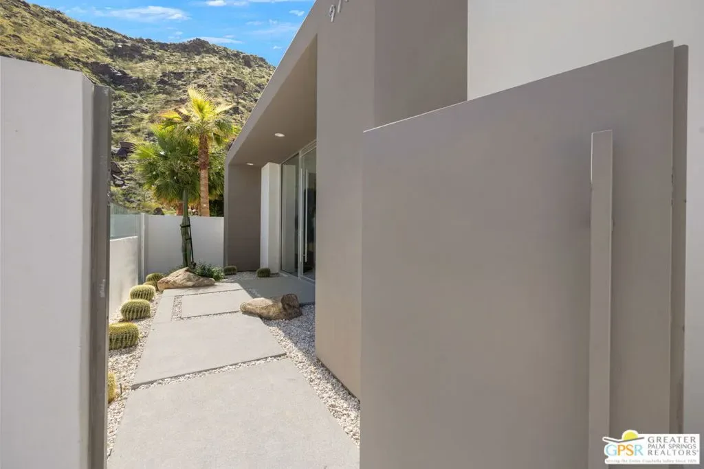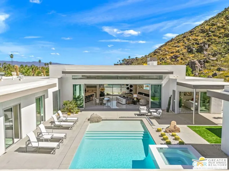 Set within the exclusive gated enclave of ONE Las Palmas in coveted Old Las Palmas, this architecturally striking modern compound captures dramatic, up-close views of the San Jacinto mountains and the iconic Dry Falls. This enhanced residence blends mid-century inspiration with contemporary execution, delivering privacy, scale, and a true resort-caliber lifestyle just moments from downtown Palm Springs. Completed and furnished in 2025 and lightly enjoyed as a private retreat, the home offers a rare sense of newness paired with thoughtful upgrades throughout. Walls of glass, soaring ceilings with clerestory windows, and expansive sliding doors create seamless indoor/outdoor living, filling the interiors with natural light while framing the surrounding landscape. Outdoor living is exceptional. A dramatic pool setting is anchored by an expansive cabana complete with lounge, swim-up bar, bath, BBQ island, and outdoor shower designed for entertaining at scale or relaxing in total privacy. At the center of the home, a gourmet kitchen with oversized island, Cambria quartz surfaces, dual dishwashers, and a full Wolf and Sub-Zero appliance suite opens to the living and dining areas, all oriented toward the pool terrace where the lifestyle unfolds. A generous walk-in pantry enhances both function and entertaining capacity. The floor plan offers excellent separation, with a private Primary Suite wing featuring mountain views, direct pool access, spa-like bath, and Lutron-controlled shades, along with a dedicated work area and powder bath. On the opposite side of the residence, two additional ensuites connect to a flexible media or wellness space, while a detached casita provides a true guest retreat. Infrastructure and efficiency are equally impressive, including 30 solar panels paired with two Tesla Powerwall batteries, four-zone HVAC, integrated audio, full security system, EV charging prep, and upgraded construction finishes throughout. Offered TURNKEY FURNISHED and never rented, this is a rare opportunity to own one of the most compelling modern estates in Old Las Palmas – where architecture, privacy, and lifestyle converge at the highest level.