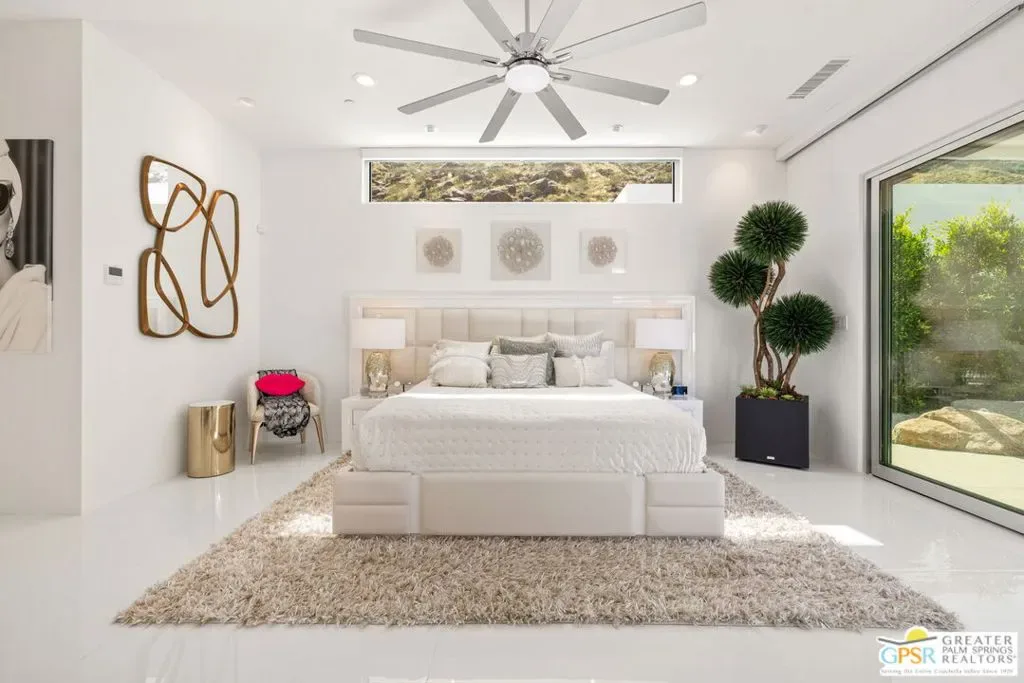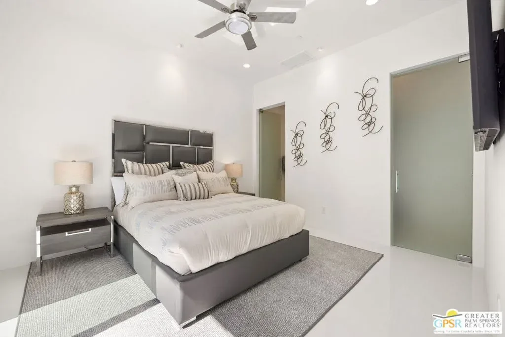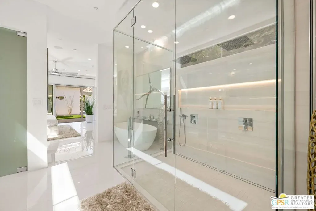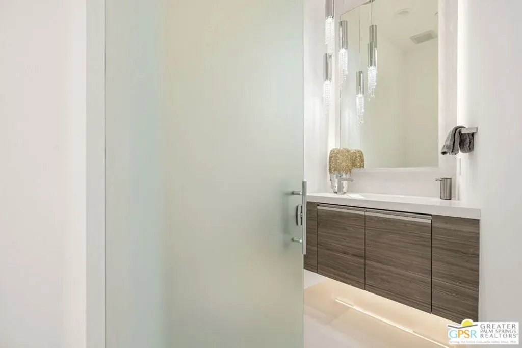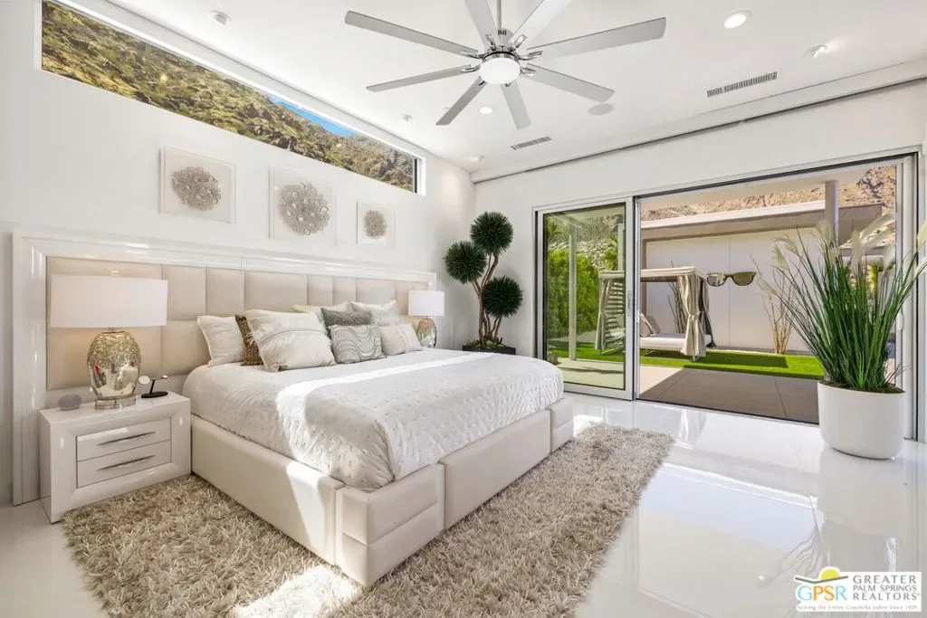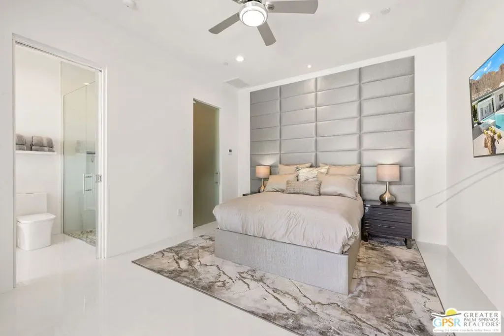 Set within the exclusive gated enclave of ONE Las Palmas in coveted Old Las Palmas, this architecturally striking modern compound captures dramatic, up-close views of the San Jacinto mountains and the iconic Dry Falls. This enhanced residence blends mid-century inspiration with contemporary execution, delivering privacy, scale, and a true resort-caliber lifestyle just moments from downtown Palm Springs. Completed and furnished in 2025 and lightly enjoyed as a private retreat, the home offers a rare sense of newness paired with thoughtful upgrades throughout. Walls of glass, soaring ceilings with clerestory windows, and expansive sliding doors create seamless indoor/outdoor living, filling the interiors with natural light while framing the surrounding landscape. Outdoor living is exceptional. A dramatic pool setting is anchored by an expansive cabana complete with lounge, swim-up bar, bath, BBQ island, and outdoor shower designed for entertaining at scale or relaxing in total privacy. At the center of the home, a gourmet kitchen with oversized island, Cambria quartz surfaces, dual dishwashers, and a full Wolf and Sub-Zero appliance suite opens to the living and dining areas, all oriented toward the pool terrace where the lifestyle unfolds. A generous walk-in pantry enhances both function and entertaining capacity. The floor plan offers excellent separation, with a private Primary Suite wing featuring mountain views, direct pool access, spa-like bath, and Lutron-controlled shades, along with a dedicated work area and powder bath. On the opposite side of the residence, two additional ensuites connect to a flexible media or wellness space, while a detached casita provides a true guest retreat. Infrastructure and efficiency are equally impressive, including 30 solar panels paired with two Tesla Powerwall batteries, four-zone HVAC, integrated audio, full security system, EV charging prep, and upgraded construction finishes throughout. Offered TURNKEY FURNISHED and never rented, this is a rare opportunity to own one of the most compelling modern estates in Old Las Palmas – where architecture, privacy, and lifestyle converge at the highest level.