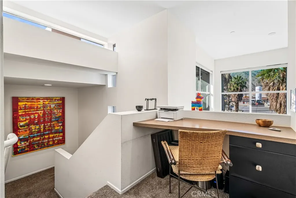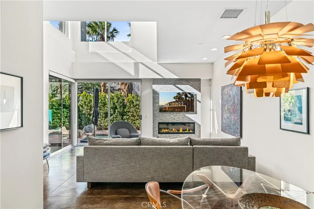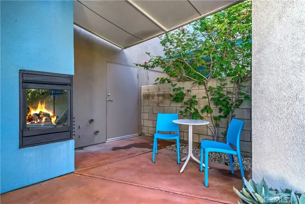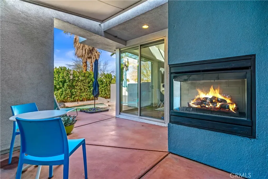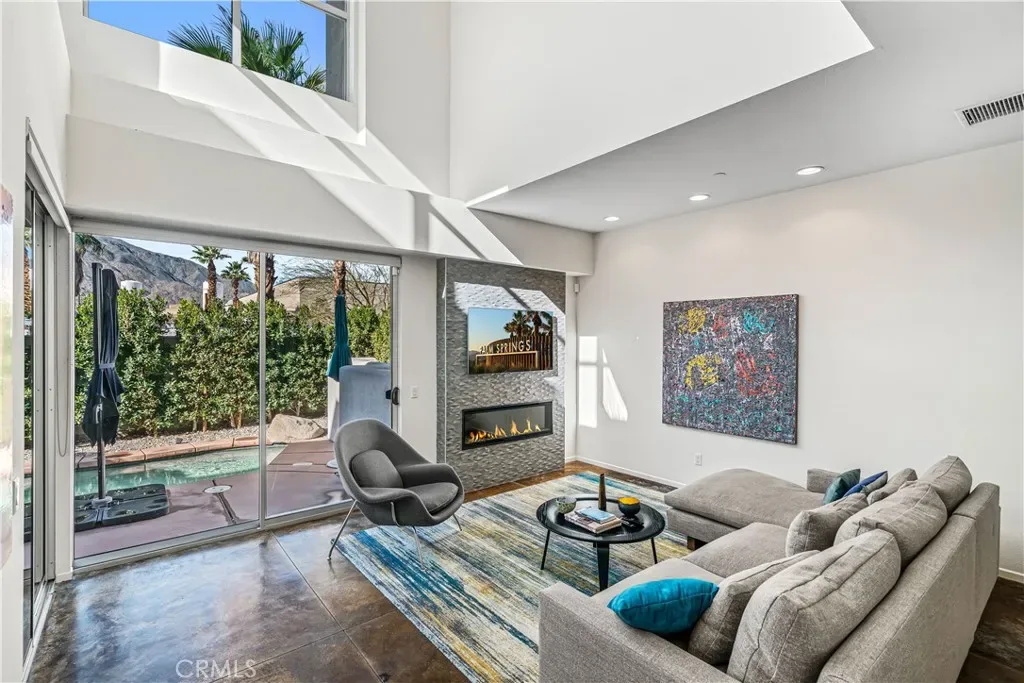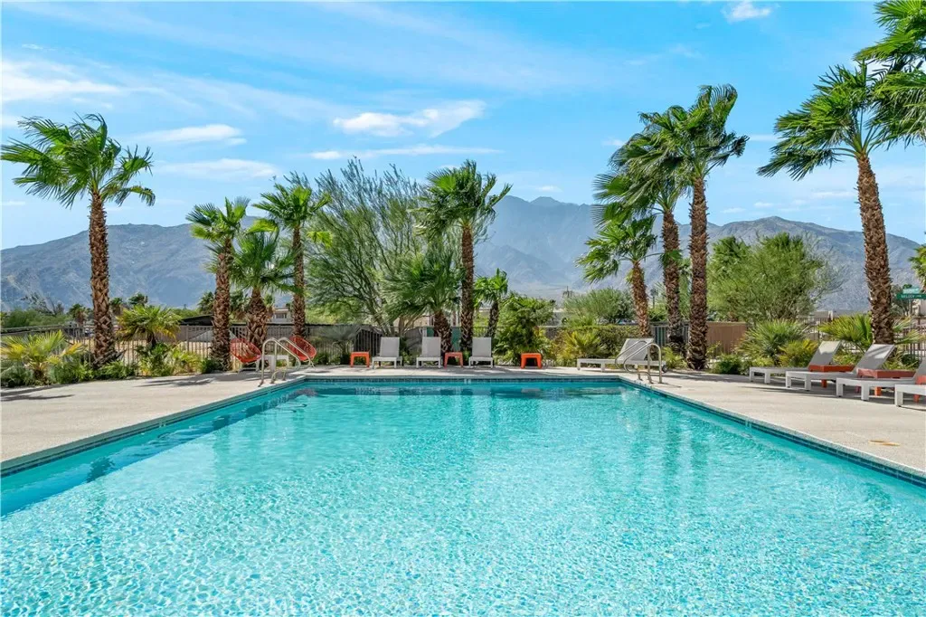 Welcome home to Palm Springs and affordable, luxury living at its finest… enter this gated community and experience all that indoor/outdoor desert living can offer… The home – on fee land you own, no lease – features doors and walls of glass that fill the vaulted main living space with light and offer mountain views. Its open floor plan creates an entertaining space warmed by a fireplace inside while the large glass doors beckon you outside to enjoy a private pool and spa with yet another fireplace. The main living area includes a guest powder room and easy access to the attached, private garage. Upstairs are two en-suite bedrooms – one with a nice outdoor deck. The upstairs also features the washer/dryer closet and an office nook space with mountain views. All of this in a great, gated community with two common pools and spas, a gym, and a clubhouse with a kitchen and pool table great for entertaining. Perfect to live full time, lock it and leave it, or whatever lifestyle fits you best. Don’t miss this wonderful opportunity at a great price. Again, welcome to some of the best Palm Springs living at a great price!