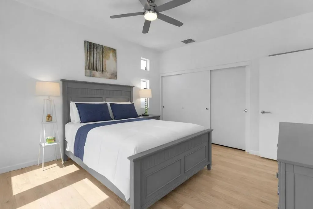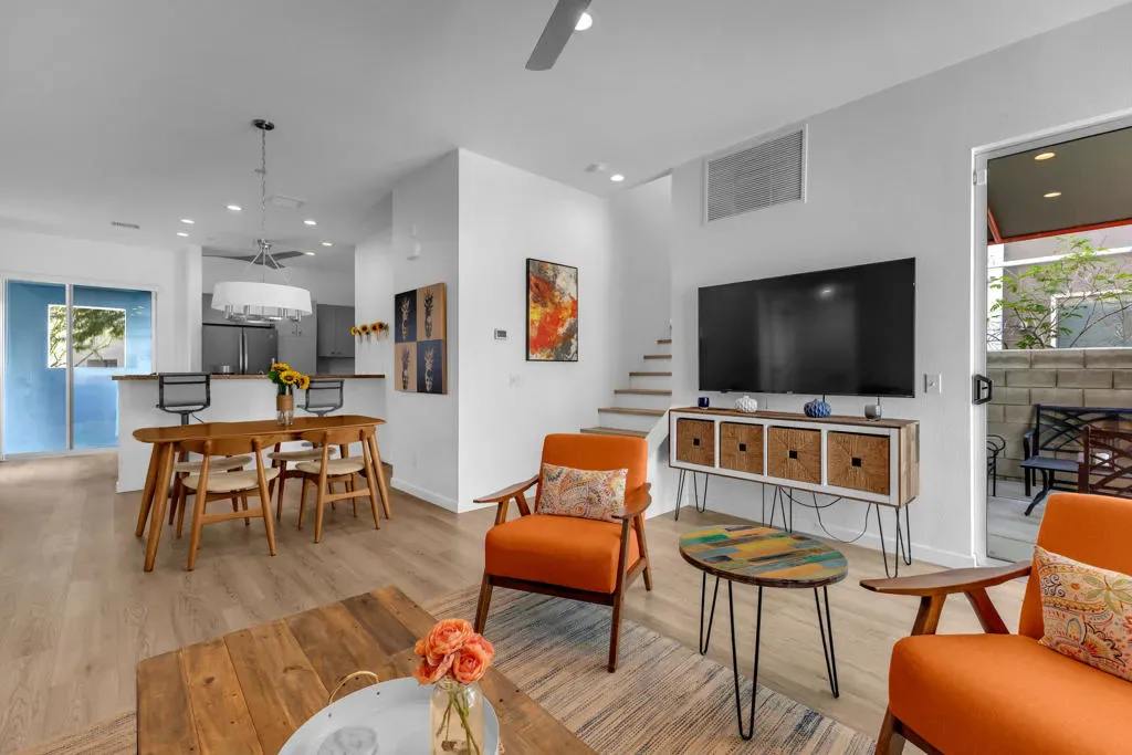 This beautifully maintained Model D floor plan offers modern design and an open-concept layout, nestled in the heart of the highly sought-after Palermo community just 5 minutes from Downtown Palm Springs. This particular unit does not share any adjoining living-space walls on either side, providing an added sense of privacy along with a quieter, more peaceful environment. Enjoy spacious living and dining areas that create an inviting space for both everyday living and entertaining, while the primary suite boasts a private balcony positioned to capture stunning sundeck views of the San Jacinto Mountains. Offered almost entirely furnished (an exclusion list is provided), this home is move-in ready and ideal as a full-time residence, seasonal retreat, or investment opportunity. Residents of Palermo enjoy gated security, a stylish clubhouse with a lounge and billiards table, a fitness center, and two sparkling pools and spas. Low HOA dues cover water, trash, roof, and exterior maintenance. Situated on Fee Land (you own the land), this property offers the perfect blend of resort-style amenities, mountain views, and prime Palm Springs living. A full inspection report was completed in February 2023, and the AC and pool have been serviced since, which provides added peace of mind.