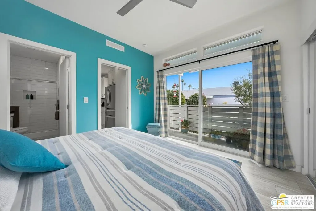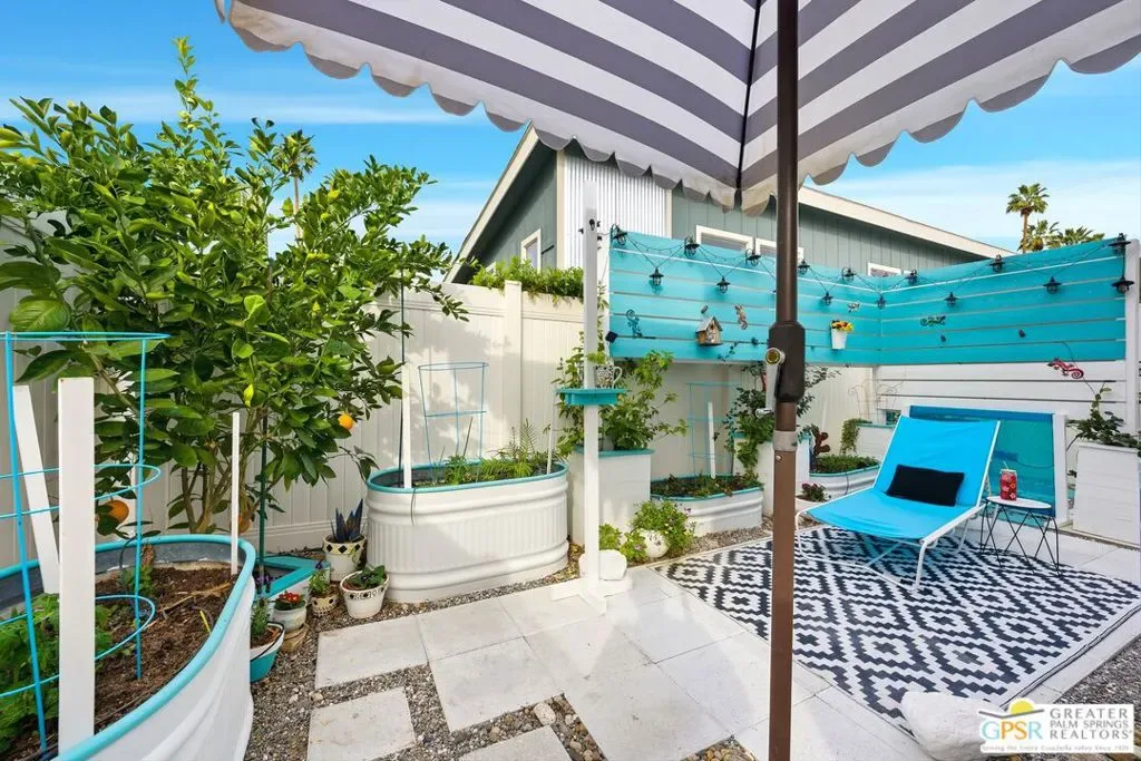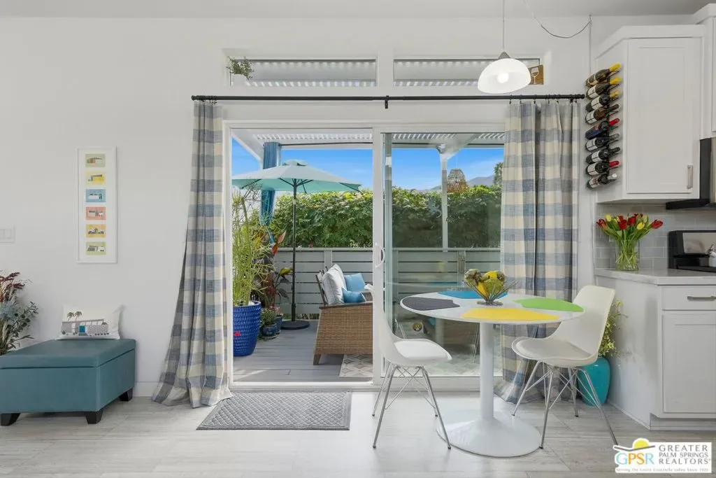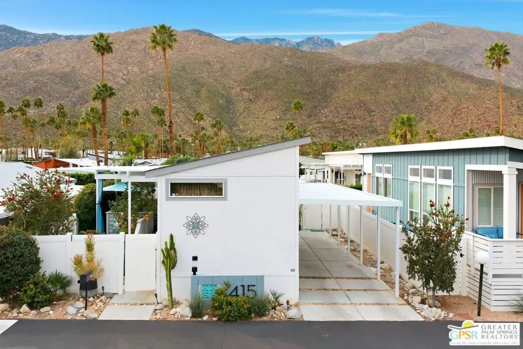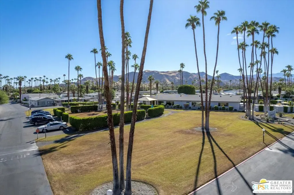 Located on a quiet street within the iconic Palm Springs Mobile Club, this thoughtfully landscaped home offers privacy without compromising spectacular mountain views. Leaning into the sought after mid-century modern design, the home delivers bright, efficient, low-maintenance desert living. Highlights include soaring 9-foot ceilings and clerestory windows that flood the space with natural light. The well-appointed galley kitchen is both stylish and functional. The primary suite features mirrored closets, an ensuite bath with a walk-in shower, and direct access to the outdoors. An expansive extended deck invites seamless indoor-outdoor living ideal for hosting or just relaxing under the desert sky. The fully enclosed yard is thoughtfully designed with outdoor curtains for year-round sun control and raised garden containers for effortless desert gardening, a perfect space for both entertaining and pampered pets. Offered turn-key furnished, this home is move-in ready. Palm Springs Mobile Club is a vibrant and welcoming community rich in amenities, including two dog parks, a pool and spa, fitness center, a clubhouse with dance hall and game room, billiards, shuffleboard, BBQ area, and fire pit, all embracing an exceptional Palm Springs lifestyle.