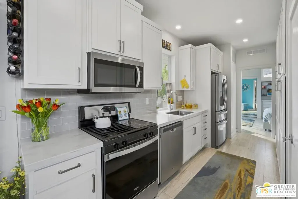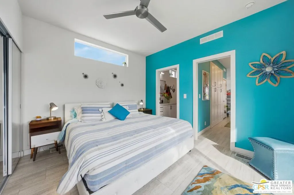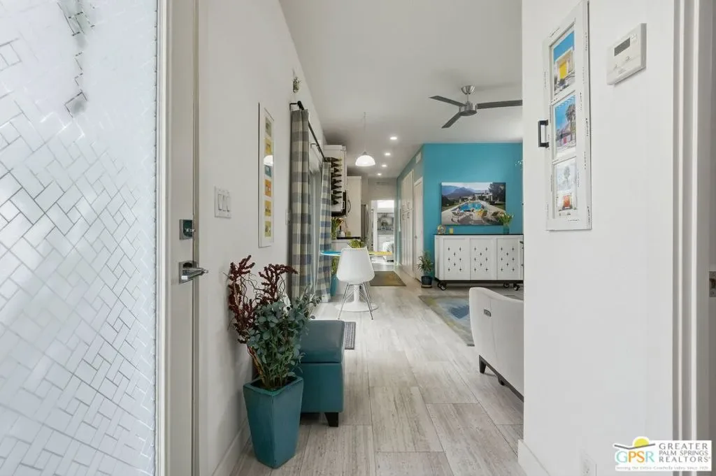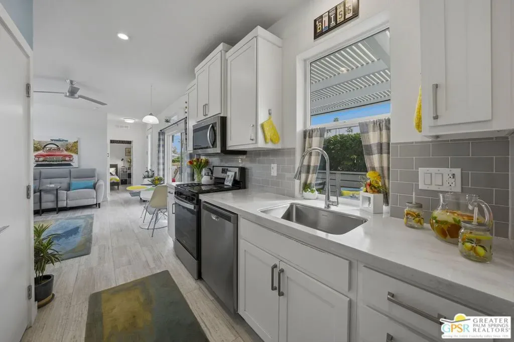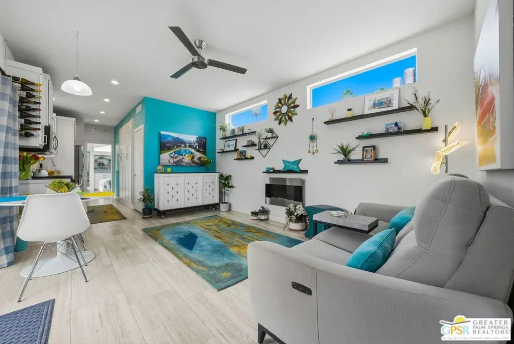 Located on a quiet street within the iconic Palm Springs Mobile Club, this thoughtfully landscaped home offers privacy without compromising spectacular mountain views. Leaning into the sought after mid-century modern design, the home delivers bright, efficient, low-maintenance desert living. Highlights include soaring 9-foot ceilings and clerestory windows that flood the space with natural light. The well-appointed galley kitchen is both stylish and functional. The primary suite features mirrored closets, an ensuite bath with a walk-in shower, and direct access to the outdoors. An expansive extended deck invites seamless indoor-outdoor living ideal for hosting or just relaxing under the desert sky. The fully enclosed yard is thoughtfully designed with outdoor curtains for year-round sun control and raised garden containers for effortless desert gardening, a perfect space for both entertaining and pampered pets. Offered turn-key furnished, this home is move-in ready. Palm Springs Mobile Club is a vibrant and welcoming community rich in amenities, including two dog parks, a pool and spa, fitness center, a clubhouse with dance hall and game room, billiards, shuffleboard, BBQ area, and fire pit, all embracing an exceptional Palm Springs lifestyle.