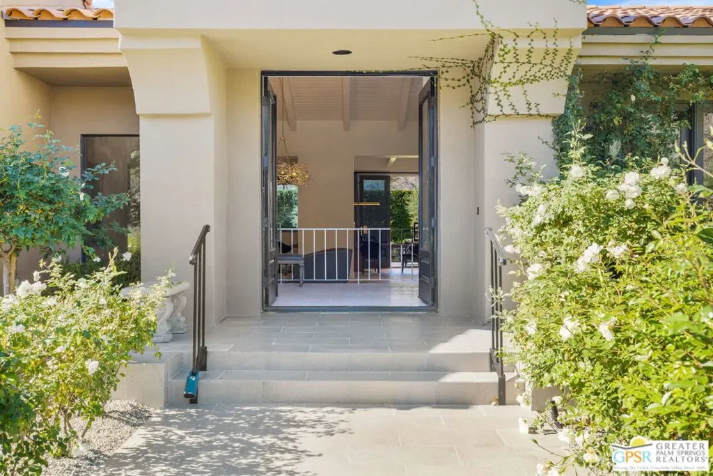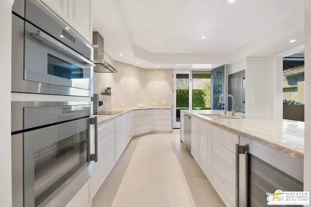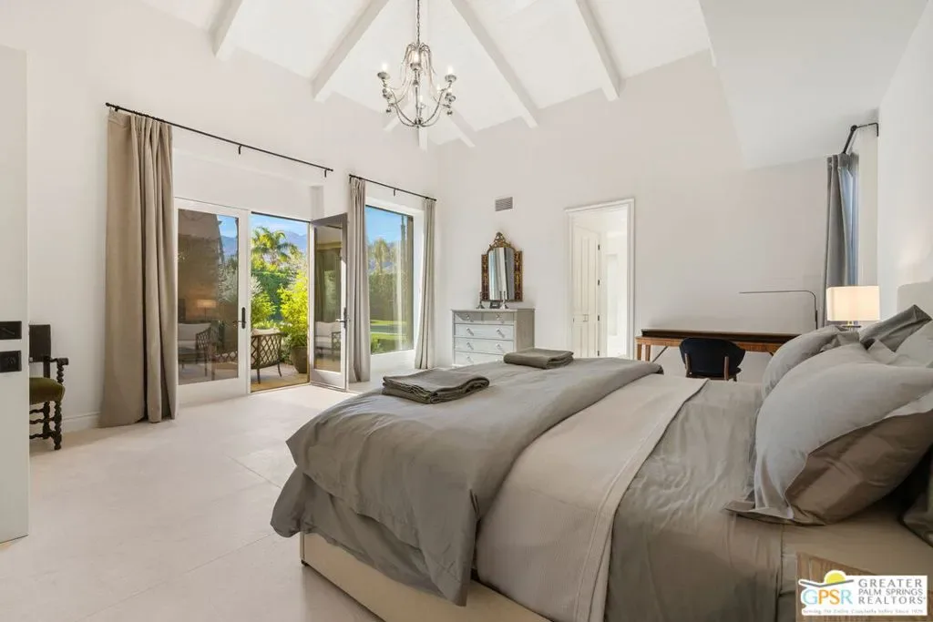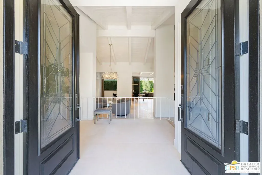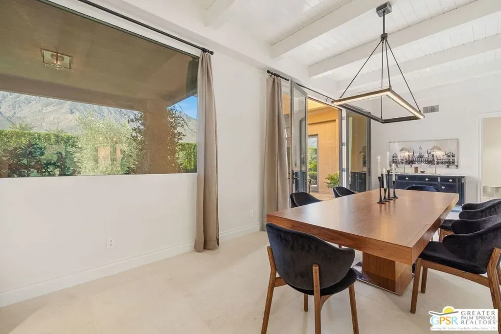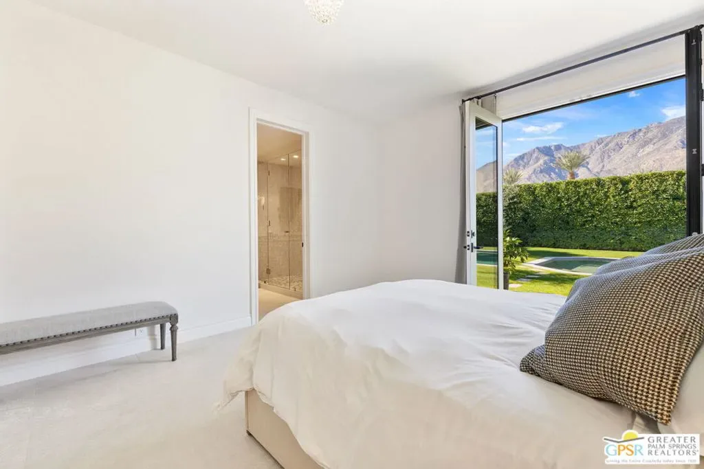 A masterclass in comprehensive NET-ZERO renovation, sustainability, and refined design. This 3-bedroom, 3.5-bath residence delivers true NEXT-GENERATION living in an ULTRA-QUIET South Palm Springs setting. Upgraded from the roof down, this private home offers PEACE OF MIND, performance, and elevated aesthetics rarely found in a single offering. Defined by HIGH CEILINGS, exposed beams, and stunning Turkish limestone floors throughout 100% of the home, EVERY SURFACE and system has been addressed. Upgraded LEVEL-5 SMOOTH WALLS, new casings, and baseboards have been added throughout. 3M Security Film on windows resists breakage with 90% heat reflection and mirrored exteriors that enhance safety, comfort, and privacy. The kitchen includes custom-made wood cabinetry, Brazilian quartzite countertops, Thermador appliances including double ovens with microwave, convection cooking and dehydration settings, induction cooktop, dishwasher, refrigerator, wine refrigerator, and a 5-stage reverse osmosis drinking water system. Bathrooms have been rebuilt with custom-made wood cabinetry, stone counters, glass-enclosed showers with polished nickel Brizo water fixtures. The three ensuite bedrooms all feature custom walk-in build-outs. System upgrades include two 22-SEER heat pump HVAC systems with air scrubbing and UV air purification, two high-efficiency heat pump water heaters, whole-house water filtration and softening. The pool has also been refreshed for efficiency. Home systems are easily operated by mobile device, allowing for the most efficient use of energy while maintaining comfort and peace of mind. The home is 100% solar electric with new owned solar panels and a Tesla battery. Additionally, the gas service and meter have been removed, making operation of the home truly fossil-fuel-free. Dual-type electric vehicle charging stations are included.