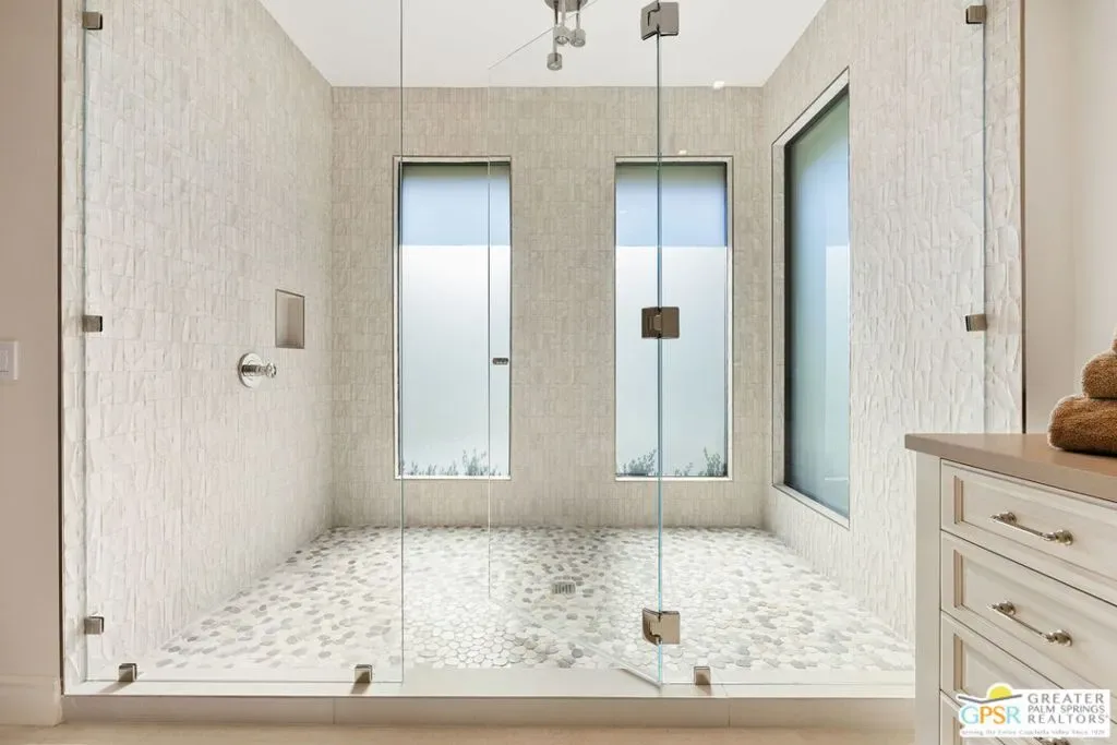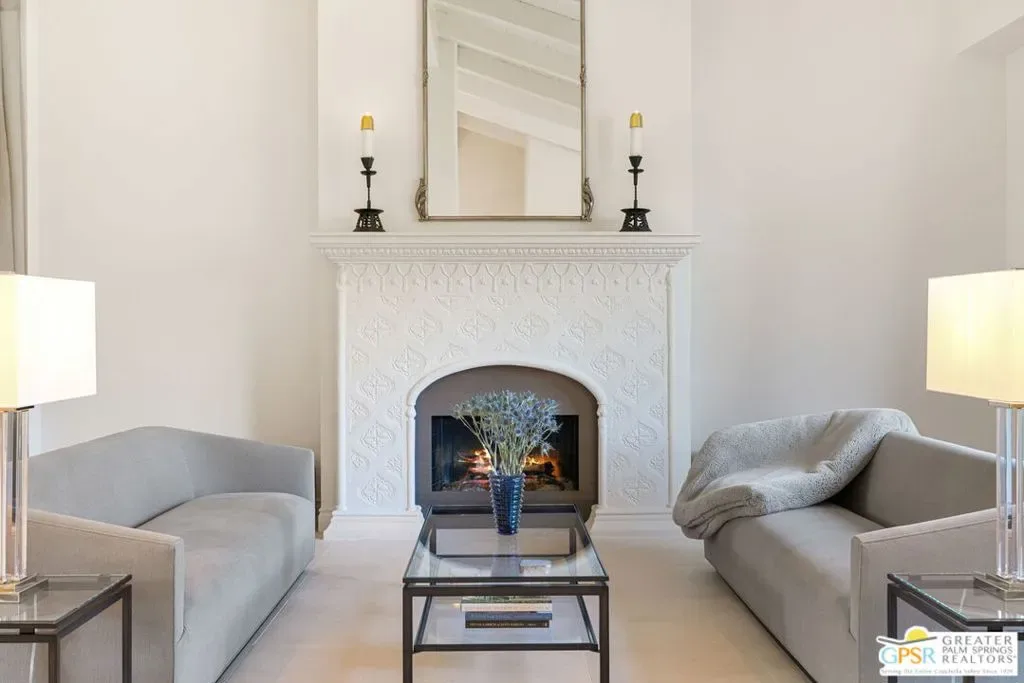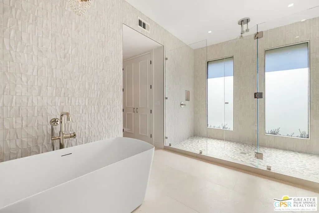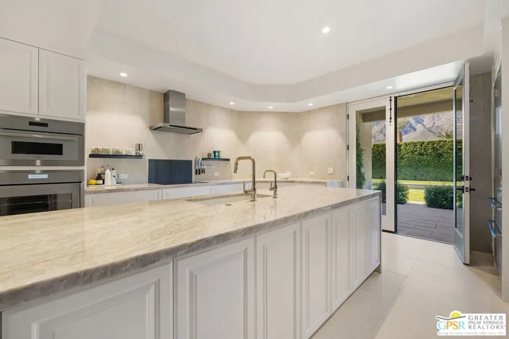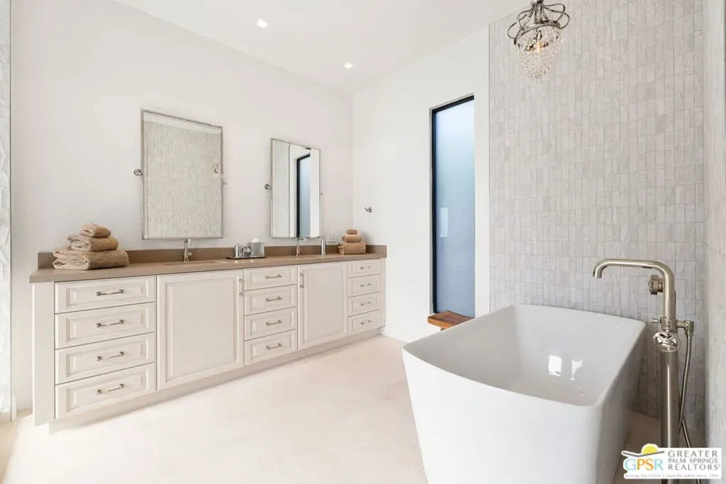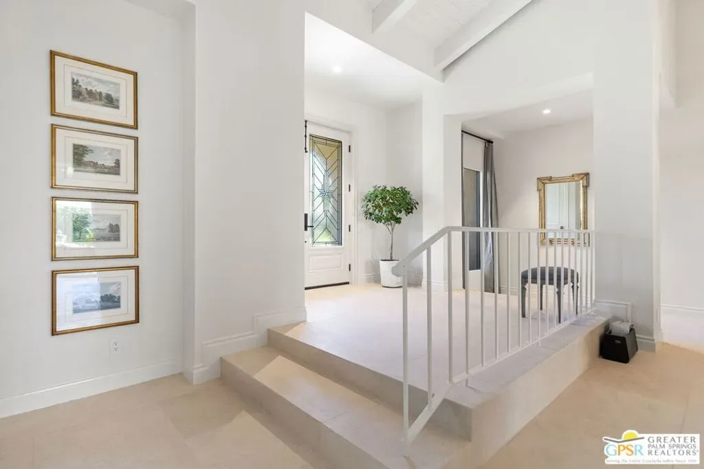 A masterclass in comprehensive NET-ZERO renovation, sustainability, and refined design. This 3-bedroom, 3.5-bath residence delivers true NEXT-GENERATION living in an ULTRA-QUIET South Palm Springs setting. Upgraded from the roof down, this private home offers PEACE OF MIND, performance, and elevated aesthetics rarely found in a single offering. Defined by HIGH CEILINGS, exposed beams, and stunning Turkish limestone floors throughout 100% of the home, EVERY SURFACE and system has been addressed. Upgraded LEVEL-5 SMOOTH WALLS, new casings, and baseboards have been added throughout. 3M Security Film on windows resists breakage with 90% heat reflection and mirrored exteriors that enhance safety, comfort, and privacy. The kitchen includes custom-made wood cabinetry, Brazilian quartzite countertops, Thermador appliances including double ovens with microwave, convection cooking and dehydration settings, induction cooktop, dishwasher, refrigerator, wine refrigerator, and a 5-stage reverse osmosis drinking water system. Bathrooms have been rebuilt with custom-made wood cabinetry, stone counters, glass-enclosed showers with polished nickel Brizo water fixtures. The three ensuite bedrooms all feature custom walk-in build-outs. System upgrades include two 22-SEER heat pump HVAC systems with air scrubbing and UV air purification, two high-efficiency heat pump water heaters, whole-house water filtration and softening. The pool has also been refreshed for efficiency. Home systems are easily operated by mobile device, allowing for the most efficient use of energy while maintaining comfort and peace of mind. The home is 100% solar electric with new owned solar panels and a Tesla battery. Additionally, the gas service and meter have been removed, making operation of the home truly fossil-fuel-free. Dual-type electric vehicle charging stations are included.
