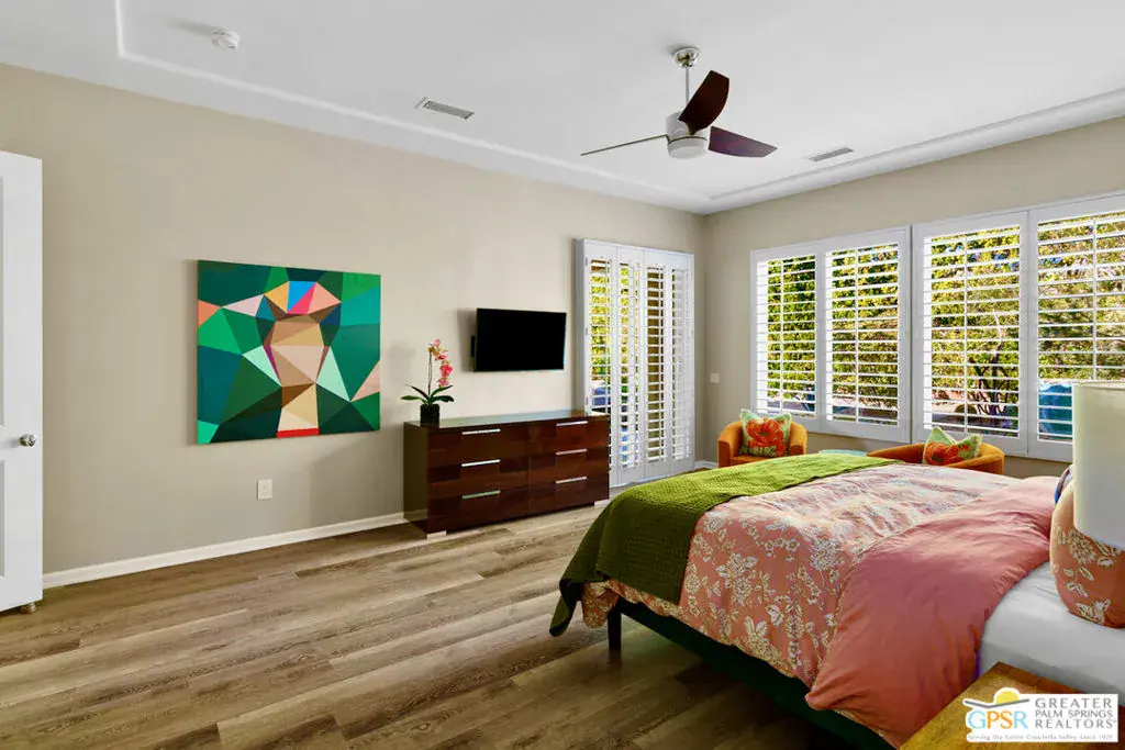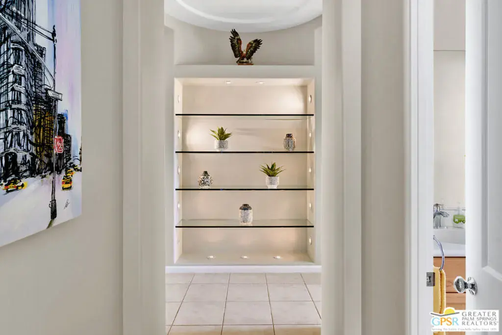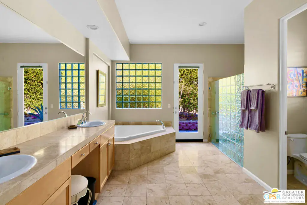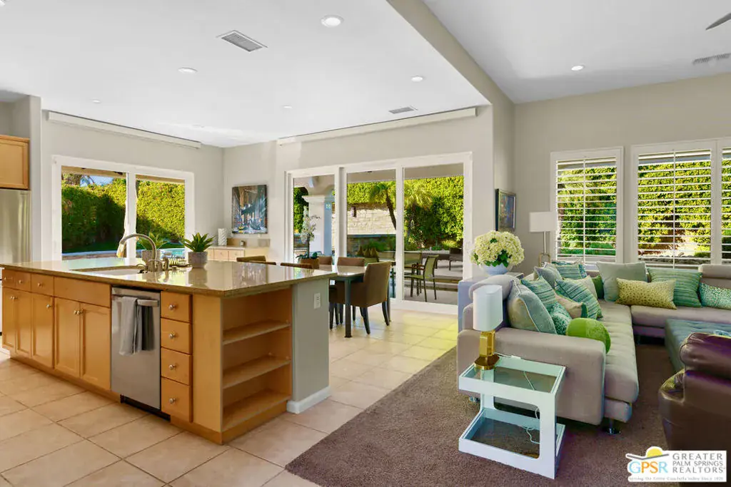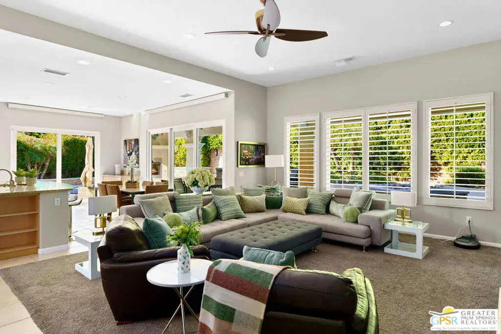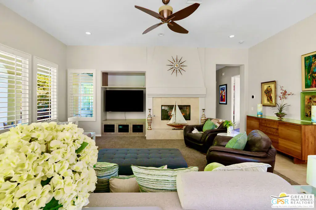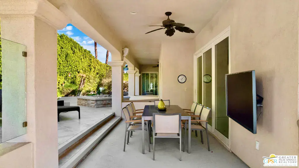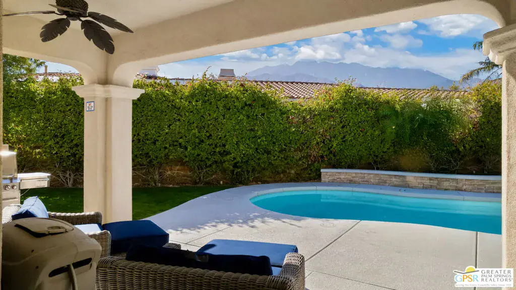Welcome home – where elegance meets tranquility in this graciously proportioned residence nestled on a peaceful cul-de-sac. With westerly mountain views and a professionally designed backyard oasis, this property offers a lifestyle of luxury and comfort. Experience the heart of the home where the living, kitchen, and dining areas blend seamlessly. This spacious open layout is perfect for entertaining, featuring a large kitchen island that serves as a gathering point for family and friends. Cozy up by the elegant living room fireplace as it creates the perfect ambiance for those cool desert evenings. Step out from the great room onto a wrap-around covered patio, ideal for hosting or enjoying quiet evenings under the stars. The outdoor fireplace and raised sitting areas, complete with a firepit, create an inviting atmosphere for year-round entertaining and relaxation. Dive into your very own pool and spa, nestled within a beautifully landscaped and very private backyard. Pet lovers will appreciate the thoughtfully designed doggie doors leading to two fenced outdoor spaces, providing your furry friends with the freedom to roam. Indulge in the expansive master suite, complete with a spa-like bath with dual vanities, soaking tub, and walk-in shower. Enjoy the convenience of patio access where you can step out to your outdoor shower. The beautifully crafted custom walk-in closet ensures that your wardrobe is impeccably organized and easily accessible. Two additional bedrooms and baths round out the interior along with a TV room/Den. Enjoy the ultimate convenience with a short walk to local groceries, gym, restaurants, and coffee. Whether you are entertaining guests or enjoying quiet family evenings, this home is designed for both relaxation and sophistication.