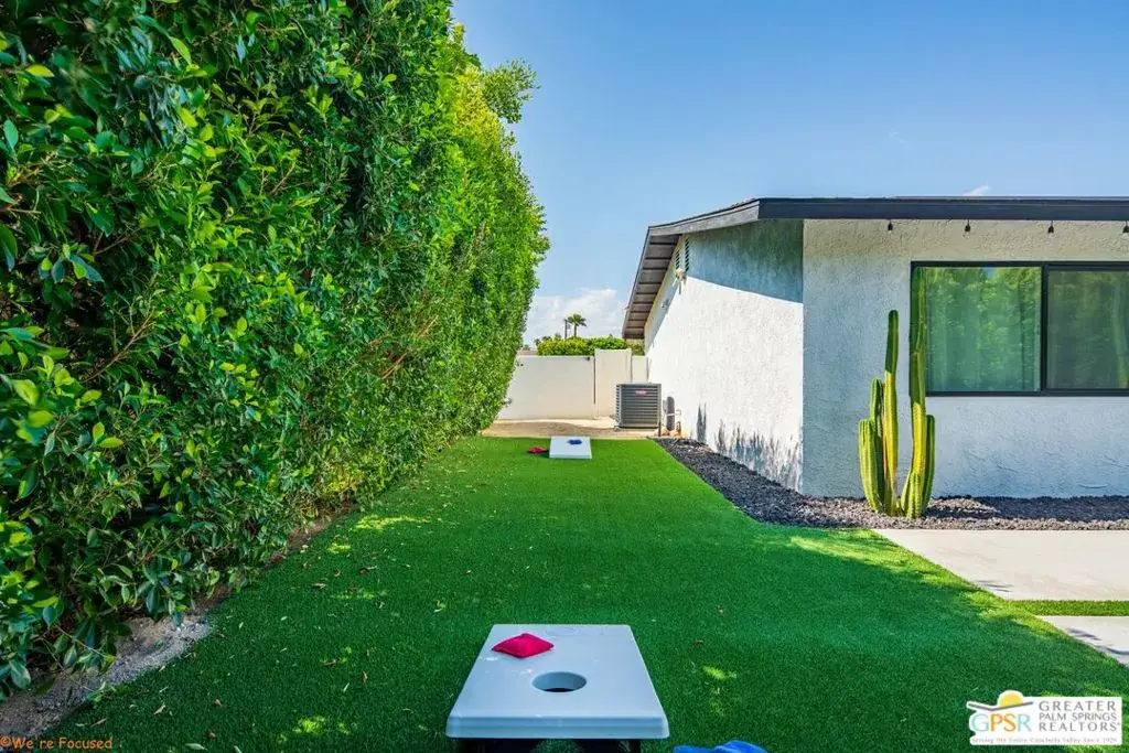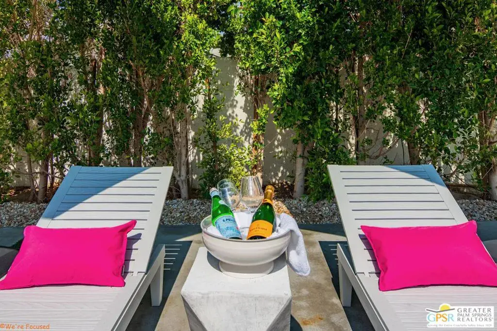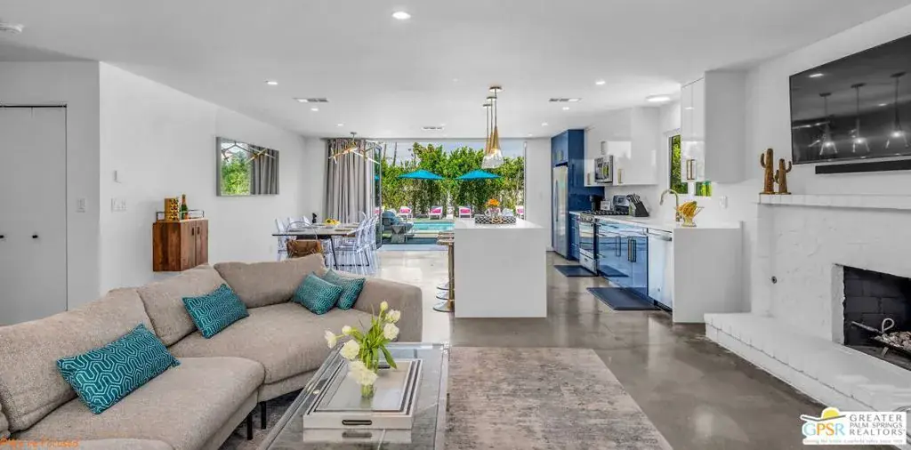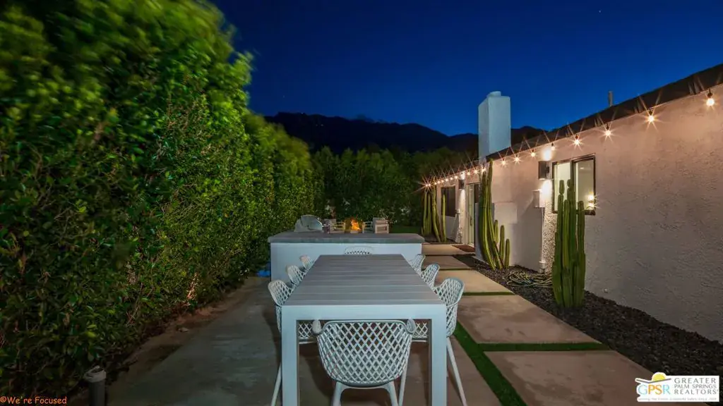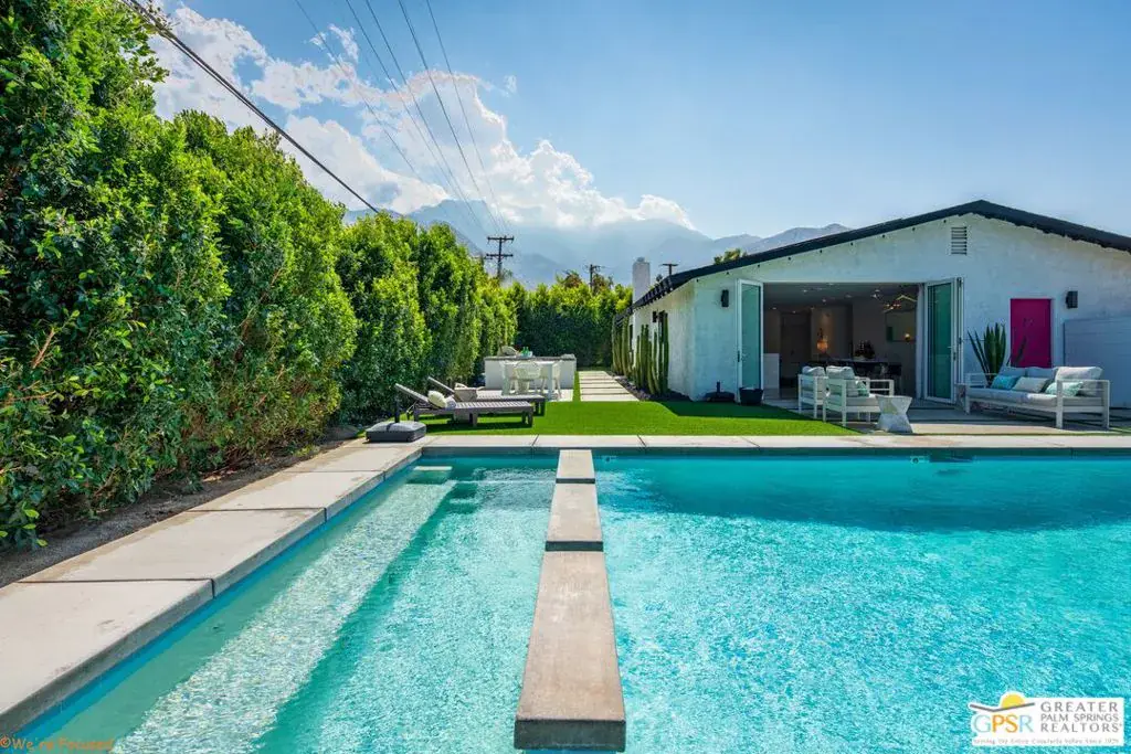 Experience the pinnacle of desert living in this 4-bedroom, 3.5-bath modern oasisa fully reimagined retreat where sophistication meets serenity. Set on a rare double-wide lot, this home is surrounded by over 100 mature ficus trees, creating a lush private sanctuary with unobstructed mountain views. Step outside to a resort-style escape featuring a saltwater pool and spa with baja shelf, a 10-person hot tub, and a firepit beside a turfed play area. Entertain with ease thanks to a built-in BBQ, outdoor dining area, and dedicated pool bath, all enhanced by $150K+ in professional hardscaping and landscaping, sleek block walls, and ample parking pads. Inside, natural light pours through expansive glass doors connecting the living area to the outdoors. The chef’s kitchen boasts quartz counters, stainless steel appliances, and a Carrara marble dining table centerpiece. Modern touches abound: polished concrete floors, floating vanities, and two primary suites with en-suite baths.Offered fully furnished and turnkey, this property has a proven short-term rental history with rave reviews, making it ideal as a luxury investment or personal retreat. Additional upgrades include a new HVAC system, leased solar, and a new Pentair saline system for effortless maintenance.Live or invest in one of Palm Springs’ most desirable neighborhoods where modern elegance, privacy, and income potential unite in one extraordinary property.