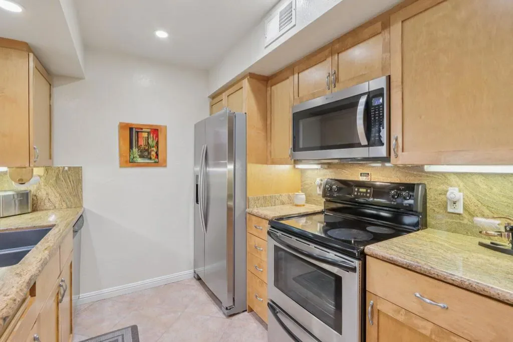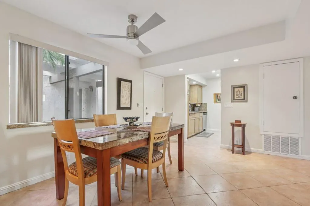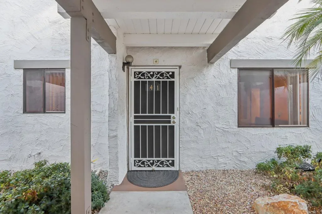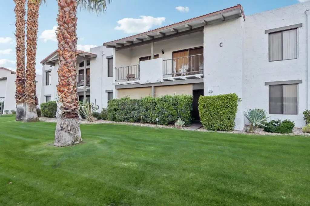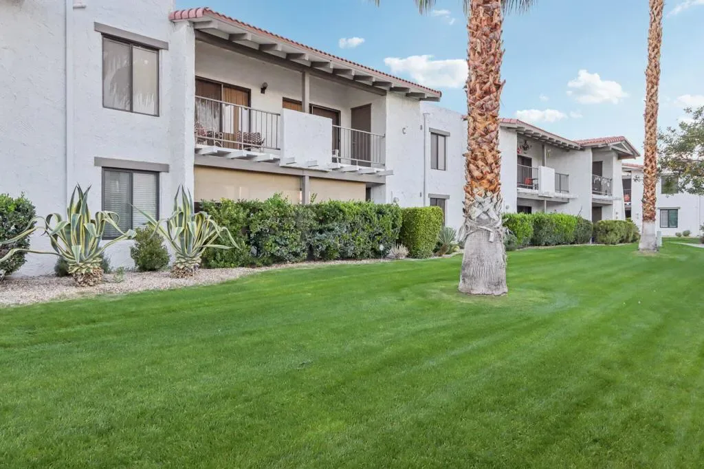 NICELY UPDATED GROUND-LEVEL CONDO NEAR DOWNTOWN PALM SPRINGS. Welcome to this beautifully maintained ground-level condominium, ideally located just a few blocks from vibrant downtown Palm Springs. Designed for comfort and convenience, this home features dual primary suites, each with spacious dressing-room closets and private bathrooms–perfect for hosting family and friends or enjoying flexible living arrangements. The kitchen and bathrooms showcase custom cabinetry and elegant granite countertops, adding both style and functionality. Recent upgrades include fresh interior paint and new carpeting in both bedrooms, creating a clean, well-cared-for ambiance throughout the home. An open-concept living area and the 2nd primary suite both offer sliding glass doors that open to a long private patio, bordered by tall hedges for privacy. The patio is conveniently located just steps from the assigned covered parking space, making everyday living effortless. Located within the desirable Ramon Estados community, residents enjoy resort-style amenities including dual gated entrances, two large swimming pools, multiple tennis and pickleball courts, a clubhouse, gym, laundry facilities, and meeting room. Best of all, this condo is offered fully furnished for immediate enjoyment. Why drive when everything is nearby? Downtown Palm Springs attractions are just to the west, while Sunrise Plaza is only a few blocks east, featuring Ralph’s Grocery, CVS, Starbucks, Subway, Panda Express, Mario’s Italian Cafe, Carl’s Jr., and a Fresh Juice Bar. With its ideal location, thoughtful updates, and outstanding amenities, this attractive condo offers the perfect blend of comfort, convenience, and Palm Springs lifestyle living.