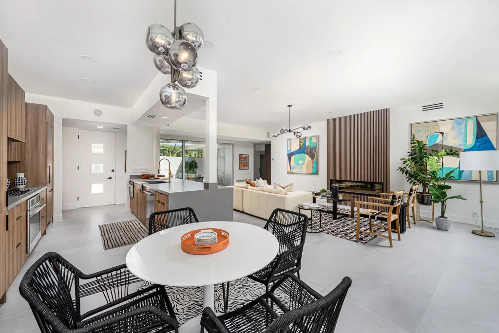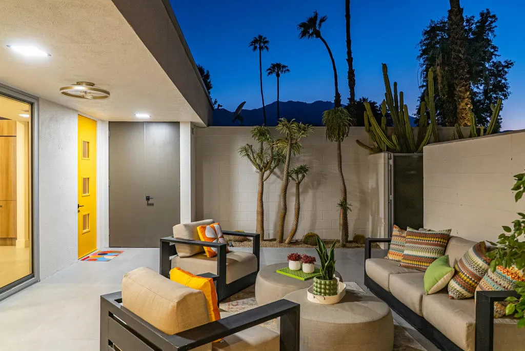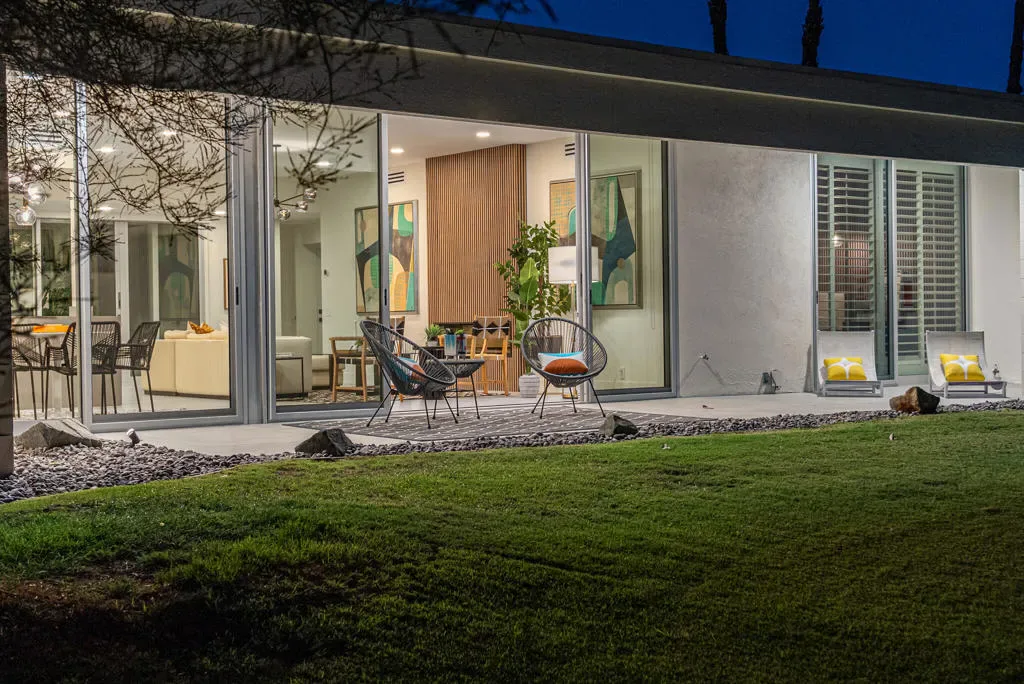 Discover a rare opportunity to own a piece of Palm Springs history with this 2-bedroom, 2-bath home, originally designed in 1967 by renowned architect Richard E. Harrison and redesigned in 2025. Among the first residences built in the iconic Seven Lakes Golf & Country Club, this home combines timeless mid-century modern architecture with thoughtful contemporary updates–all in a serene cul-de-sac setting overlooking the second fairway of the Ted Robinson-designed executive golf course. Inside, you’ll find a light-filled, open layout designed to blur the lines between indoor and outdoor living. The updated kitchen and bathrooms feature sleek finishes, custom cabinetry, and premium appliances, while walls of glass invite natural light and frame striking mountain and golf course views. With a modern living room fireplace, an upgraded electrical panel, owned solar system and double paned sliding doors/windows, this residence offers eco-conscious upgrades that lower your carbon footprint while elevating the home’s comfort and style. The versatile second bedroom can easily serve as a guest suite, home office, or private retreat. Large sliding doors showcase the tranquil courtyard and mountain backdrop, creating a relaxing escape within your own home. Behind the guarded gates of Seven Lakes, residents enjoy access to an array of amenities including a private clubhouse with restaurant and bar, 15 heated pools and spas, tennis and pickleball courts, and the signature Ted Robinson golf course. An assigned carport adds convenience with parking and extra storage. This home embodies the Palm Springs lifestyle–architectural pedigree, modern upgrades, sustainability, and resort-style living in one of the desert’s most sought-after communities.
