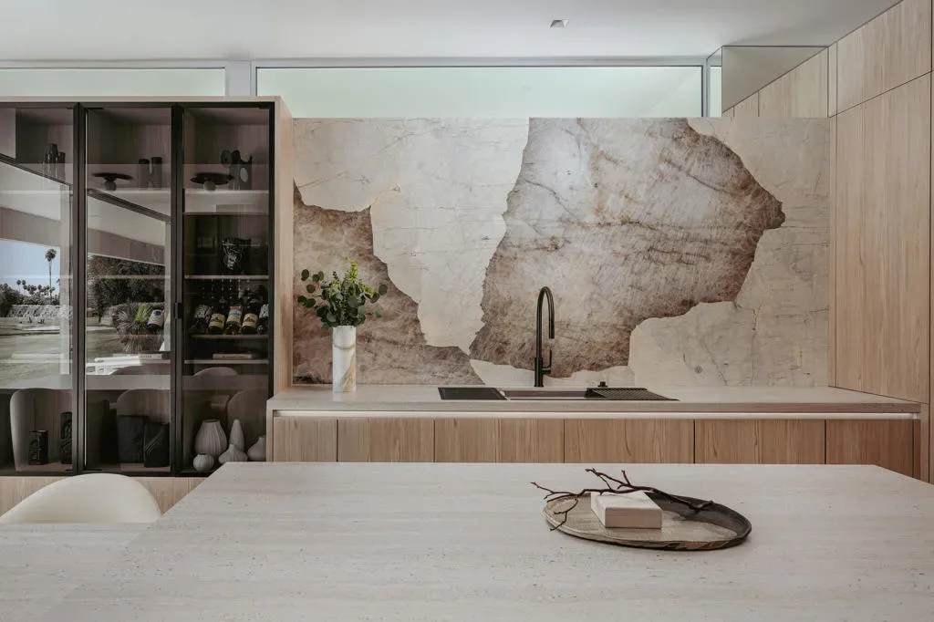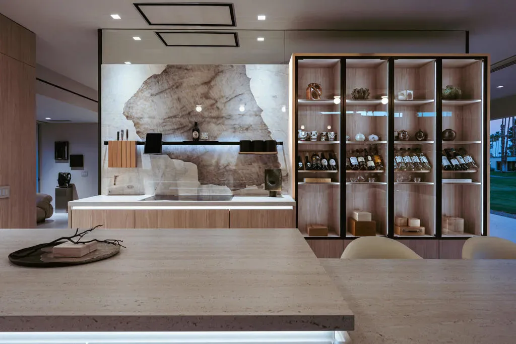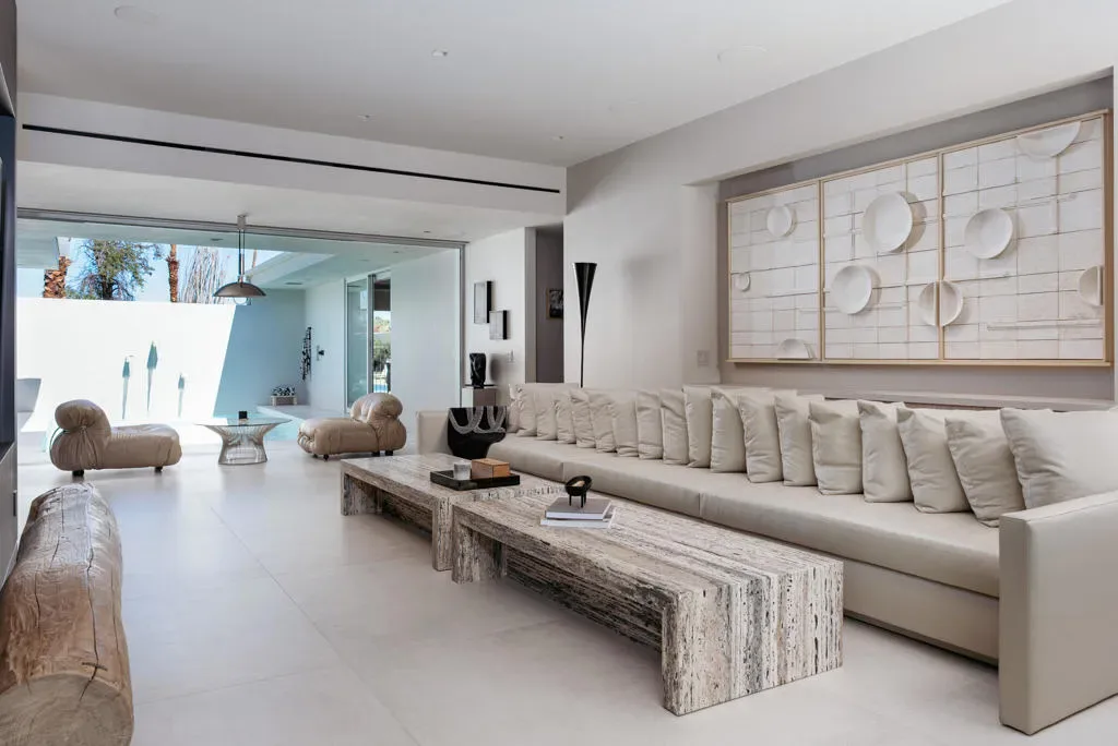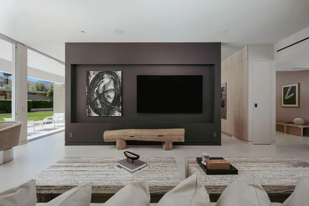 Welcome to 205 Desert Lakes Drive, an exceptional residence in the iconic Seven Lakes Golf & Country Club in South Palm Springs. Originally designed in 1967 by architect Richard E. Harrison, this home has been completely reimagined into a sophisticated 3-bedroom, 3.5-bath modern retreat by designer Andre Boughtwood of ADesignPS.This home has been rebuilt from the studs with an uncompromising commitment to quality, design, and modern luxury. Every element has been thoughtfully curated, creating a seamless blend of mid-century architecture and contemporary refinement.At its center, a custom Leicht kitchen features Gaggenau appliances, a dramatic 4-foot Galley sink, and curated lighting from Design Within Reach, all framed by Brazilian marble slab walls and warm Japanese pine paneling.Expansive pocketing sliders create effortless indoor-outdoor living, opening to a private resort-style setting with the largest private pool in Seven Lakes. The newly constructed 21′ x 11’6” saltwater pool, finished in glass bead PebbleTec, includes tranquil fountains and an outdoor shower–perfect for relaxation and entertaining.The thoughtfully redesigned layout offers three private bedroom suites, each with its own spa-inspired bath featuring Leicht cabinetry, travertine sinks, and Toto toilets. The primary suite is a true sanctuary, complete with a Mr. Steam steam shower and aromatherapy system.Refined finishes include Level 5 smooth drywall, shadow-reveal detailing, Soss-hinged doors, and Italian 48×48 porcelain tile flowing seamlessly throughout. A custom ceramic installation by local artist Jim Abele is a delightful centerpiece of the main living area.Behind the scenes, all systems have been upgraded, including plumbing, sewer, electrical, HVAC, and dual-pane Monumental windows and sliders. Smart features include Lutron lighting, in-ceiling Sonos audio, and a Navien tankless water heater.The exterior boasts over $30,000 in curated landscape and hardscape improvements, including a Japanese-inspired patio and dedicated golf cart parking with charging.Located behind a 24-hour guard gate, near the Parker Hotel, Seven Lakes–known as ”The Gem of the Desert”–offers an 18-hole Ted Robinson-designed golf course, 15 pools and spas, pickleball and tennis courts, and a vibrant William Cody-designed clubhouse with dining, lounge, and terrace.