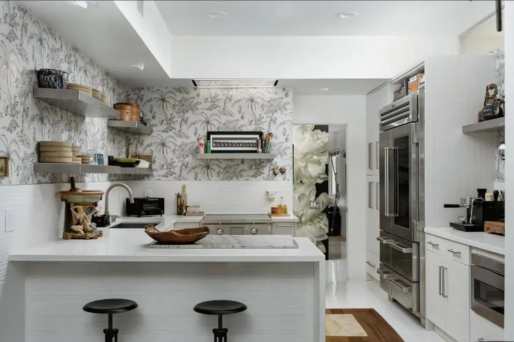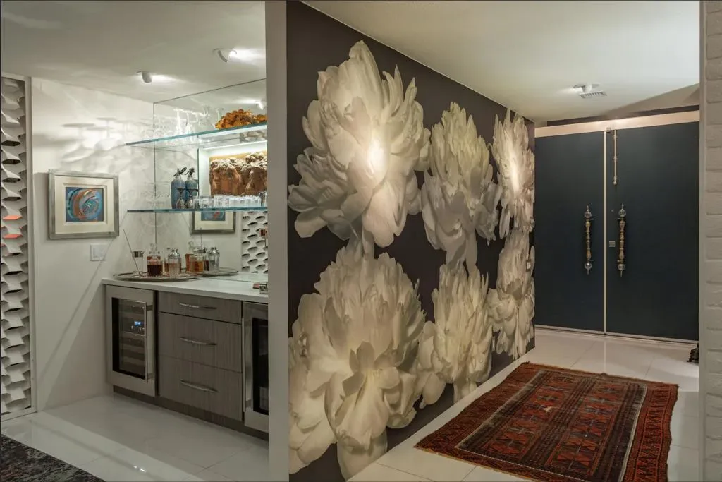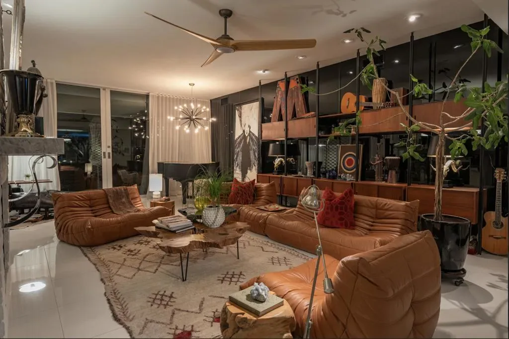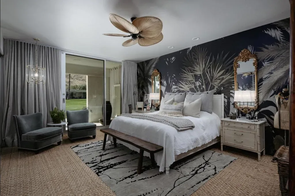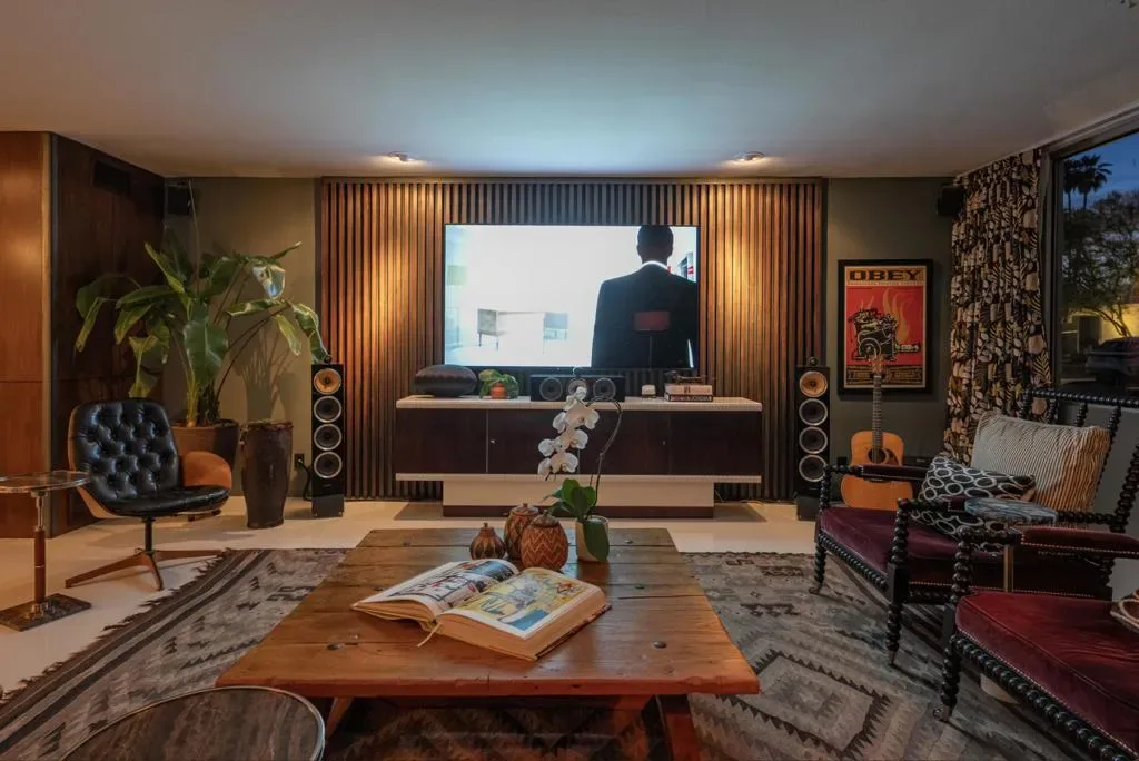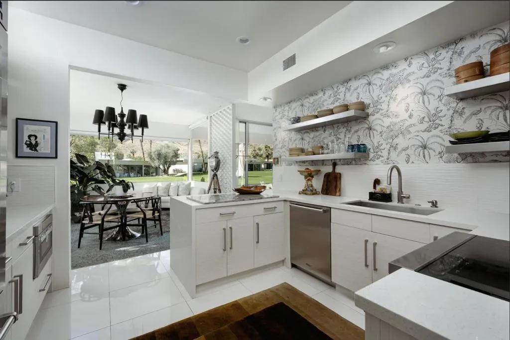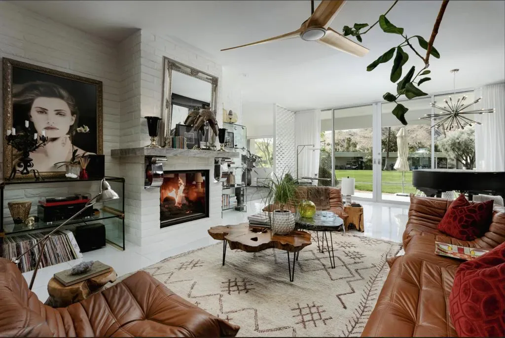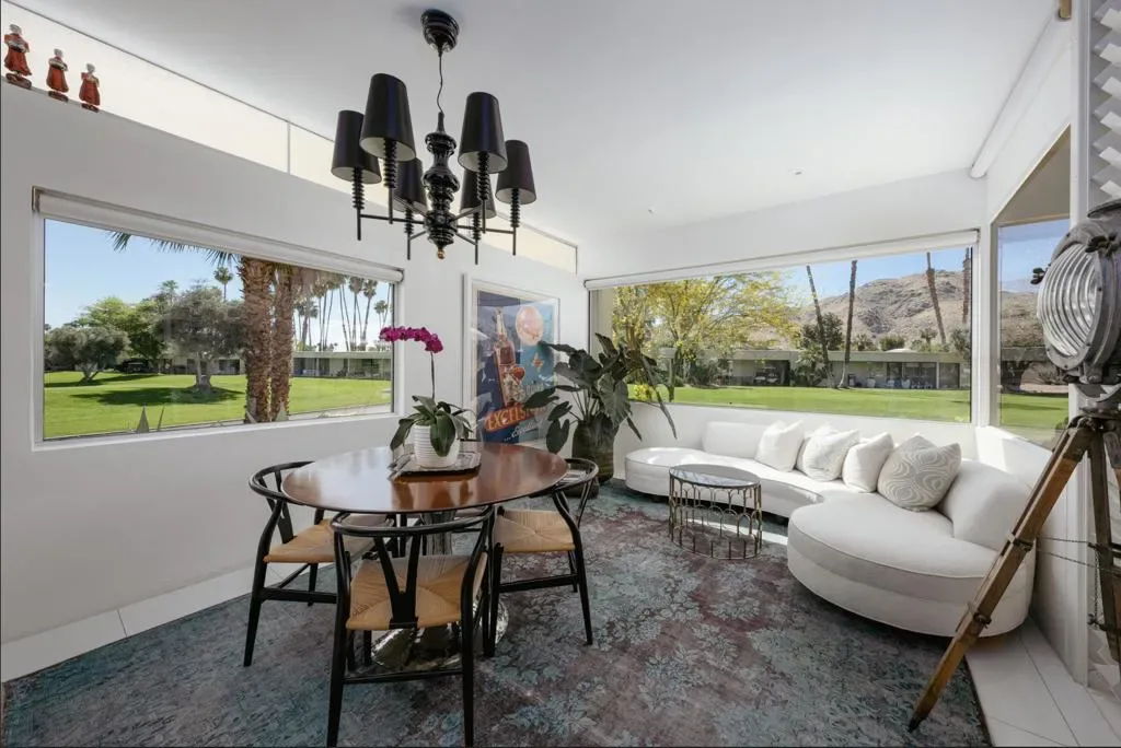 Perched on an elevated site with sweeping views across the 10th and 11th fairways toward the prestigious Southridge estates, this exceptional 3-bedroom, 3-bath expanded residence offers one of the largest and most desirable floor-plans within Seven Lakes Golf & Country Club.Blending iconic mid-century modern design with refined contemporary finishes, the home impresses from the moment you enter. The living room, anchored by a bespoke fireplace, opens to lush green vistas and a private leisure terrace finished in handmade terrazzo tile–perfect for elevated indoor-outdoor living.The European-style kitchen features quartz countertops, a striated tile backsplash, and top-tier appliances including a Sub-Zero 48 refrigerator, Wolf induction range, and Cove dishwasher, complemented by a sunlit breakfast room, perfect for casual dining or a work from home space. Designed for effortless entertaining, the expanded layout includes a custom built-in bar and a striking media lounge with a dramatic Japanese Yakisugi wood accent wall. Privately tucked away, the bedroom wing offers a tranquil retreat, highlighted by a luxurious primary suite with custom jute carpeting and a spa-like bath finished in Italian white marble, complete with a rain shower and Victoria + Albert soaking tub. A versatile secondary bedroom with a Murphy bed adds flexibility for guests or a refined den space.Thoughtfully upgraded throughout, the home includes owned solar, EV charging, updated roof and electrical, dual-pane Fleetwood sliders, a Trane HVAC system, whole-house water filtration with de-ionization and an instant hot water system.A private garage completes this perfect picture. Centrally located, this Richard Harrison-designed villa is just a short stroll to the iconic William Cody clubhouse, offering fine dining, a vibrant social scene, views of the signature fountain and the Ted Robinson designed 18 hole golf course. Within Seven Lakes’ 24-hour guard-gated community, you can enjoy the ease of living with complete peace of mind–making this an ideal full-time residence or effortless desert retreat.
