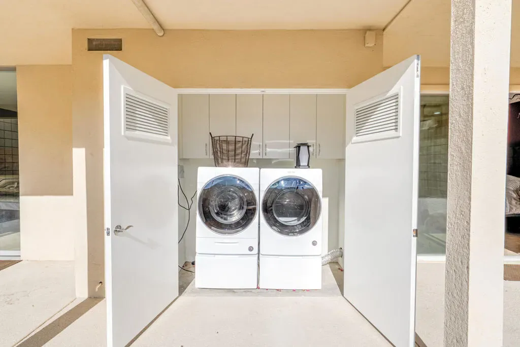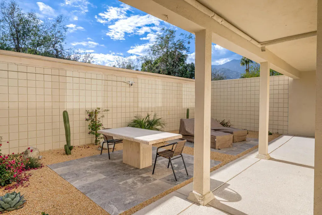 Experience the ultimate Palm Springs getaway in this stunning Mid-Century Modern retreat, beautifully renovated and originally designed by renowned architect Richard Harrison. This sophisticated 2-bedroom, 2-bath ground-level residence blends iconic mid-century architecture with modern luxury, creating the perfect desert escape with convenient single-level living and easy access throughout the home. The residence has been thoughtfully upgraded with high-end finishes and designer furnishings throughout. The stylish living room is designed for relaxation and entertainment, featuring a 98-inch television with cinema-style seating, creating a true in-home theater experience. A grand piano adds an elegant focal point to the open living space, while the chef’s kitchen is fully equipped for cooking and entertaining.Both the primary and guest bedrooms feature king-size beds, offering exceptional comfort and a peaceful retreat after a day enjoying the Palm Springs sunshine. Carefully curated design elements enhance the home’s luxurious yet relaxed mid-century aesthetic.Located within an exclusive guard-gated golf community, guests enjoy access to the Ted Robinson-designed golf course, clubhouse amenities, and beautifully maintained grounds, all just minutes from the renowned dining, shopping, and entertainment of downtown Palm Springs. This exceptional property offers the perfect blend of iconic design, comfort, and resort-style living for an unforgettable stay in Palm Springs.