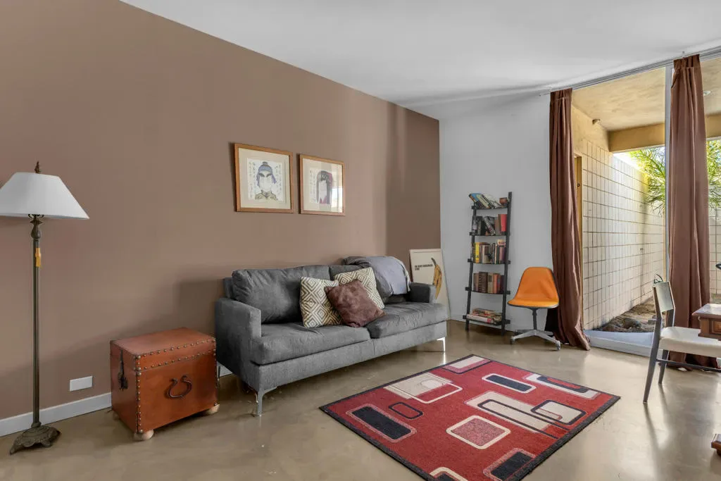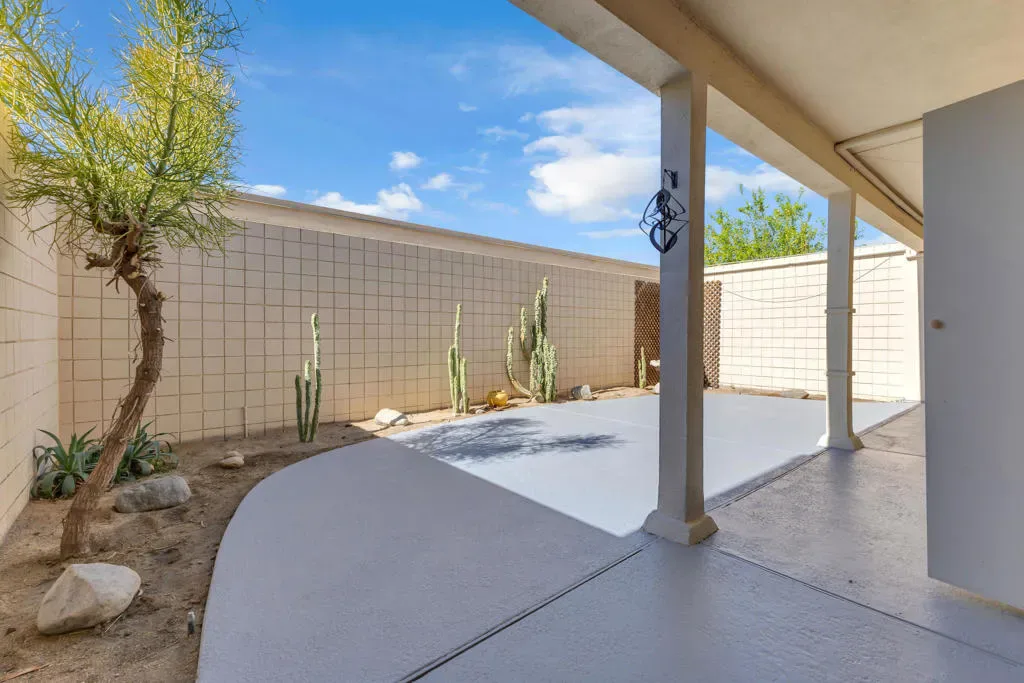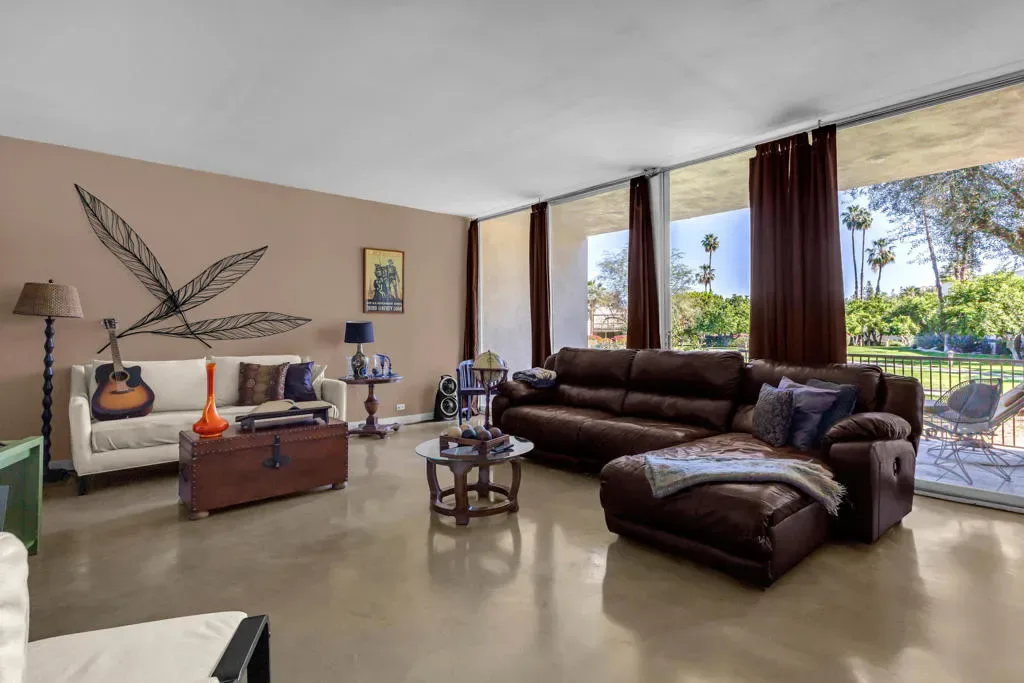 Located inside the prestigious 24-hour guard-gated Seven Lakes Golf and Country Club, this spacious 2 bedroom, 2 bath lower-level condominium offers classic Palm Springs living within one of the city’s most celebrated mid-century communities. With 1,778 square feet of open living space, the home features 10 foot ceilings and dramatic floor-to-ceiling walls of glass that fill the interior with natural light and create a seamless connection to the outdoors. The generous living and dining areas are ideal for entertaining and include a wet bar, breakfast bar, dining chandelier, and ample seating space.The kitchen retains its original mid-century cabinetry, complemented by a newer electric range and built-in microwave, blending classic design with everyday functionality. Both bedrooms offer excellent storage with large mirrored and walk-in closets. A private courtyard patio with side-by-side washer and dryer enjoys beautiful western exposure and stunning views of the San Jacinto Mountains, providing the perfect setting for relaxing desert evenings. Additional highlights include ceramic tile, wall-to-wall carpeting, and a rare private two-car garage.Seven Lakes spans more than 128 acres of beautifully landscaped grounds and offers a Ted Robinson-designed executive golf course, 15 pools and spas, tennis courts, putting greens, mature fruit trees, and the iconic William Cody-designed clubhouse featuring a restaurant, bar, and pro shop. This home offers a wonderful opportunity to enjoy the timeless architecture, resort-style amenities, and vibrant lifestyle that make Seven Lakes one of Palm Springs’ most desirable communities.