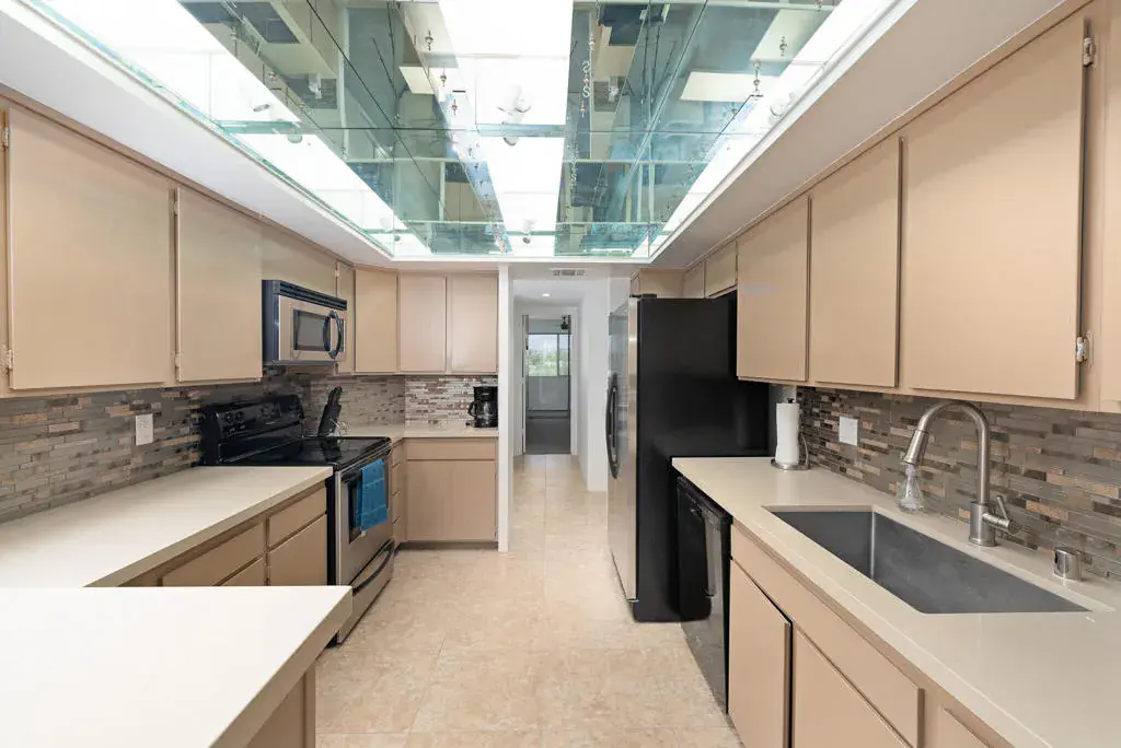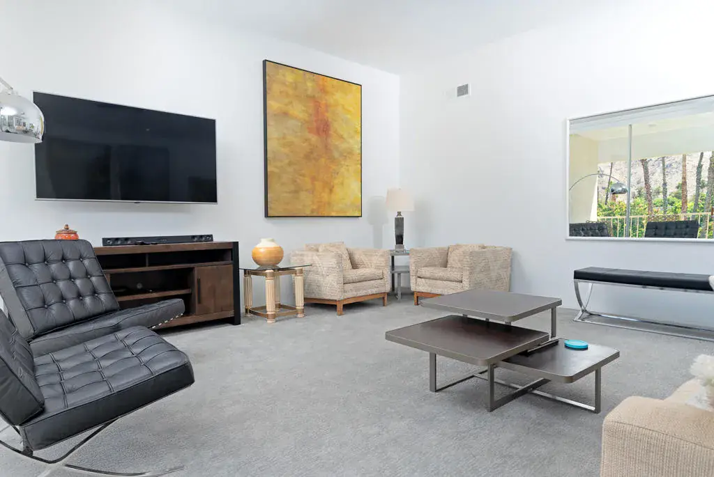 Set against iconic Palm Springs vistas, this top-floor, turn-key, fully furnished, 2 BD/2 BA, residence is located within the prestigious Seven Lakes Golf & Country Club–often celebrated as the ”Gem of the Desert.” Overlooking the community’s largest pool and spa, the home offers a front-row seat to resort living, with weekly water aerobics just steps away, as well as convenient access to the nearby tennis and pickleball courts. Built in 1972 and situated in the most recently developed phase of Seven Lakes, Phase 9, the residence is filled with natural light and architectural character. Ten-foot ceilings, skylights throughout, generous walk-in closets, and sweeping panoramic mountain views in all directions create a sense of openness and serenity. A private two-car garage, new HVAC system, modern, renovated bathrooms, along with dual-pane windows along the expansive rear terrace–spanning the full length of the home–add comfort and modern efficiency. Residents enjoy access to 15 heated pools and spas, an 18-hole Ted Robinson-designed golf course framed by dramatic mountain scenery, full-size tennis and pickleball courts, and the iconic William Cody-designed clubhouse, a storied gathering place for dignitaries and Hollywood legends alike. Seven Lakes offers 24-hour guard-gated security, an on-site HOA office, and electric vehicle charging, delivering a refined desert lifestyle with exceptional amenities.