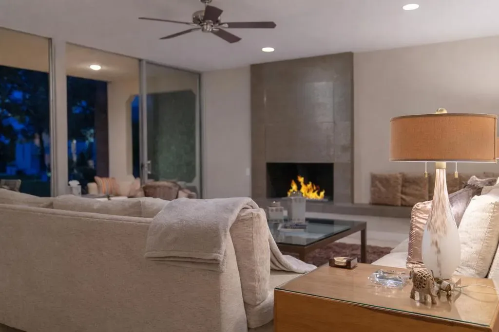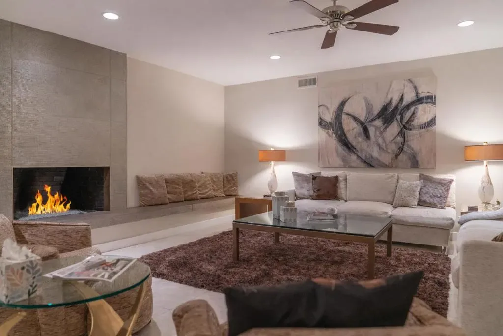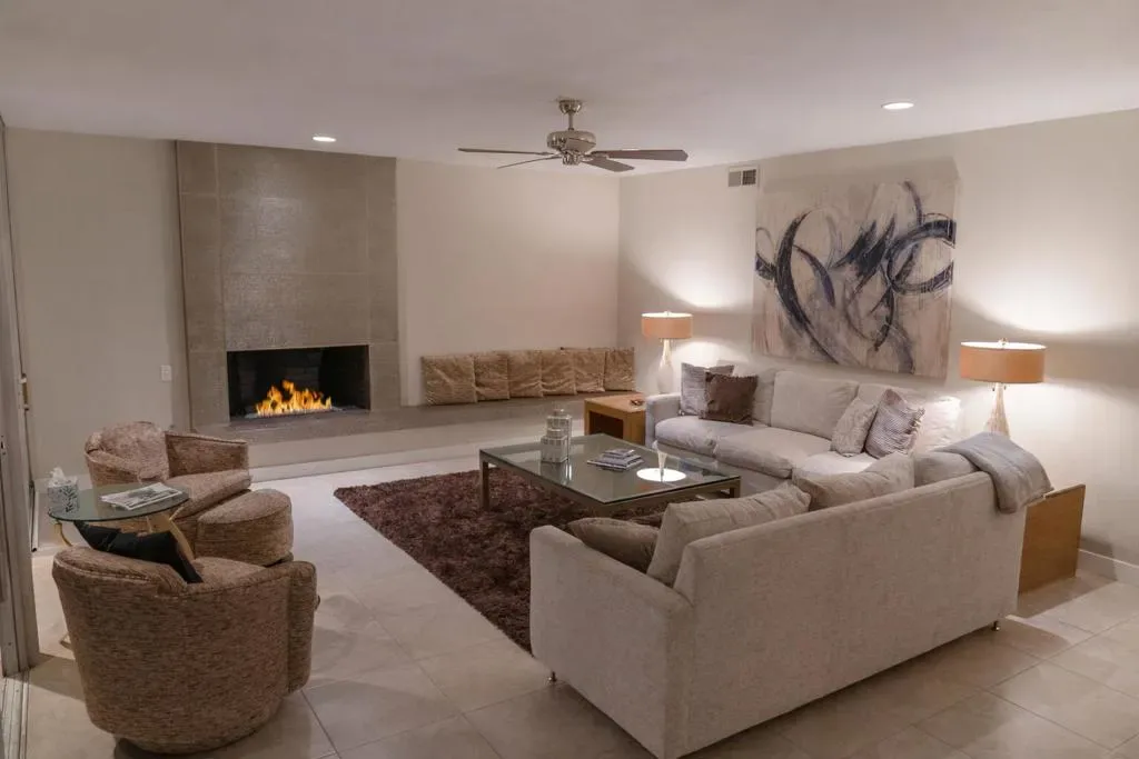 Expansive Double-Fairway Living at Seven Lakes Golf and Country Club!Enjoy sweeping, linear views this downstairs, corner 2-bedroom, 3-bath residence featuring a rare and highly desirable floor plan. Thoughtfully remodeled by a respected local designer, the home blends classic mid-century architecture with refined modern updates. Spanning approximately 2,276 sq ft, the home offers generous room sizes, high ceilings, and walls of floor-to-ceiling glass that frame expansive panoramic golf course views. The large living room is anchored by a custom fireplace, creating a warm focal point for entertaining or relaxing, while seamlessly connecting to the surrounding outdoor spaces.The home features three private outdoor areas, including a large, walled private courtyard ideal for al fresco dining or lounging, plus two private terraces overlooking the fairway, perfect for morning coffee or sunset gatherings.The remodeled kitchen showcases dual-tone cabinetry, stainless steel appliances, and wraparound quartz countertops, flowing into an expansive dining area designed for hosting with ease. Additional highlights include a private one-car garage, excellent separation of spaces, and abundant natural light throughout.Originally designed by noted architect Richard Harrison, this exceptional residence is just steps from the community’s largest swimming pool and spa, as well as the pickleball and tennis courts, offering true resort-style living.Seven Lakes is a low-density, social, 24-hour guard-gated community renowned for its amenities, including 15 seasonally heated pools and spas, pickleball and tennis court, electric car charging stations, and a striking clubhouse designed by William Cody with soaring ceilings, a private restaurant and bar, and a superb chef. Golf enthusiasts will appreciate the Ted Robinson-designed course–by Ted Robinson–famously associated with Dwight D. Eisenhower’s hole-in-one.A rare opportunity to own a move-in-ready, architecturally significant home with a fireplace-centered living room, expansive views, and exceptional indoor-outdoor living in one of Palm Springs’ most iconic communities.
