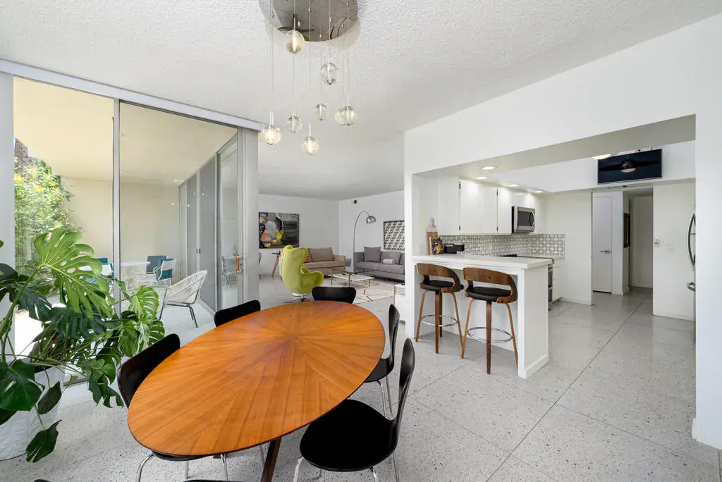 Set within the architecturally significant community of Seven Lakes Golf & Country Club in South Palm Springs, 519 Desert Lakes Drive is a rare offering. Designed in 1972 by architect Richard E. Harrison, this south facing mountain residence features one of the community’s most uncommon floor plans–seldom available and highly sought after. This residence could be a wonderful weekend pied-a-terre–or a full-time statement–in one of Palm Springs’ most legendary communities.This downstairs home offers the ease of single-level living along with a private one-car garage, a true luxury in Seven Lakes. Thoughtfully renovated, this architect owned home showcases high ceilings and dramatic floor-to-ceiling glass, creating a seamless connection between indoors and out while flooding the space with natural light.The home opens directly to the golf course, overlooking the 13th hole, famously known as the site of President Dwight D. Eisenhower’s only hole-in-one. The view is expansive yet tranquil, and the property’s location within a quiet enclave of the community ensures exceptional peace and privacy.A large, private courtyard provides an additional outdoor living space–ideal for entertaining, relaxing, or enjoying the desert climate in complete seclusion.With a proven and successful rental history, this property offers flexibility as an income-producing investment, a stylish desert retreat, or a wonderful full-time residence for those who appreciate midcentury architecture, golf course living, and the timeless appeal of Seven Lakes.An exceptional opportunity to own a distinctive piece of Palm Springs architectural history. The Seven Lakes Golf & Country Club community also known as the ‘Gem of the Desert’ situated along the Ted Robinson designed golf course. Community amenities include: 24-hour guard at gate, 15 pools/spas all heated at season, pickleball court, onsite HOA and sales office, electric car charging stations and famous William Cody designed clubhouse with restaurant/bar.