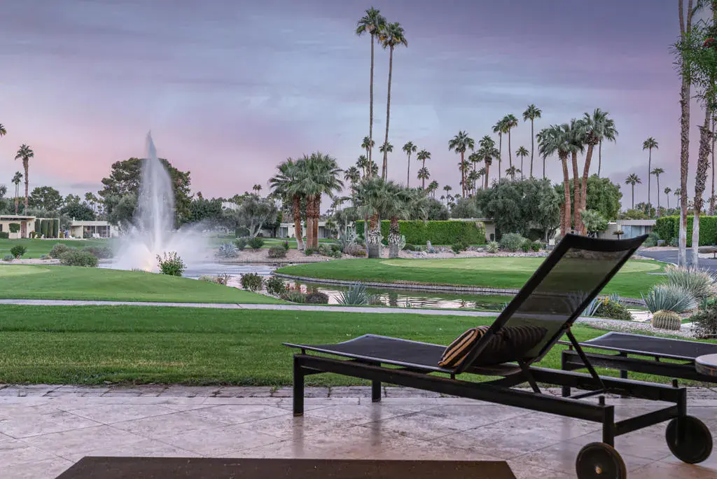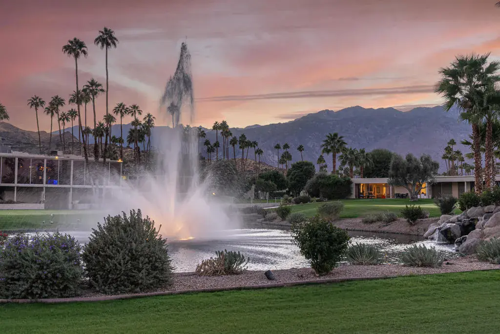 Welcome to this exceptional two-bedroom + den home, the original model home for the prestigious Seven Lakes Golf & Country Club community, established in 1967. Situated on a highly coveted cul-de-sac, this rare gem boasts direct, panoramic views of the iconic Seven Lakes fountain, with vistas extending over three lush fairways and serene lakes.Designed for ultimate indoor-outdoor living, the home’s open-concept floor plan is accentuated by soaring ceilings and expansive floor-to-ceiling glass sliding doors, providing seamless access to the outdoors and breathtaking views. The updated kitchen and bathrooms blend modern finishes with the home’s timeless mid-century character, offering both style and functionality. A newly replaced main waterline was completed this year, adding long-term value and peace of mind. The home’s spacious private courtyard is perfect for entertaining or enjoying morning coffee, while the tranquil cul-de-sac setting ensures privacy and serenity. Just a short stroll away, the historic William Cody-designed clubhouse offers an unmatched social and recreational experience. Additional features include a private one-car garage and a prime location within this exclusive, gated golf community. This home offers the very best of desert living, seamlessly combining mid-century elegance with the allure of a premier golf and country club lifestyle.