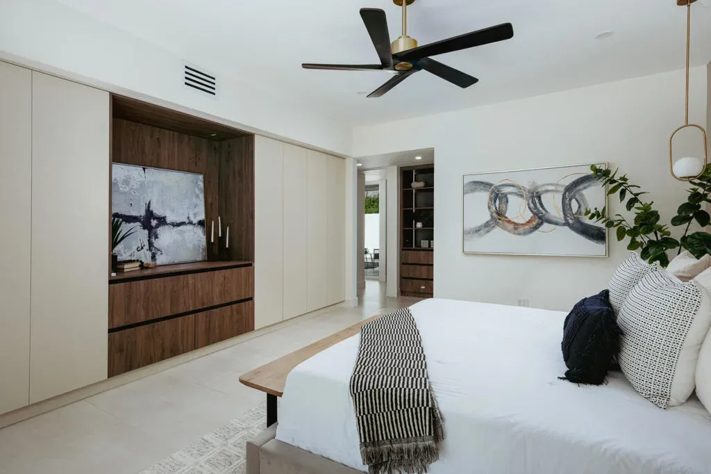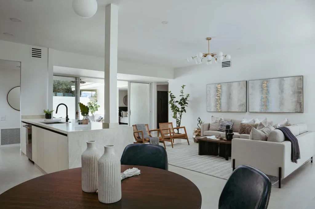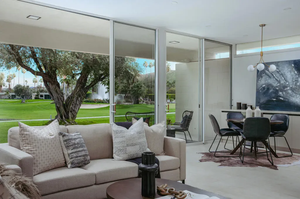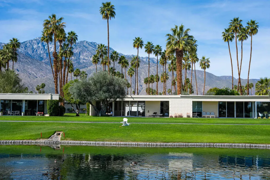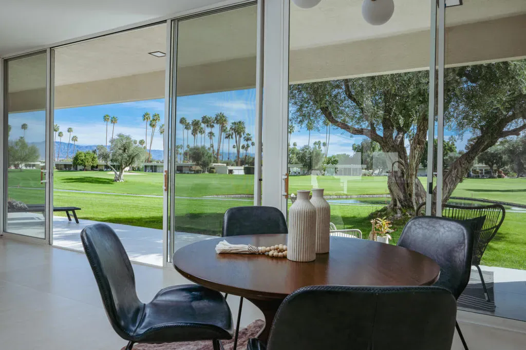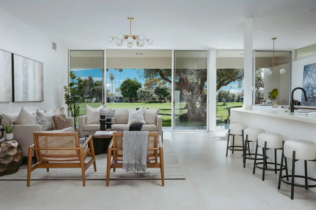 Welcome to 83 Westlake Circle, a stunning Richard A. Harrison-designed residence ideally situated on a quiet cul-de-sac within the coveted Seven Lakes Country Club. Perfectly positioned on the 18th green, the expansive terrace captures sweeping views across a double fairway, the 7th lake, and the community’s iconic waterfall fountain — a truly breathtaking setting.Completed in 2026, the exquisite renovation reimagines the home into a sophisticated 1,545-square-foot open-concept floor plan featuring two generous bedroom suites and beautifully appointed baths. Soaring ceilings and walls of glass create an effortless indoor-outdoor flow, to a spacious and private courtyard framed by panoramic views of Southridge and the San Jacinto Mountains.Designed for both comfort and convenience, the residence includes a newer HVAC system, an assigned garage parking, and immediate access to a serene pool and spa just steps away.Beyond the 24-hour guarded gates, Seven Lakes — known as ”The Gem of the Desert” — offers an elevated lifestyle centered around its Ted Robinson-designed 18-hole executive golf course. Residents enjoy 15 pools and spas with pool houses, tennis courts, and the iconic William Cody-designed clubhouse featuring formal dining, a casual cocktail lounge, and a scenic terrace overlooking the waterfall fountain.This is quintessential Palm Springs living — architecturally significant, impeccably renovated, and surrounded by extraordinary views.