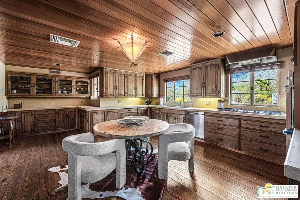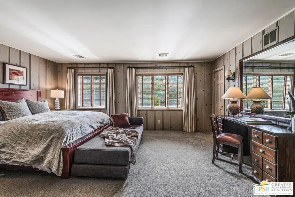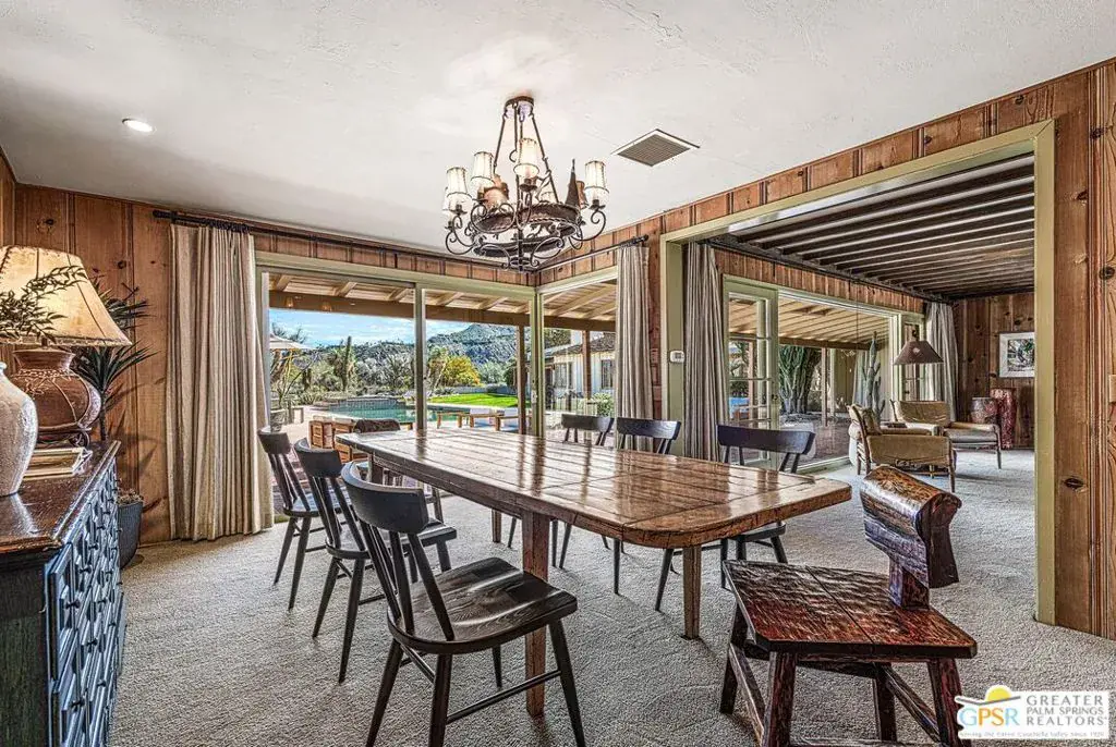 Step back in time at the Blankenhorn-Gilmore Residence, the foundational private estate of Smoke Tree Ranch and a unanimously designated Class 1 Historic Resource. Built in 1930 by master architect Garrett Van Pelt Jr. and sensitively expanded by the iconic Albert Frey, this 5-bedroom, 7-bathroom sanctuary served as the architectural blueprint for the entire enclave. Set on 1.88 deeded acres across three lots plus an exclusive view lot, the 5,504-square-foot home perfectly captures the “Romance of the Old West” with its signature Ranch-style horizontality and board-and-batten exterior. The interiors are a masterclass in rustic sophistication, featuring dramatic exposed-beam ceilings, natural wood-paneled walls, and a massive floor-to-ceiling red brick fireplace. Wooden casement windows frame unobstructed, panoramic mountain views and lead to a private backyard oasis complete with a rectangular pool and integrated spa. This is a rare opportunity to steward a piece of Palm Springs history once owned by the Ranch’s principal developer, L. Mac Blankenhorn, offering a level of pedigree and privacy that is simply unmatched.
