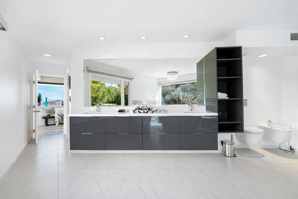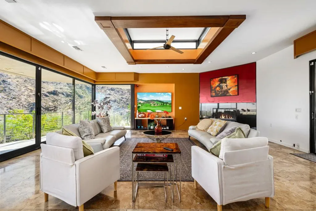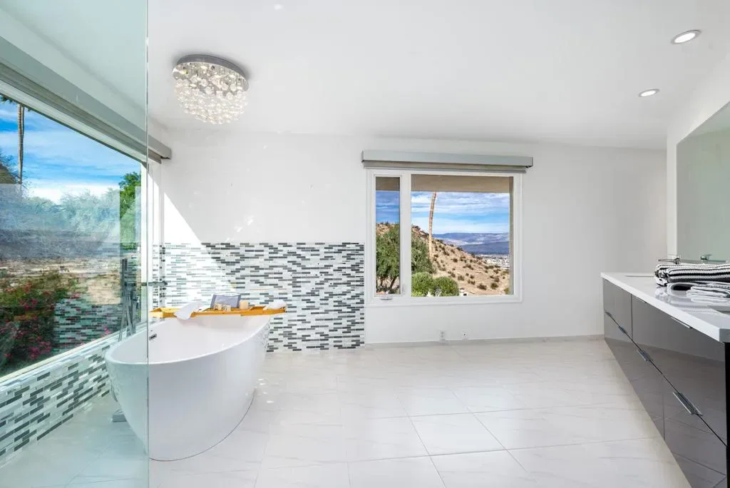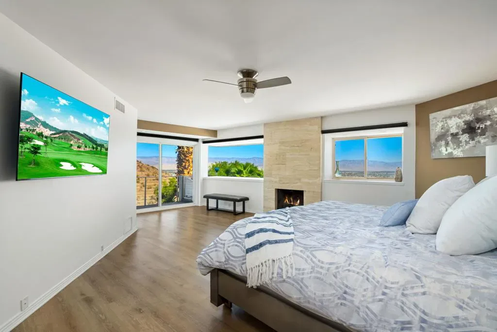Motivated Seller! Price improvement of another 300K!Breathtaking 270-degree views from this spectacular home in famous Southridge, an exclusive gated 22-home community nestled in the mountains and known for its long history of celebrity-owned homes, including those of Bob Hope, Steve McQueen, William Holden, Suzanne Somers, and the Elrod House, to name a few. This updated Mid-Century Modern home offers 270-degree views, including the Valley Floor from Palm Springs to the Salton Sea. The home offers five ensuite bedrooms, a powder room, and boasts a bright and open floor plan, extreme privacy, a quality pool/spa, a large patio with a built-in barbecue, and a private fire pit on the SW corner of this estate-sized lot. There’s an additional private spa on the east side of the patio, offering the same spectacular Coachella Valley views and city lights at night. The perfectly appointed Chef’s kitchen, floor-to-ceiling glass walls, ceiling fans, wet bar, electric blinds throughout, and the second workout room (converted from a 3rd garage stall) all make this home special. The second level offers one primary bedroom with a fireplace, a recently updated bathroom, a walk-in shower, a standalone soaking tub, a large walk-in closet, sliders to your private deck, and a separate lock-off office. An additional upstairs ensuite bedroom/exercise room has its Private ‘Zen ‘ deck. Downstairs, you will find one more Primary Suite and two other En-Suite bedrooms, plus a powder room for your guests. Furnished per writtenInventory. Easy to show on short notice. You can contact either of the Listing Agents for a showing. Rick Parnell 360-280-4178 or Mark Brack at 760-515-7215. The Listing agent must accompany all showings. It is an exclusive neighborhood, and all visitors need to be accompanied by the listing agent.