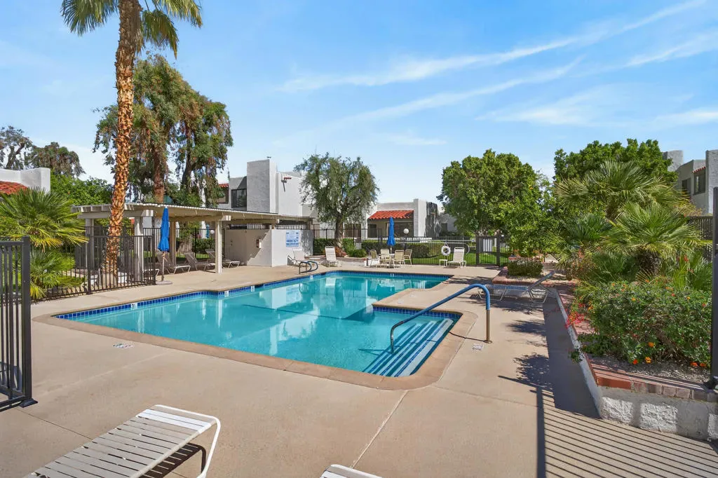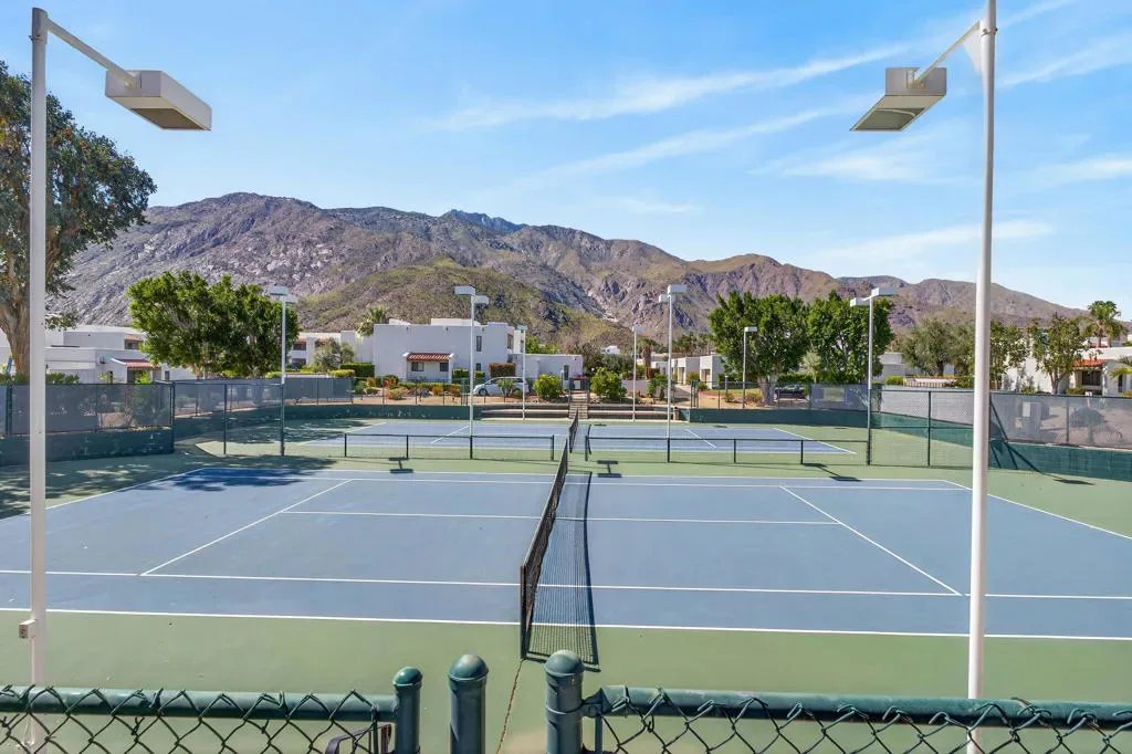 Repriced to reflect this dynamic market! The brand-new kitchen has been thoughtfully redesigned with new cabinetry, Corian countertops, stainless steel appliances, a breakfast nook, and new tile flooring, combining modern style with everyday functionality. Resort-Style Living at St. Tropez VillasExperience the best of Palm Springs living in this beautifully updated townhouse-style residence located in the gated community of St. Tropez Villas, just minutes from vibrant downtown Palm Springs. This spacious 2-bedroom, 2.5-bath home offers the perfect blend of privacy, comfort, and resort-style amenities.A private courtyard entry welcomes you into a light-filled foyer that opens to a dramatic sunken living room with a custom fireplace, creating a warm and inviting space for relaxing or entertaining. Expansive sliding doors lead to a private patio overlooking a lush greenbelt adjacent to one of the community pools, delivering seamless indoor-outdoor desert living.Upstairs, two spacious primary suites each enjoy their own private balcony. One captures tranquil mountain views, while the other overlooks the sparkling resort-style pool. Both suites offer en-suite bathrooms, including one with a soaking tub and separate shower, creating a peaceful retreat at the end of the day.St. Tropez Villas is known for its beautifully maintained grounds and exceptional amenities including four pools, four spas, lighted tennis courts, gated access, guest parking, and mature citrus trees throughout the community. HOA dues include cable, high-speed internet, trash, sewer, and exterior maintenance for easy lock-and-leave living. The land lease is extended to 2068.Ideally located within walking distance to downtown Palm Springs dining, shopping, galleries, and entertainment, this home offers an exceptional opportunity to enjoy the Palm Springs lifestyle in one of the area’s most desirable communities.