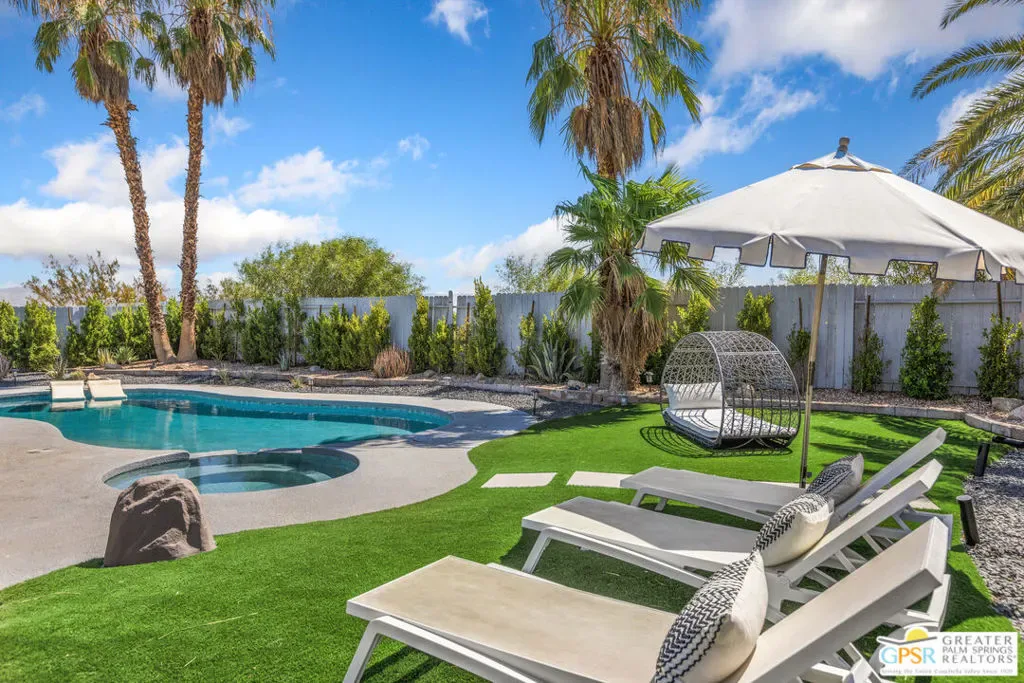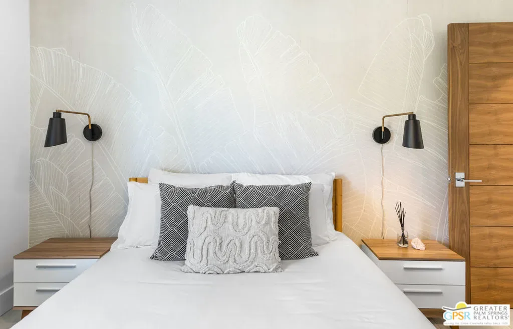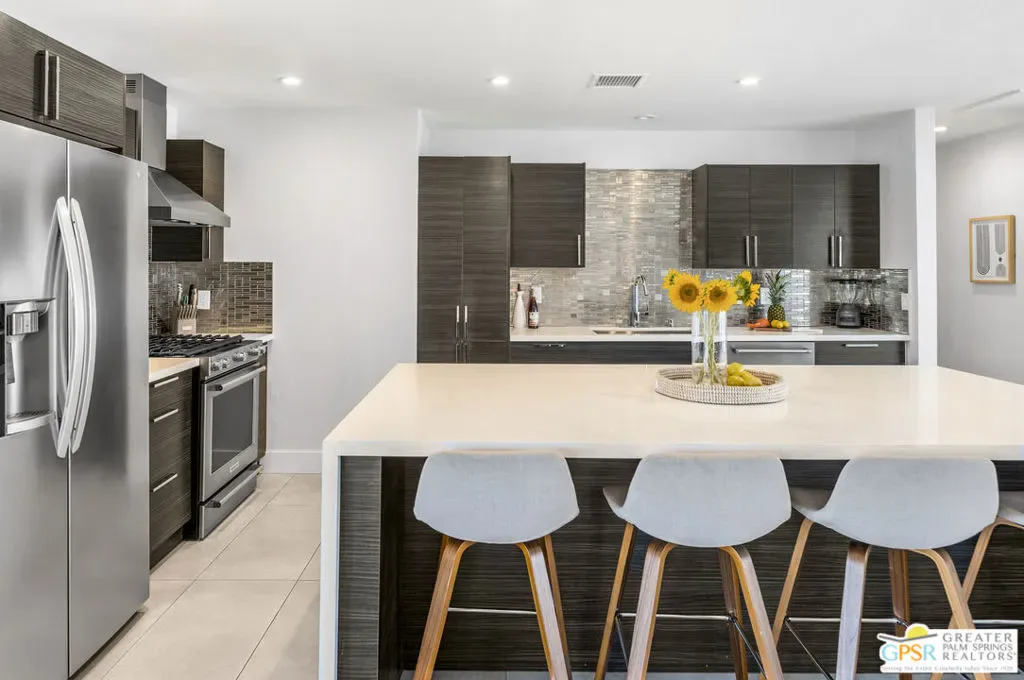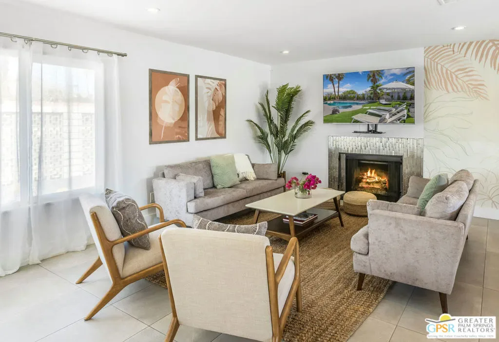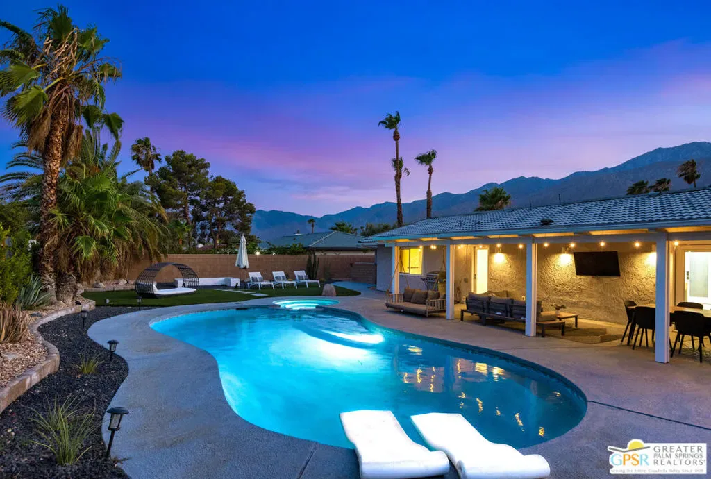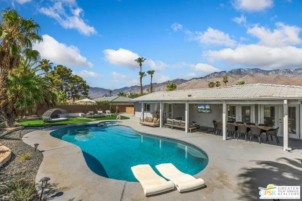 Welcome to the Palm Springs lifestyle, where endless desert skies meet California Cool. Whether you dream of a full-time residence or a successful vacation investment, this stylishly updated, move-in-ready home is perfectly positioned in a central location, just minutes from the downtown Design District, shopping, and award-winning dining. Step inside a flowing, open-concept space designed for effortless entertaining. The chef’s kitchen is the heart of the home, featuring stainless steel appliances and an oversized 8-foot quartz waterfall edge island ideal for culinary creations and casual gatherings. Sleek 17×35 tile flooring throughout provides a seamless cohesive aesthetic. The Primary Suite boasts a custom Elfa closet system, en-suite bathroom with an over-sized walk-in tiled shower and convenient access to the beautiful backyard. Enjoy spectacular sunsets and unobstructed west mountain views from the front patio, screened by a mid-century breeze-block wall, while the backyard is your true resort experience, featuring a pebble-tec pool with integrated spa and a spacious covered patio perfect for year-round relaxation. Currently a successful Airbnb, this property offers an immediate return. Plus, you’ll enjoy lower energy costs thanks to the low-monthly leased solar system. Situated on a cul-de-sac with no power lines in sight. Your turnkey oasis awaits, simply bring your suit and dive into the good life!