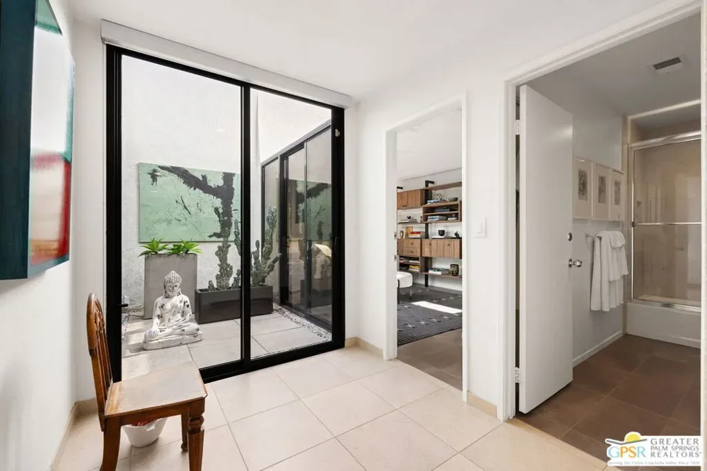 RARE to market. DESIGNER done. BIG views. The San Jacinto Mountains take center stage poolside at this reimagined residence within Sundance Resort, a low density collection of just 60 homes where every residence enjoys its own private pool and spa. Short Term Rental friendly on Fee land (you own it). Originally developed in the early 1980s by Clint Murchison Jr. as a private weekend retreat for the Dallas Cowboy football team players and their families, the setting today remains quietly special with expansive greenbelts, tennis, clubhouse, fitness spaces, and dog friendly walking paths, all thoughtfully arranged across two distinct enclaves for added privacy. This residence has been taken to the next level with a comprehensive renovation by its current owner, followed by a 2025 landscape refresh with all new lighting and irrigation across both front and rear patios. Inside, the living room makes an immediate impression with vaulted ceilings and a fireplace, while also being dialed in for entertaining with a built in bar, beverage cooler, and bar sink, all opening beautifully to the outdoors. The kitchen features custom European cabinetry finished in white melamine along with a premium appliance suite including KitchenAid Chef Series appliances and a Bosch dishwasher, while Hansgrohe fixtures bring a refined, modern edge throughout. A breakfast bar connects seamlessly with both indoor and outdoor dining areas, all positioned just off the kitchen for easy everyday living and entertaining. The design story continues into the baths with the same elevated cabinetry and finishes. The primary suite opens to the private saltwater pool with mountain views and features a double vanity and custom built ins. There is also a nicely integrated office alcove, adding flexibility for work or creative space. The guest bedroom is currently enjoyed as a den with its adjacent full bath. Fleetwood glass and slider doors enhance the seamless indoor outdoor flow and the atrium is a definite focal point, creating that desert lifestyle this home delivers so well. A private backyard gate opens directly to one of the community’s expansive greenbelts, making outdoor living and dog walks especially enjoyable. HOA dues cover earthquake insurance, roofing, exterior maintenance and paint, water, waste, and landscaping, making for an easy lock and leave option in one of the desert’s more unique communities.